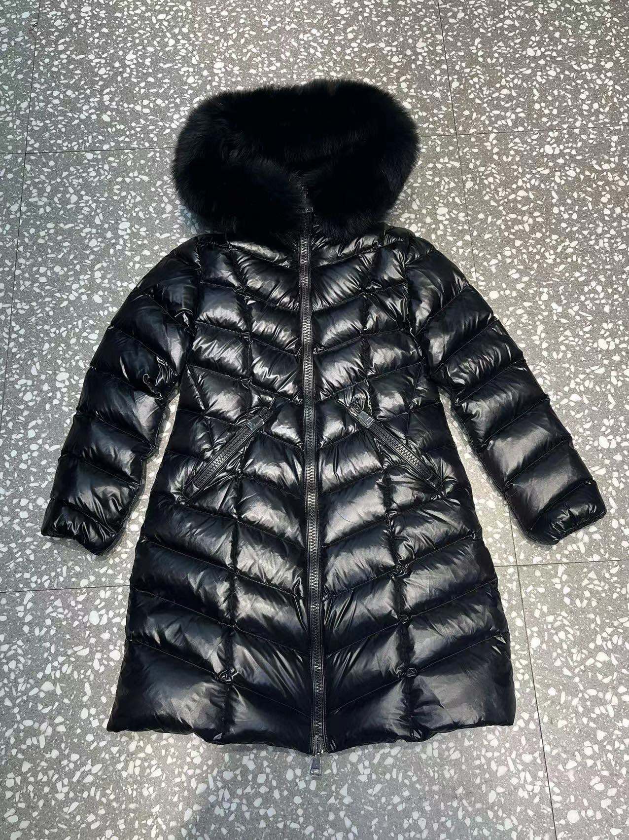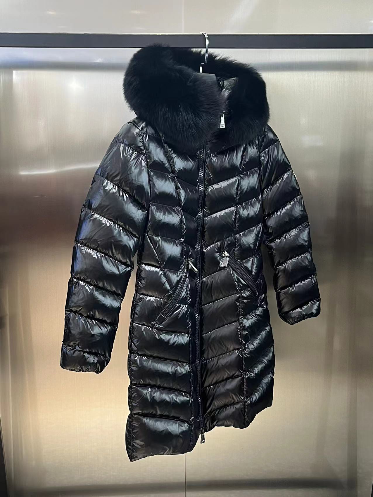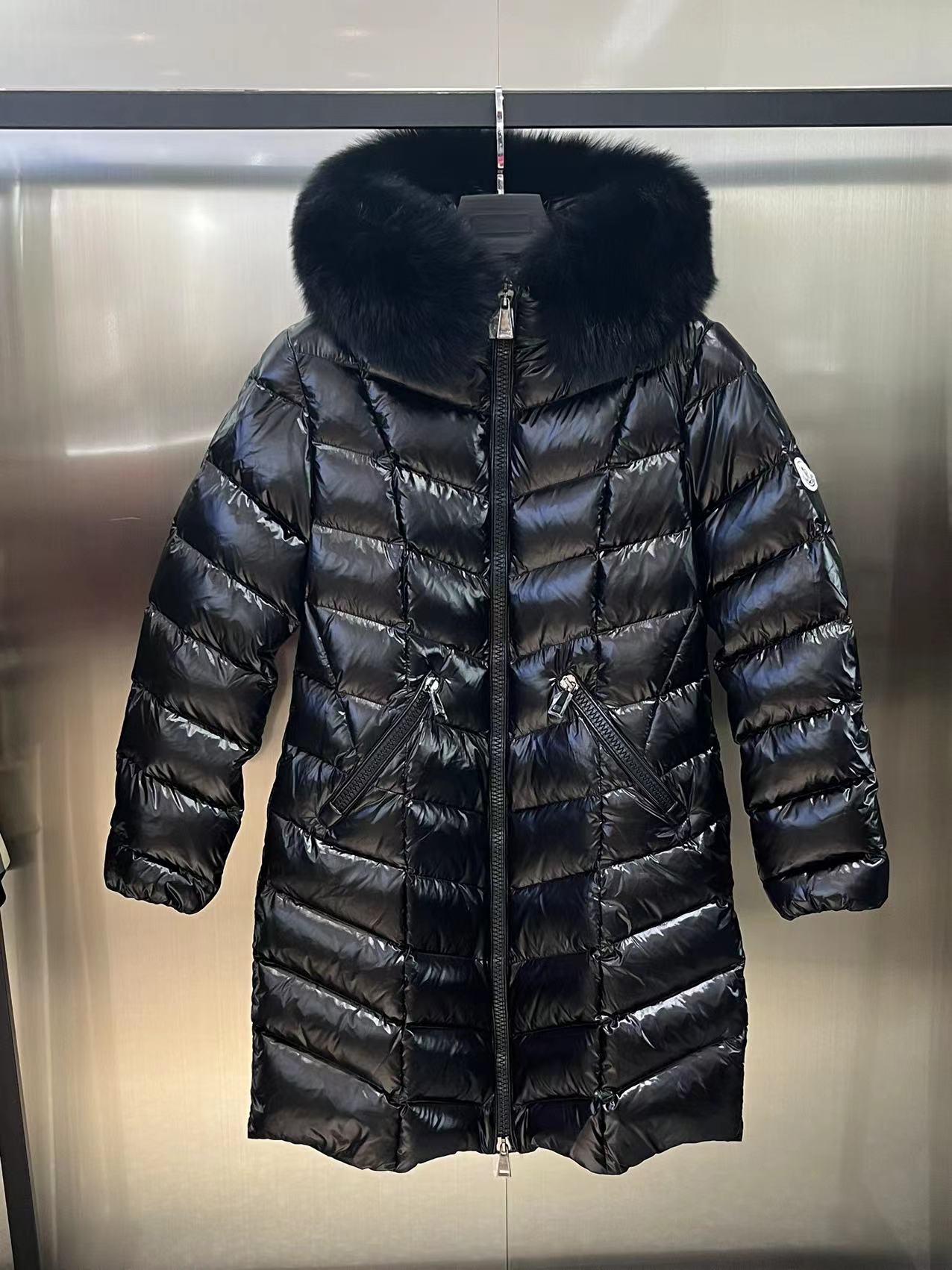 Guangzhou high-end Moncler FULMARUS women's long hooded down jacket. Made of coated nylon with special fishbone quilting for warmth and style. Features frost fox fur hood trim. Filled with 90% down. Sizes 1-4. Colors: black, white, black with black fur, yellow fox fur, gray fur collar.