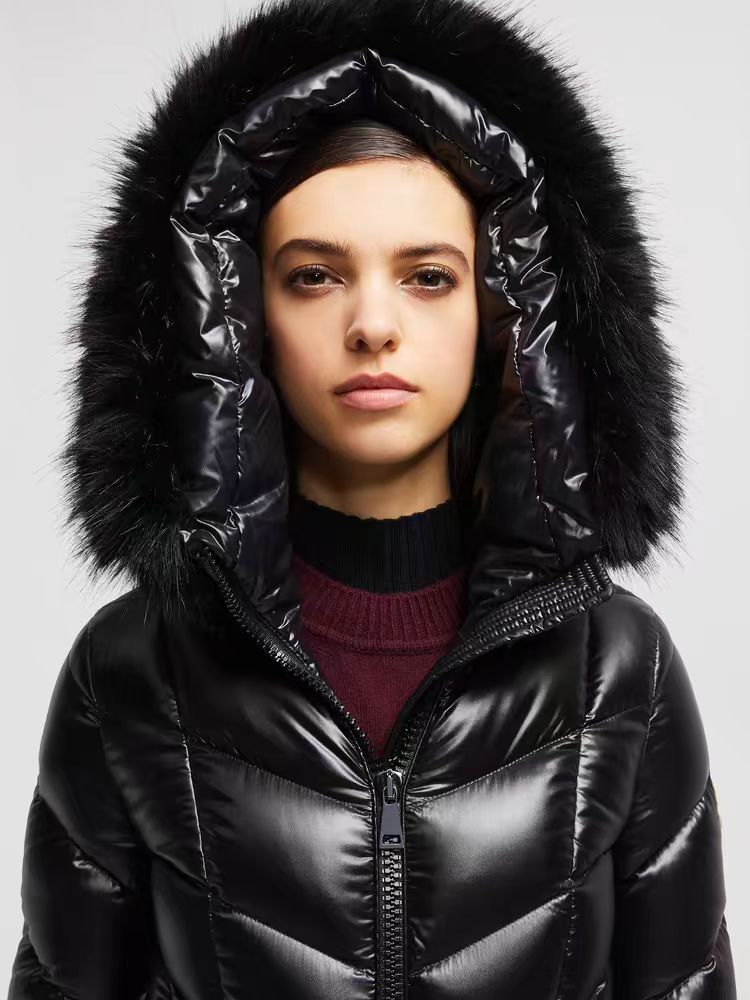High-quality Guangzhou Moncler Fulmarus long down jacket with fox fur hood. Colors: Black. Sizes: 1-4.