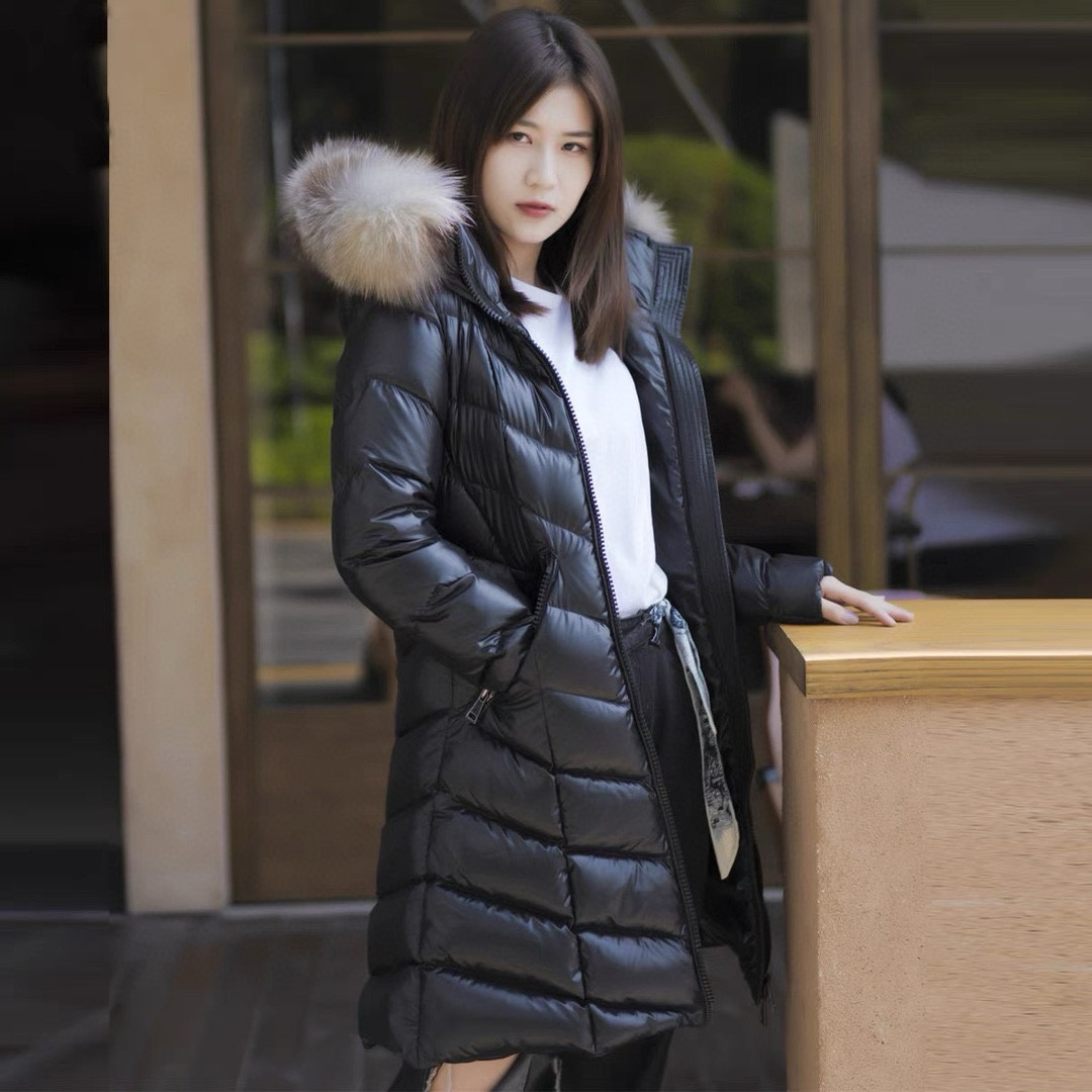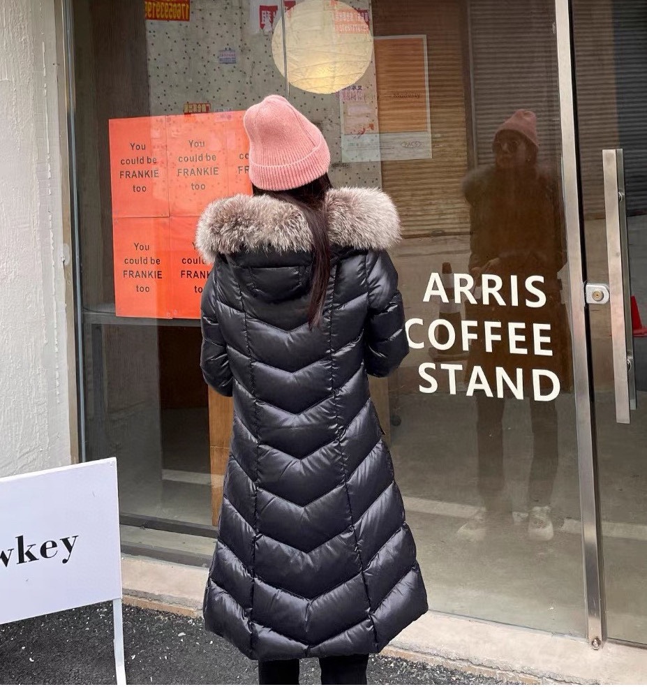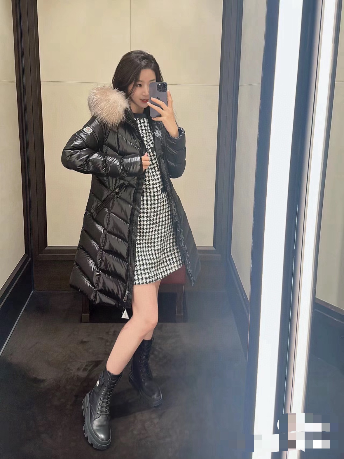 High-quality Moncler FULMARUS women's long hooded down jacket. Made of glossy nylon with special fishbone quilting, warm and stylish. Features a frost fox fur hood. Available in sizes 1-4, colors: black, white, black with black fur, yellow fox fur, gray fur collar.