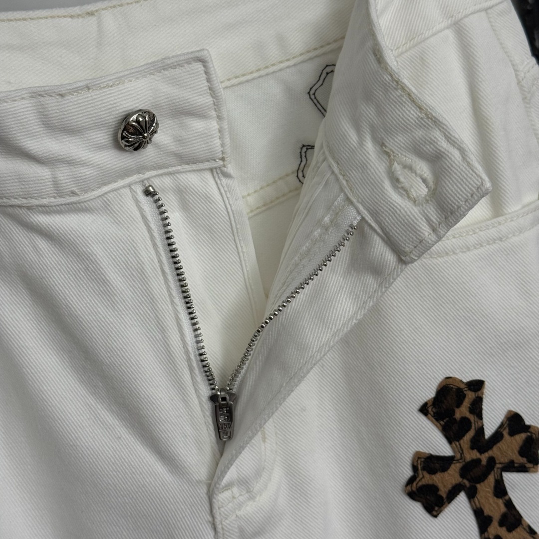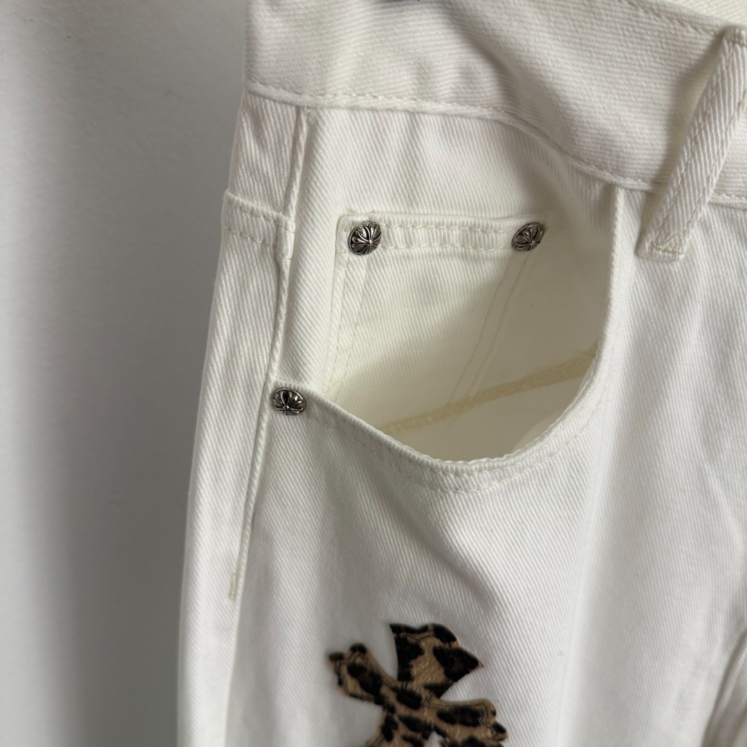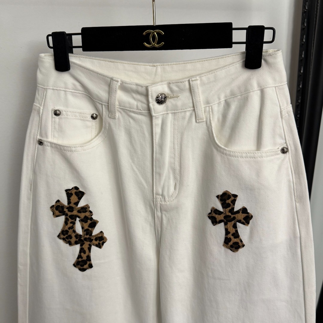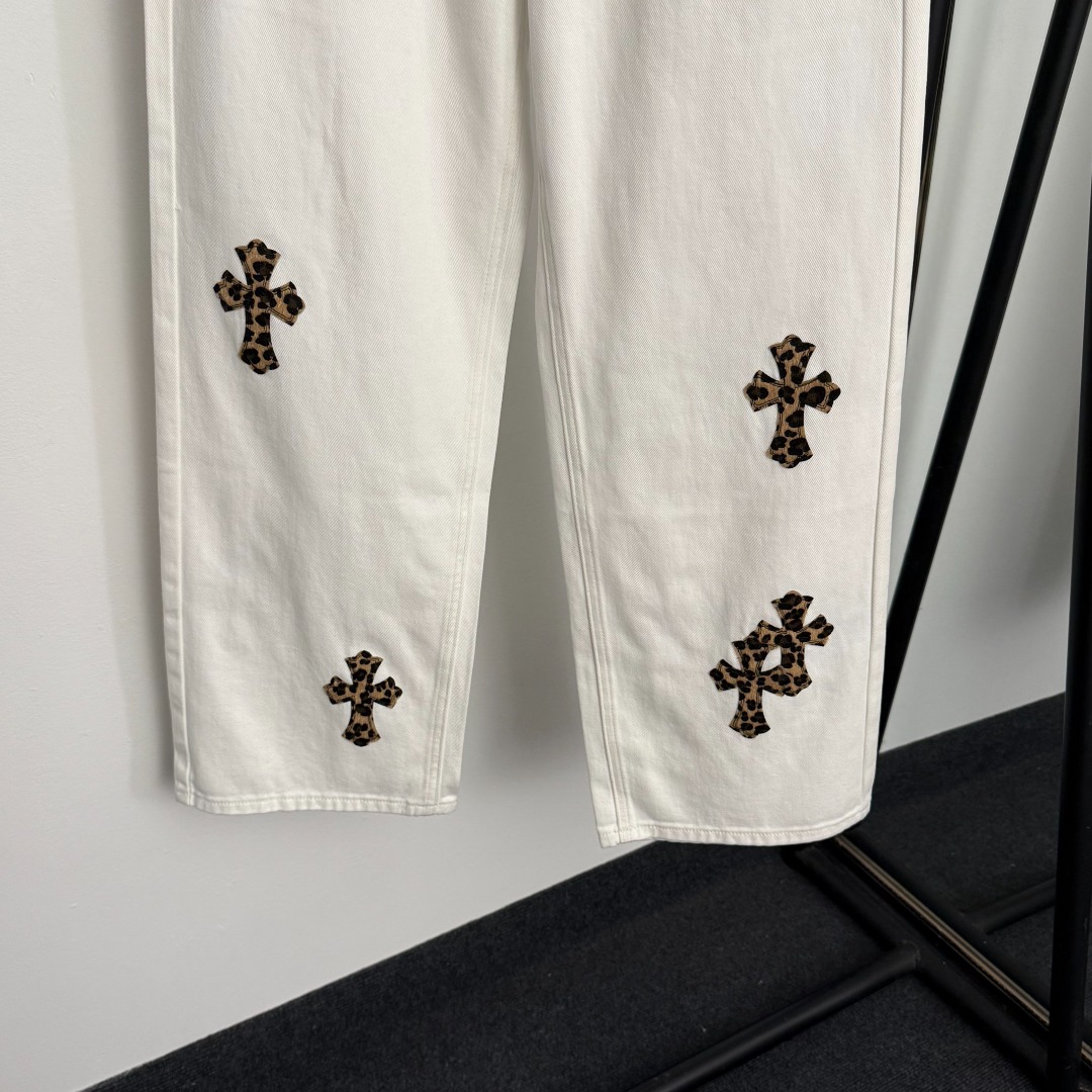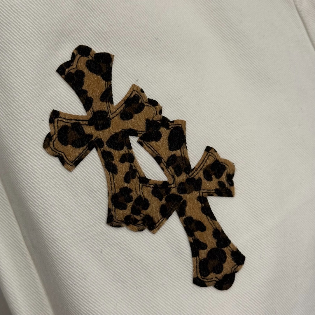 Model 20255714 Chrome Hearts new leopard print cross embroidered high-waist jeans in white, sizes S-XL.