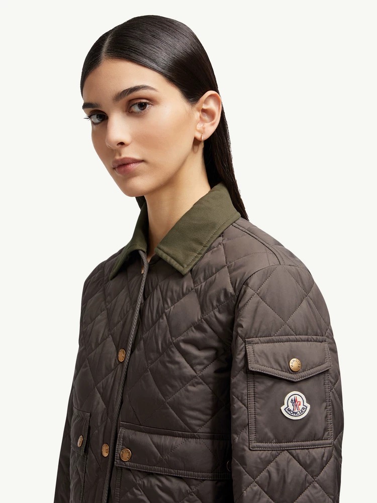 Moncler 2025 Chitre women's diamond-quilted shirt-style down jacket. Features a structured collar, tailored waist, and 90% goose down. Colors: black, beige, khaki, army green. Sizes: 0-1-2-3.
