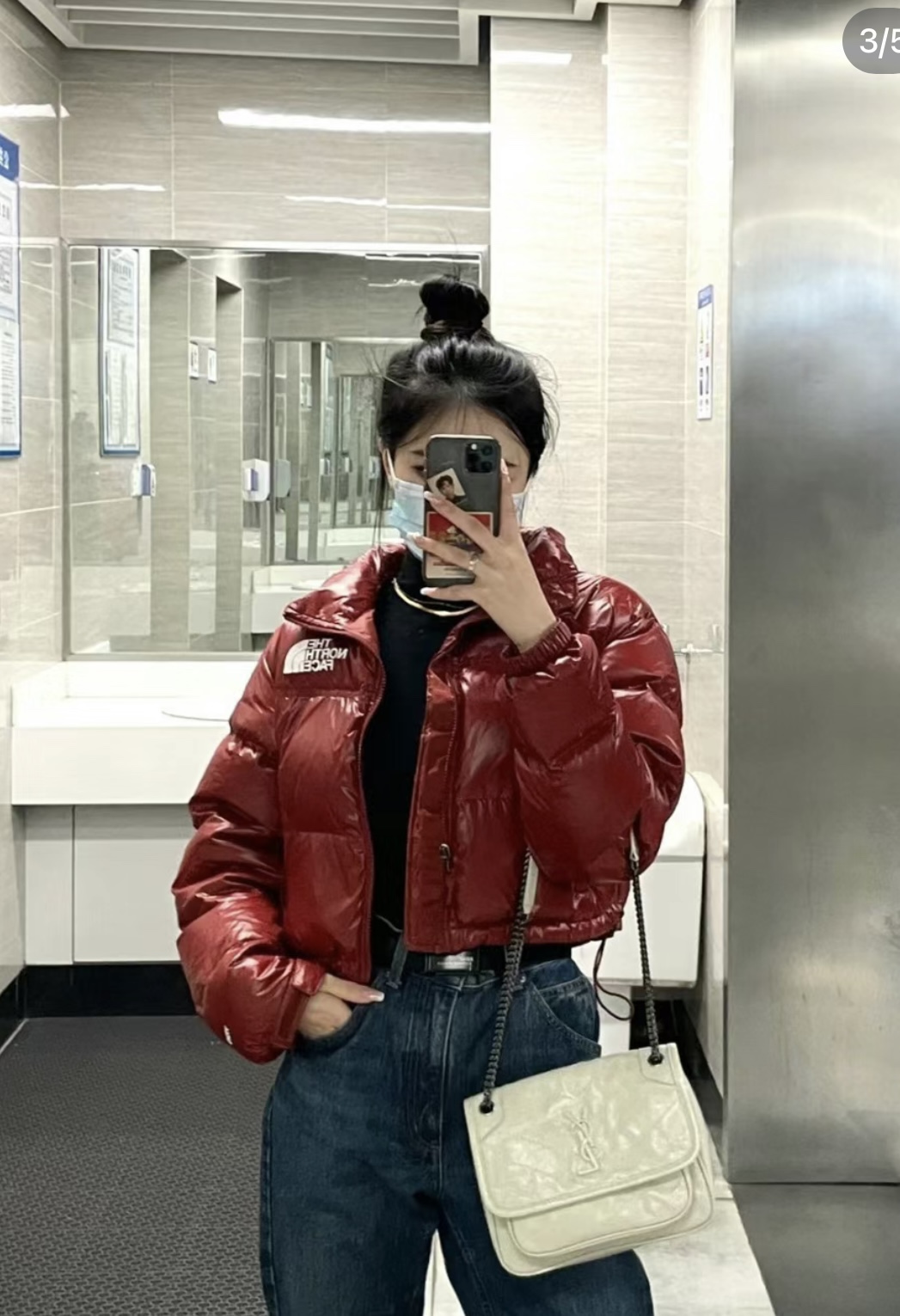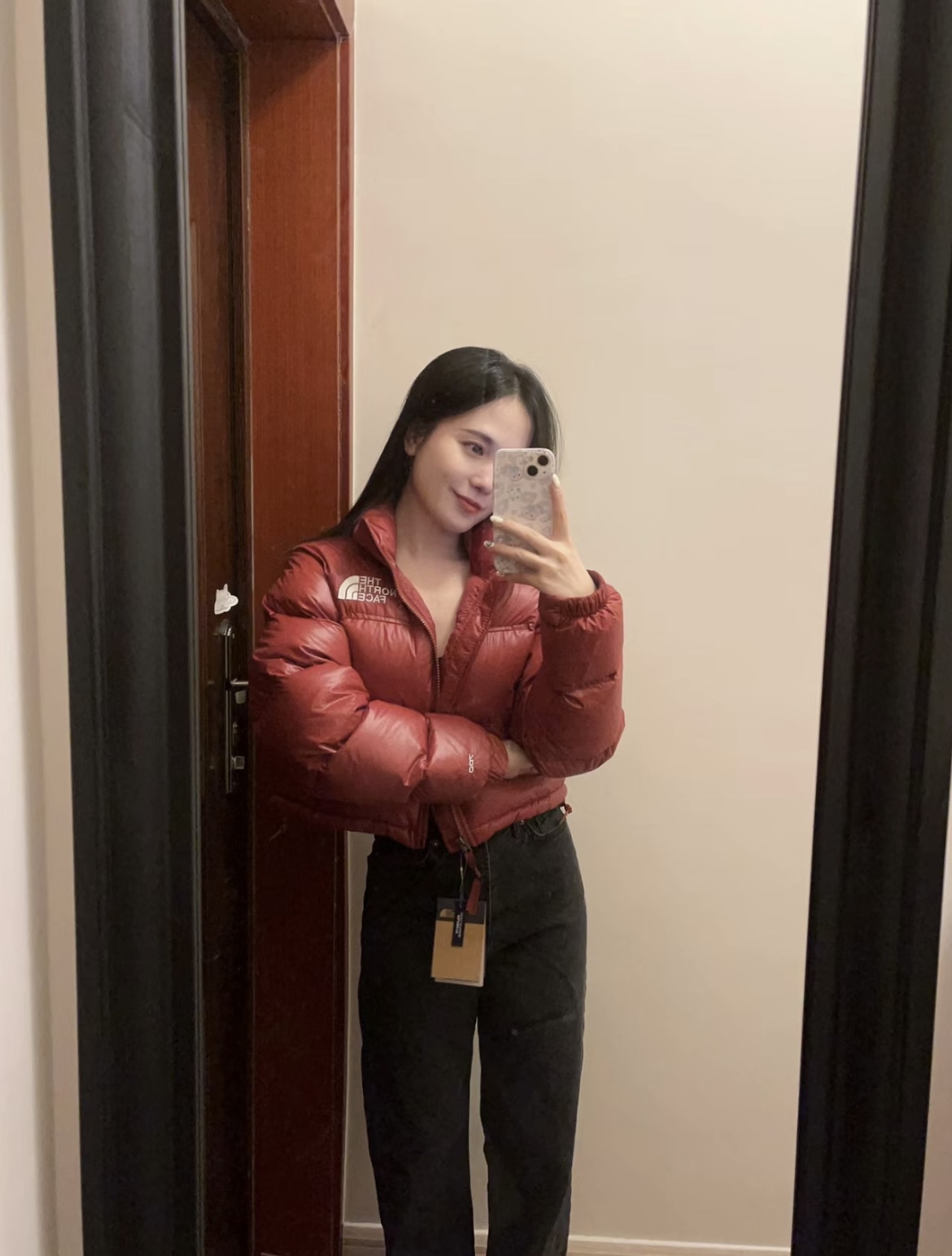 The North Face short puffer jacket in red or green. Kendall Jenner style, figure-flattering and versatile. Perfect with sportswear.