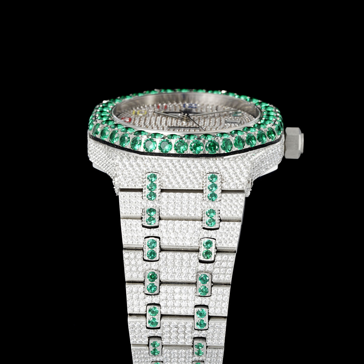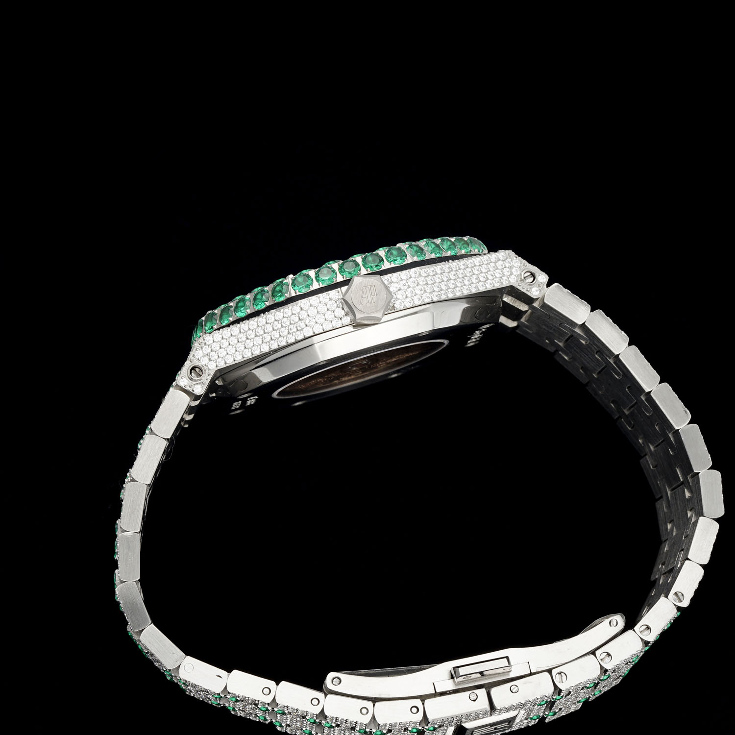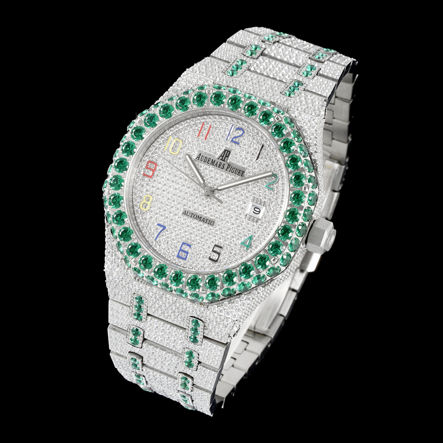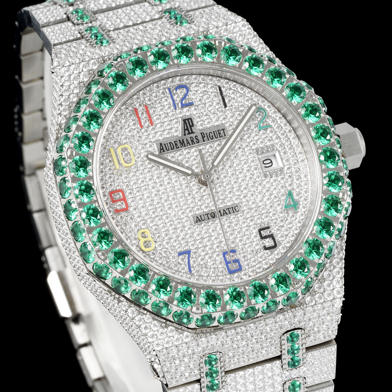 AP Audemars Piguet diamond bezel options: white or green, square or round. Men's automatic mechanical watch with 316L stainless steel case, Swarovski crystals, 42mm size.