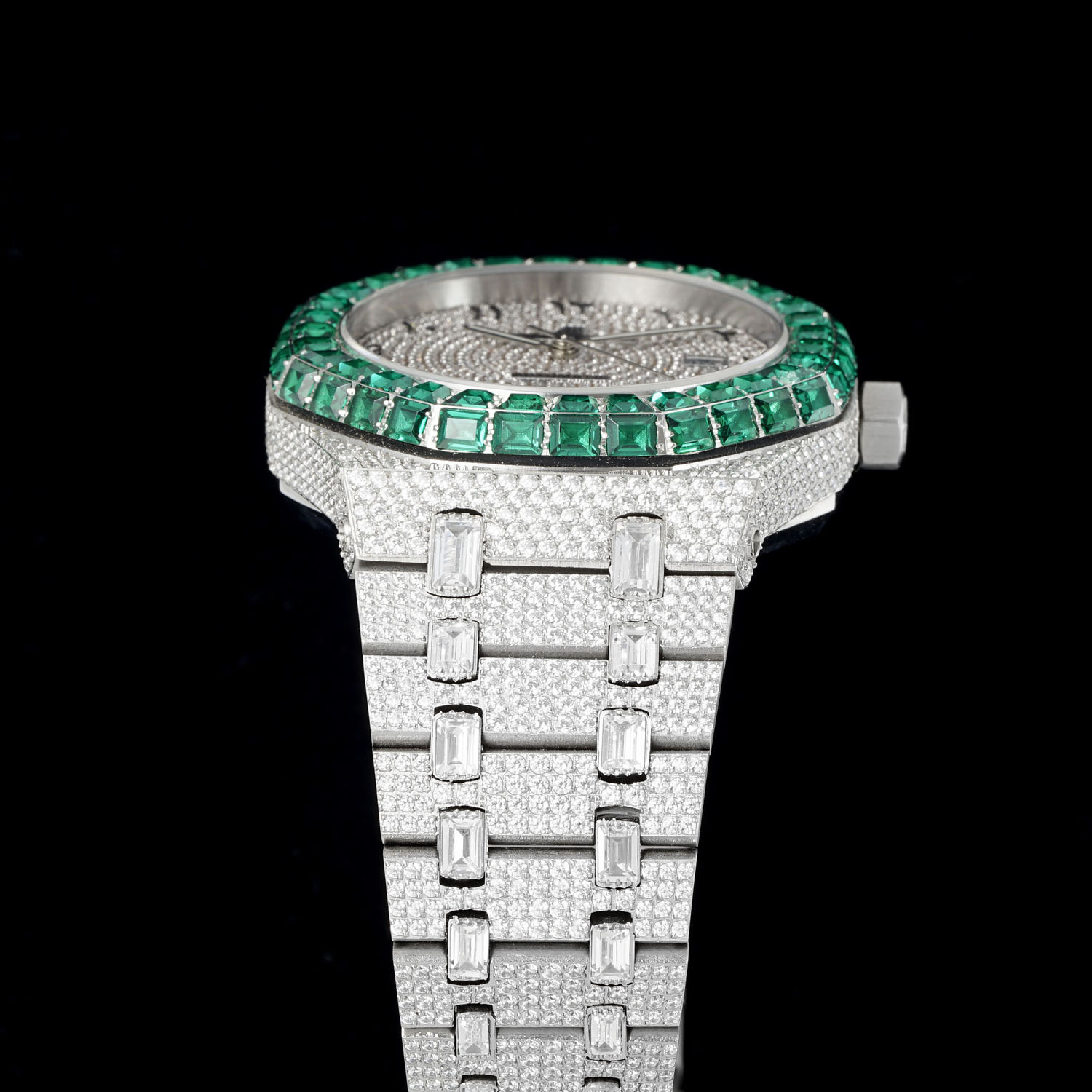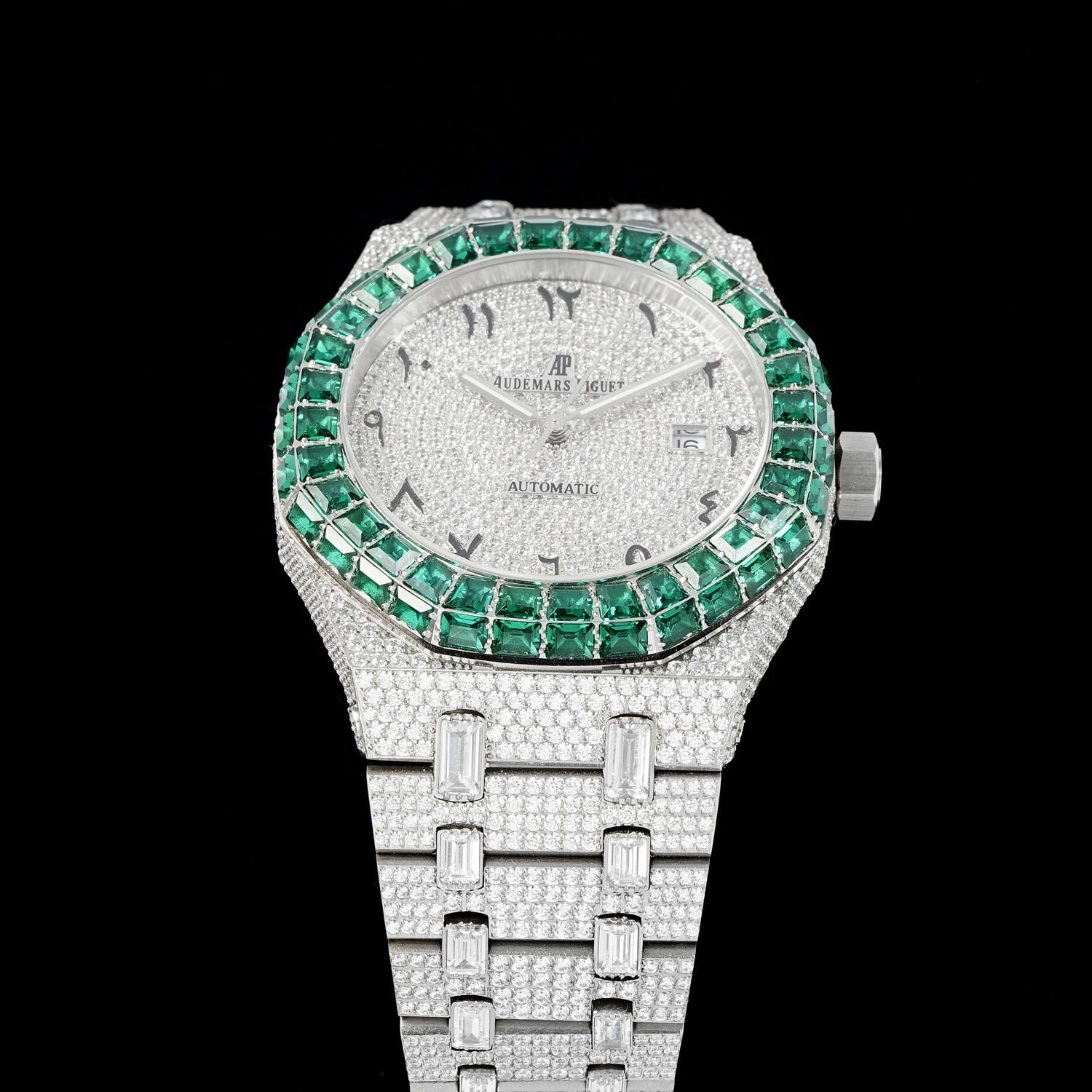 AP Audemars Piguet diamond bezel options: white or green, square or round. Men's automatic mechanical watch with stainless steel case, Swarovski crystals, 42mm size.