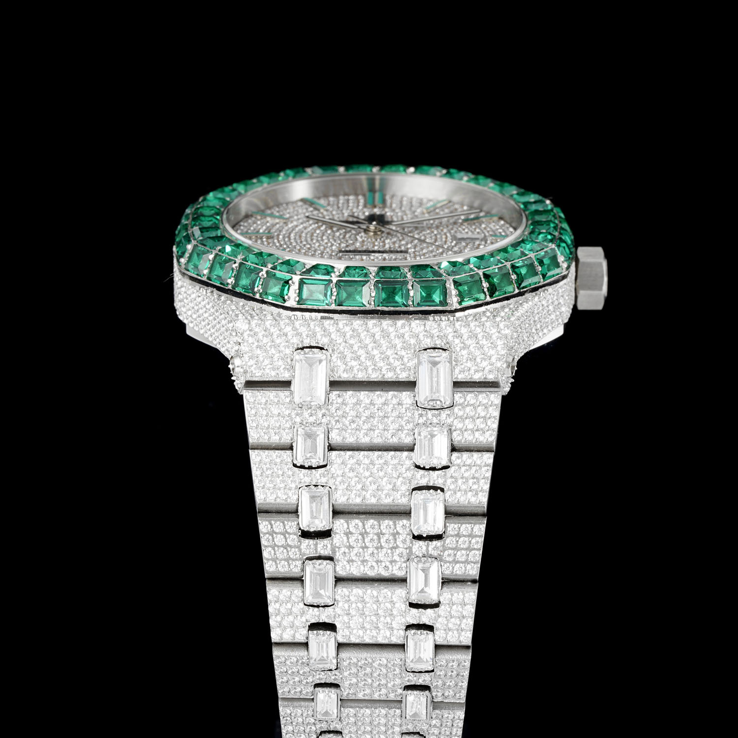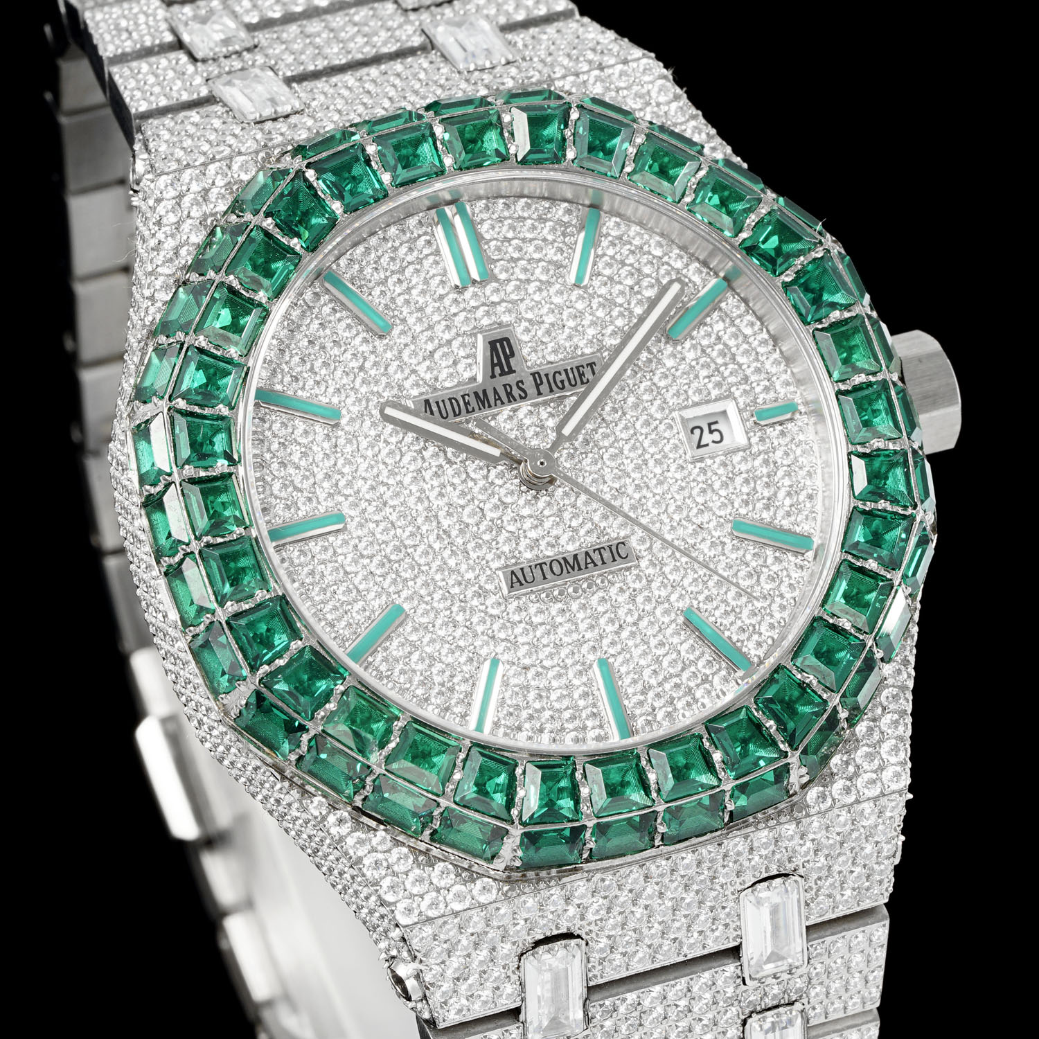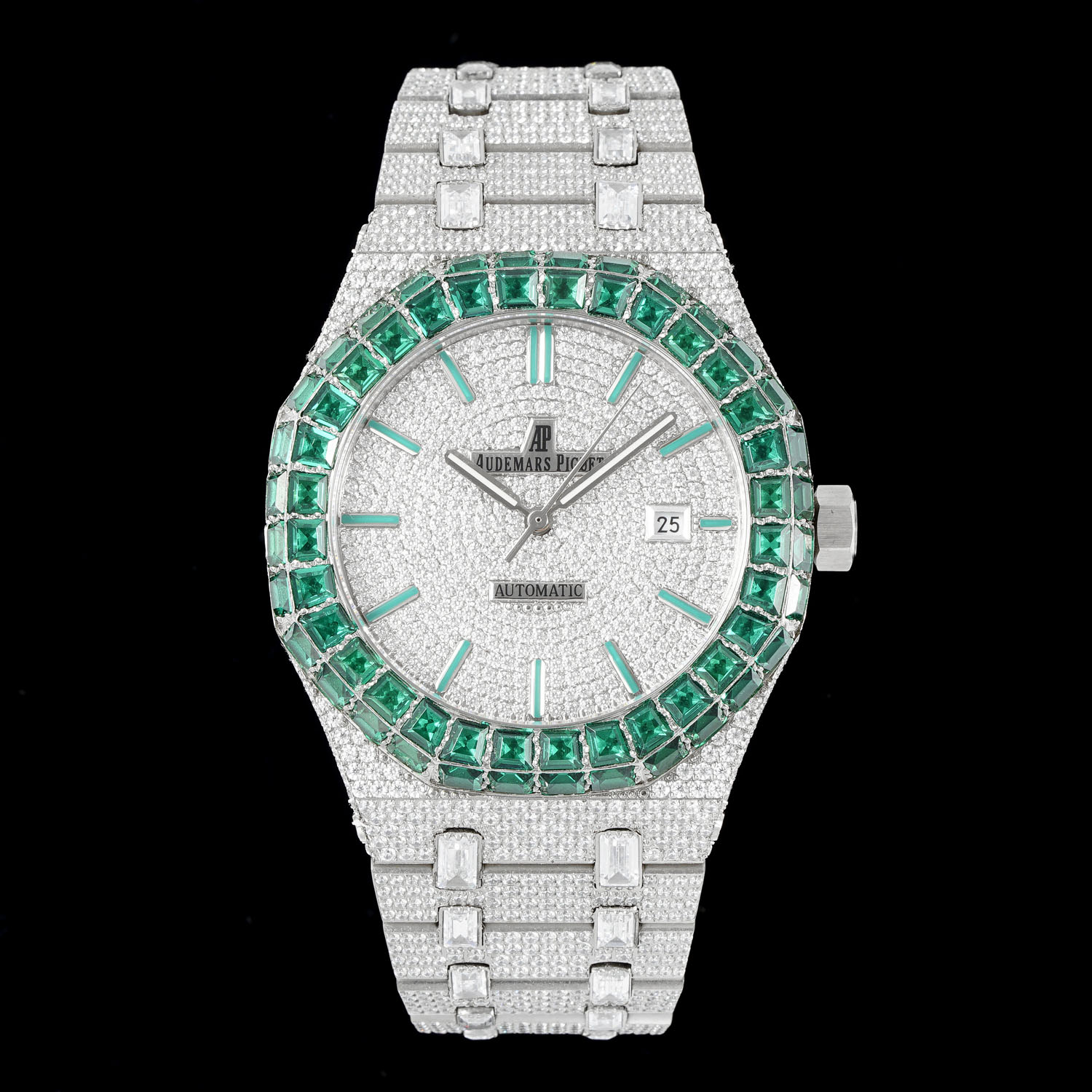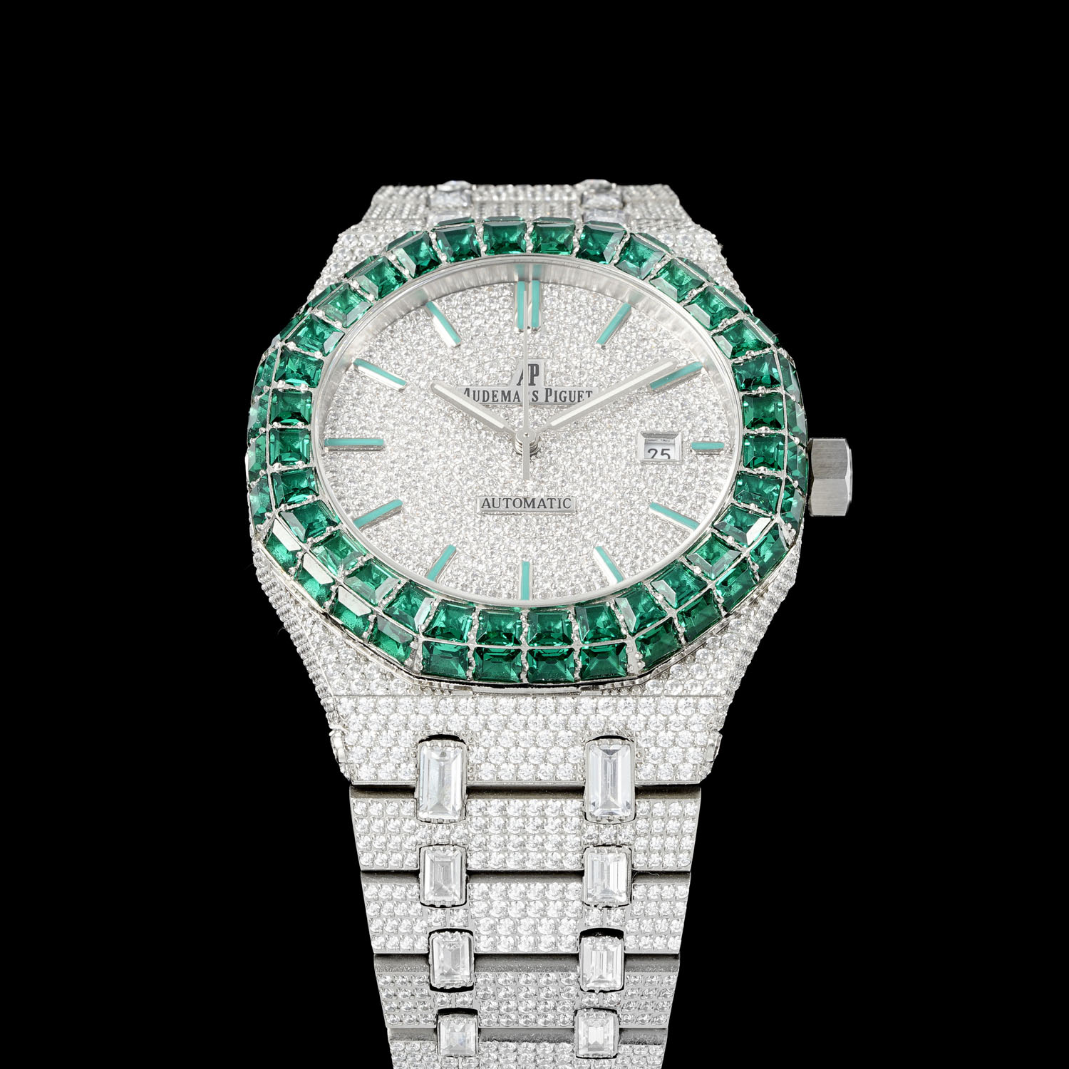 AP Audemars Piguet diamond bezels available in white or green, square or round. Men's automatic mechanical watch with stainless steel case, Swarovski crystals, 42mm size.