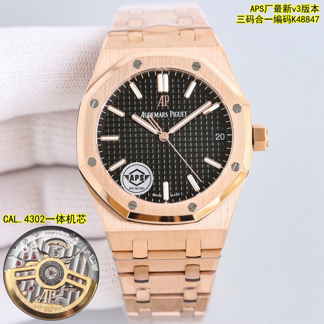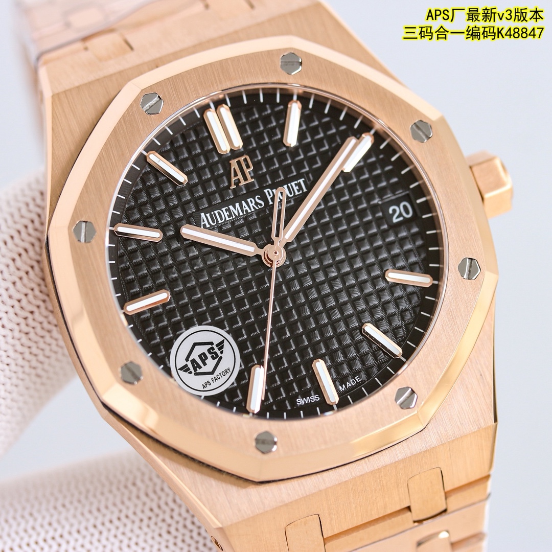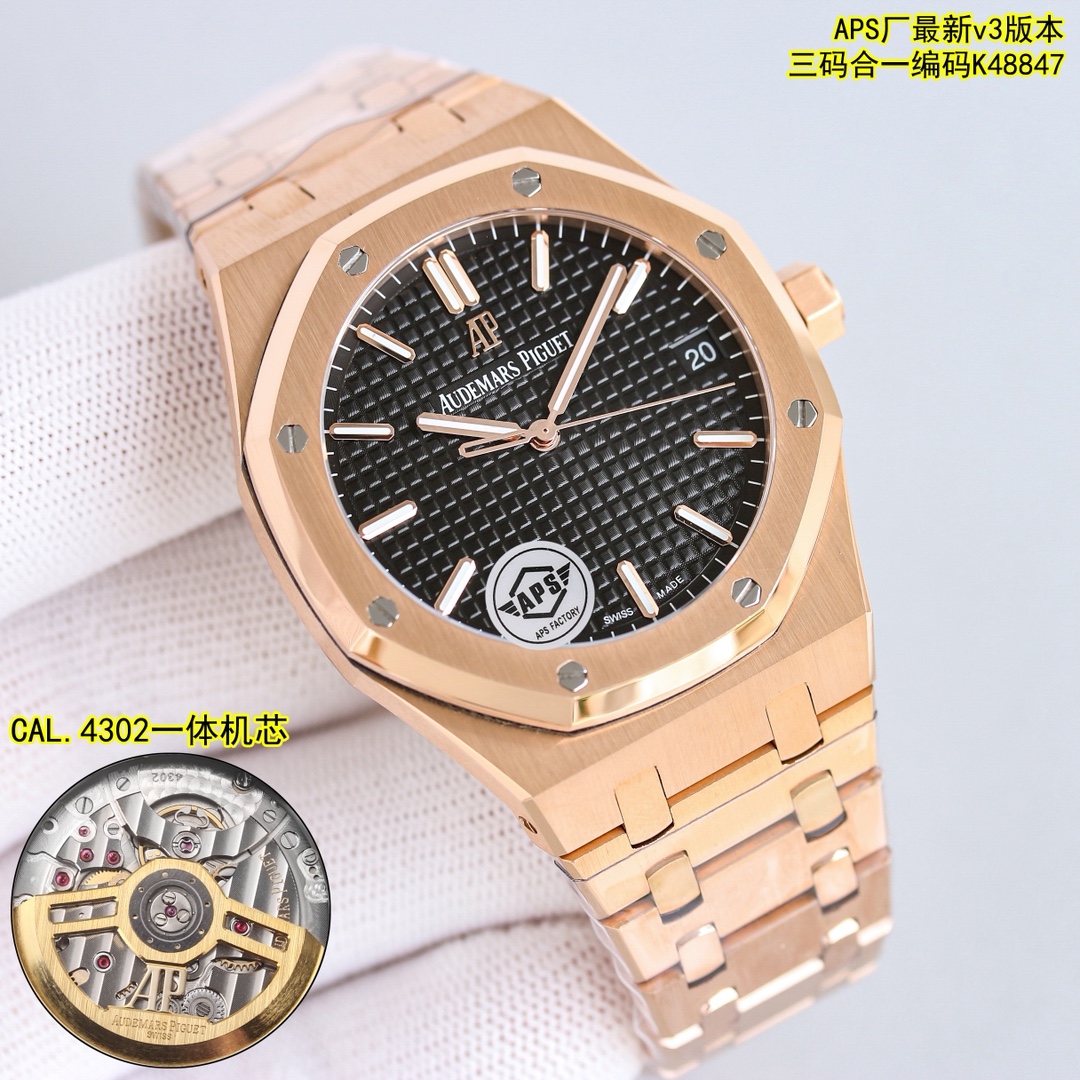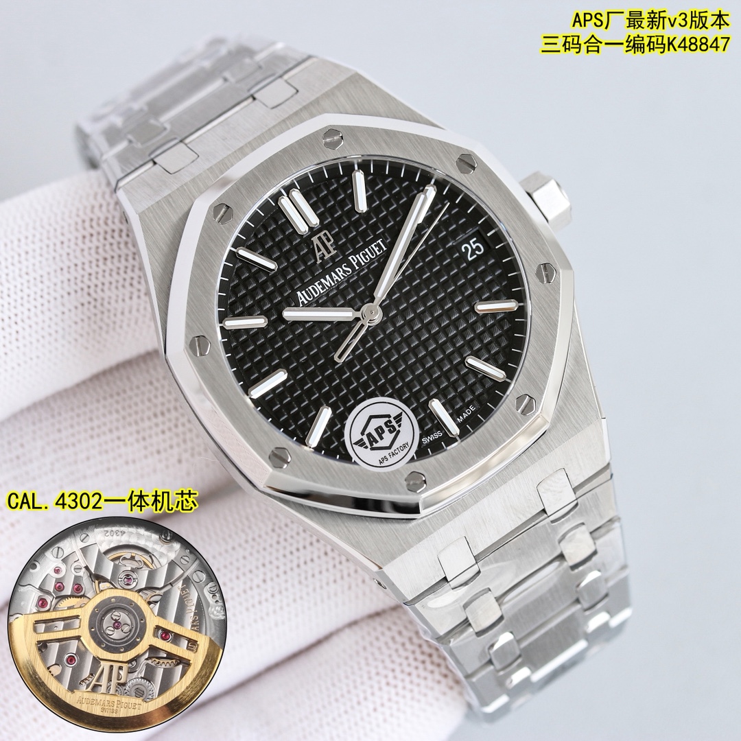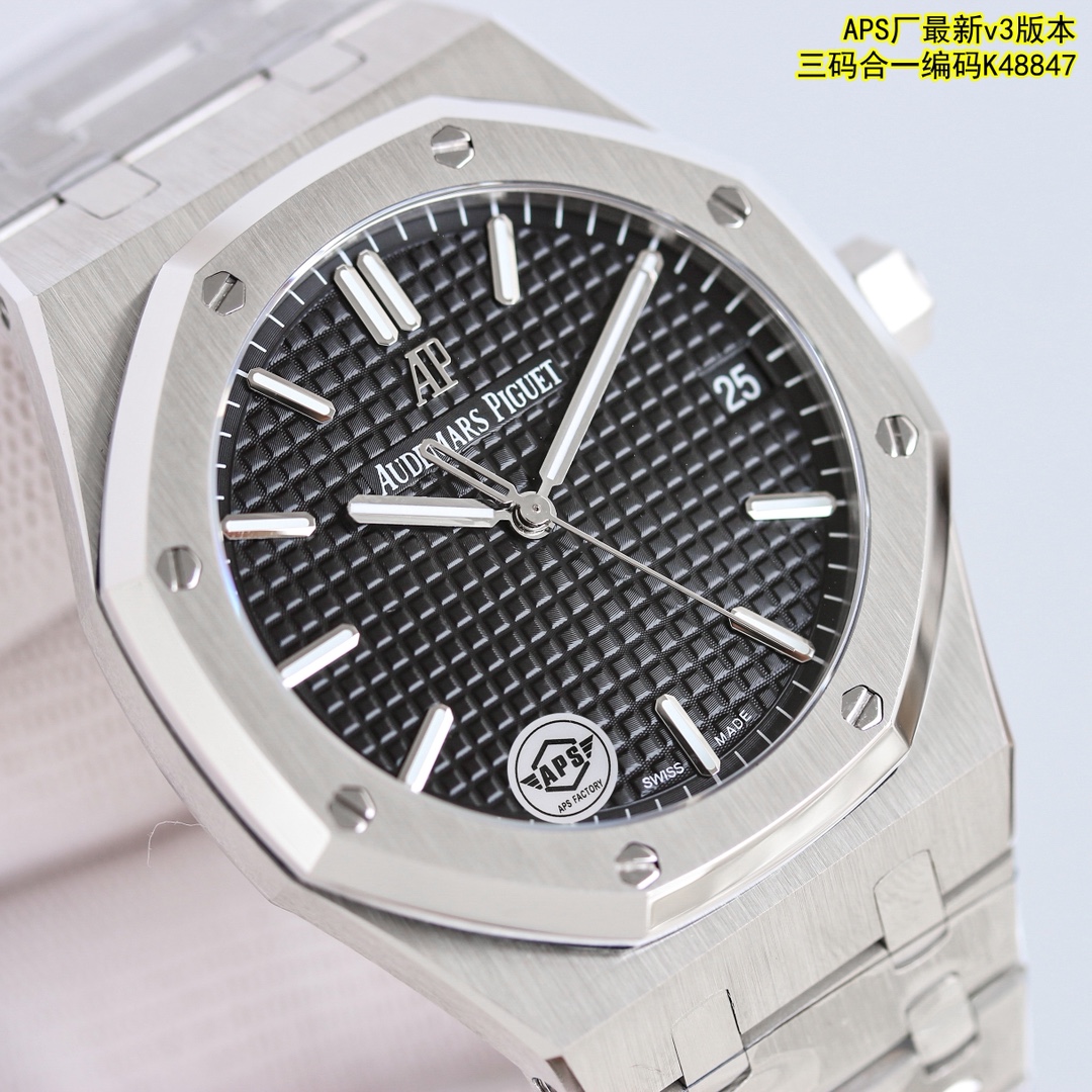 Aps new product, three codes in one, watch encoding, K48847, Audemars Piguet Royal Oak 15500—currently the pinnacle of steel watches on the market—powerfully interpreting the reigning "Steel" King! 【6 Exquisite Details】1. Molded from disassembled genuine product, dimensions 41x10.4 mm, identical to the genuine. 2. Perfectly restores every detail of the genuine watch case, fully showcasing the genuine's "sharp-edged, resolute, and bold" masculine气质. 3. The craftsmanship of the steel bracelet is impeccable, surpassing any other steel bracelet watch on the market. The tightness of the "buffer zone" connecting the bracelet's first link and the watch head is exactly the same as the genuine. 4. The oscillating weight pays tribute to the original; it is the only version on the market that achieves color consistency with the original (common versions on the market tend to be reddish). The AP family emblem engraved on it is unique. 5. Breaking the concept of using a movement ring, it uses a Miyota 9015 movement modified into the Audemars Piguet CAL.4302 integrated movement! More stable, superior, and authentic. 6. The watch dial's "tapisserie pattern" is three-dimensional and full of vitality, spirited! Far from the dispirited look of ordinary small factory products. Experience the exquisite, feel the difference! Aps product, custom version, three codes in one, assuredly a fine product!