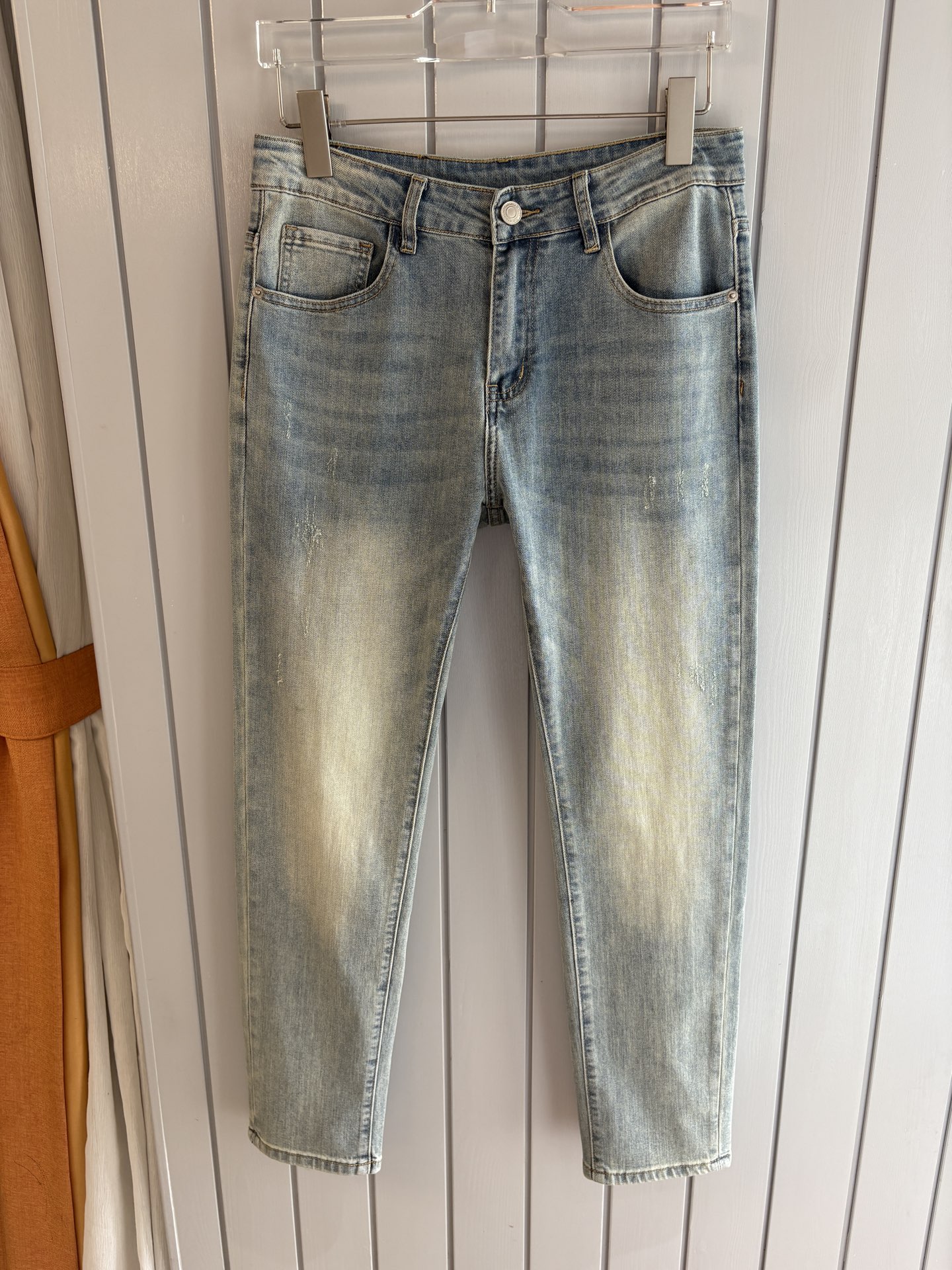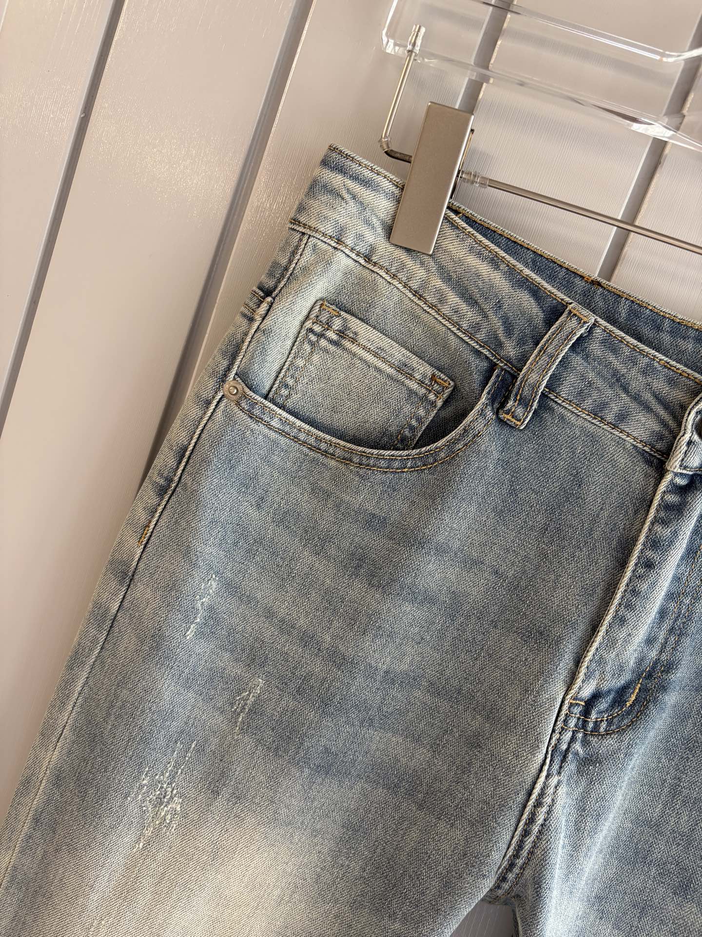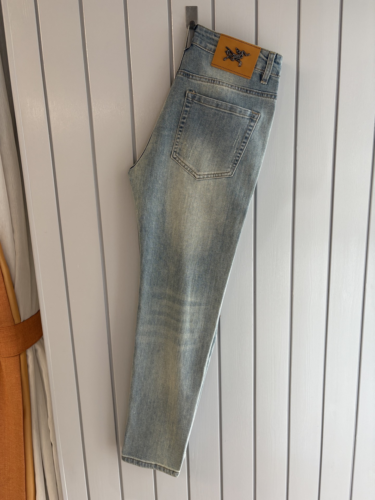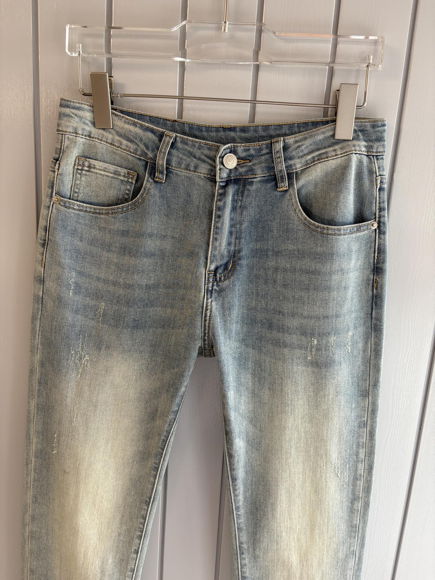 A super stylish pair of jeans, custom original washed denim fabric, unique design, top embroidery craftsmanship with letter pattern logo, original hardware accessories decoration. An extremely outstanding pair of jeans, both material and craftsmanship are exceptionally luxurious and exquisite, very high-grade, looks handsome and stylish when worn.