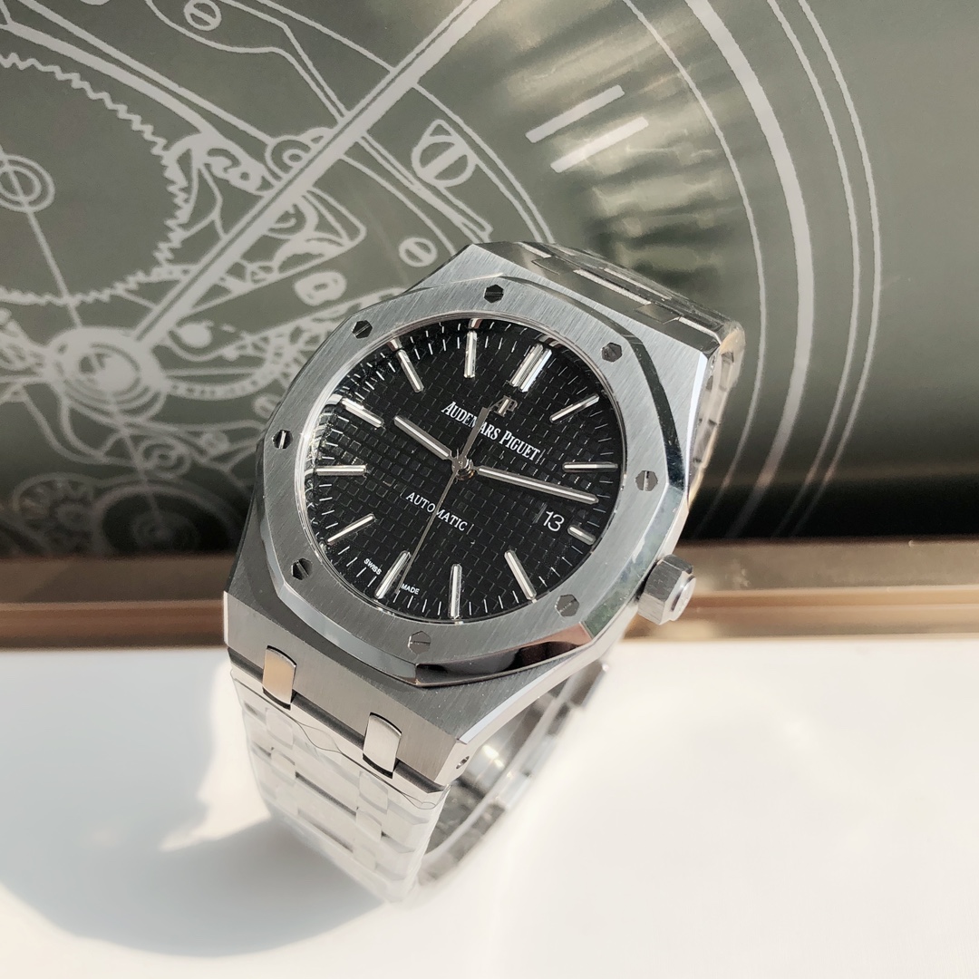 Audemars Piguet Royal Oak 15400 top-tier replica, interchangeable with original parts. Available in black, blue, white, gray. 41mm case, 9.8mm thickness. Made of imported steel, with detailed brushing. Sapphire crystal, exhibition caseback. Original 3120 movement. Full packaging included.