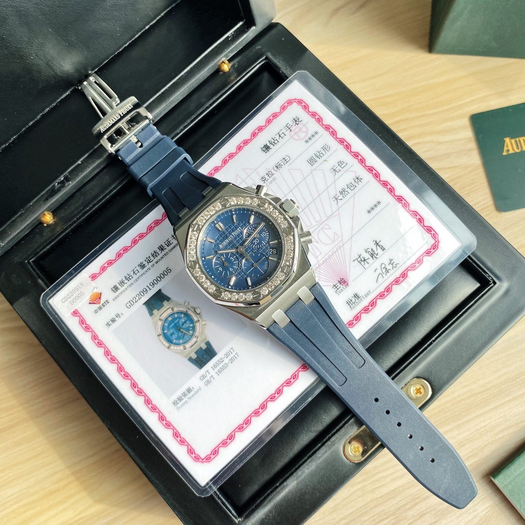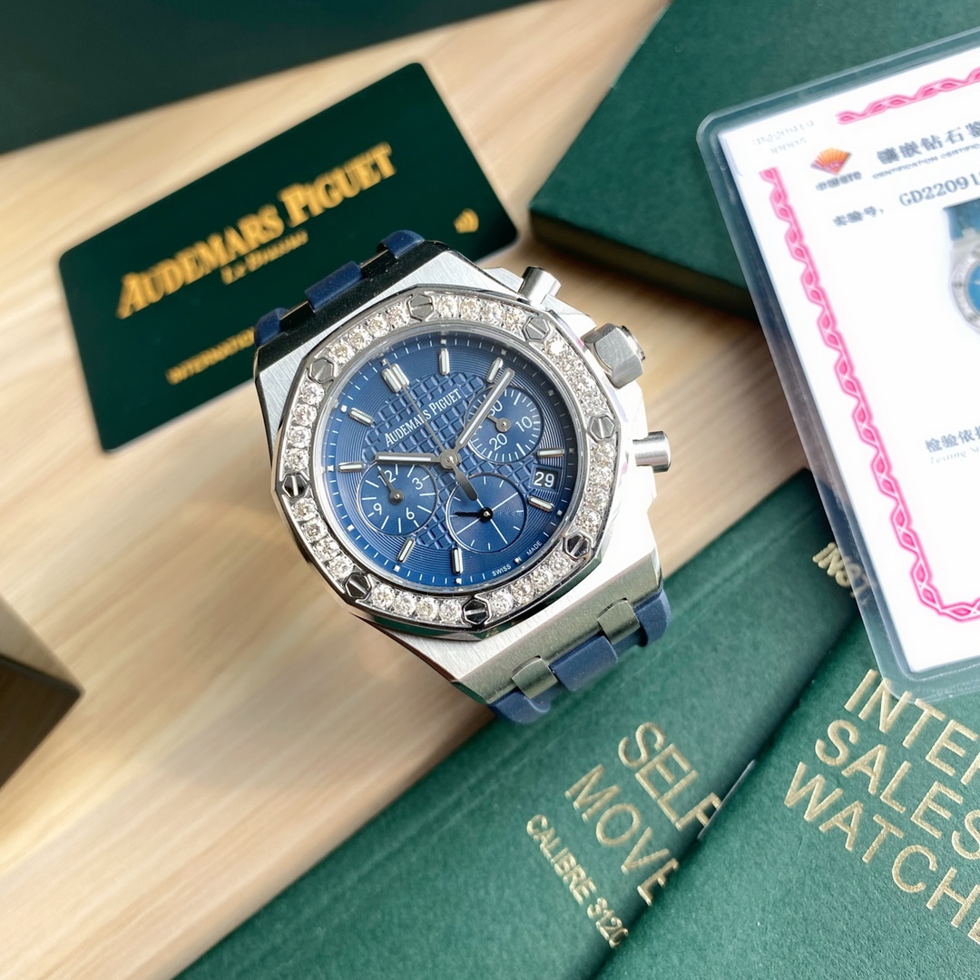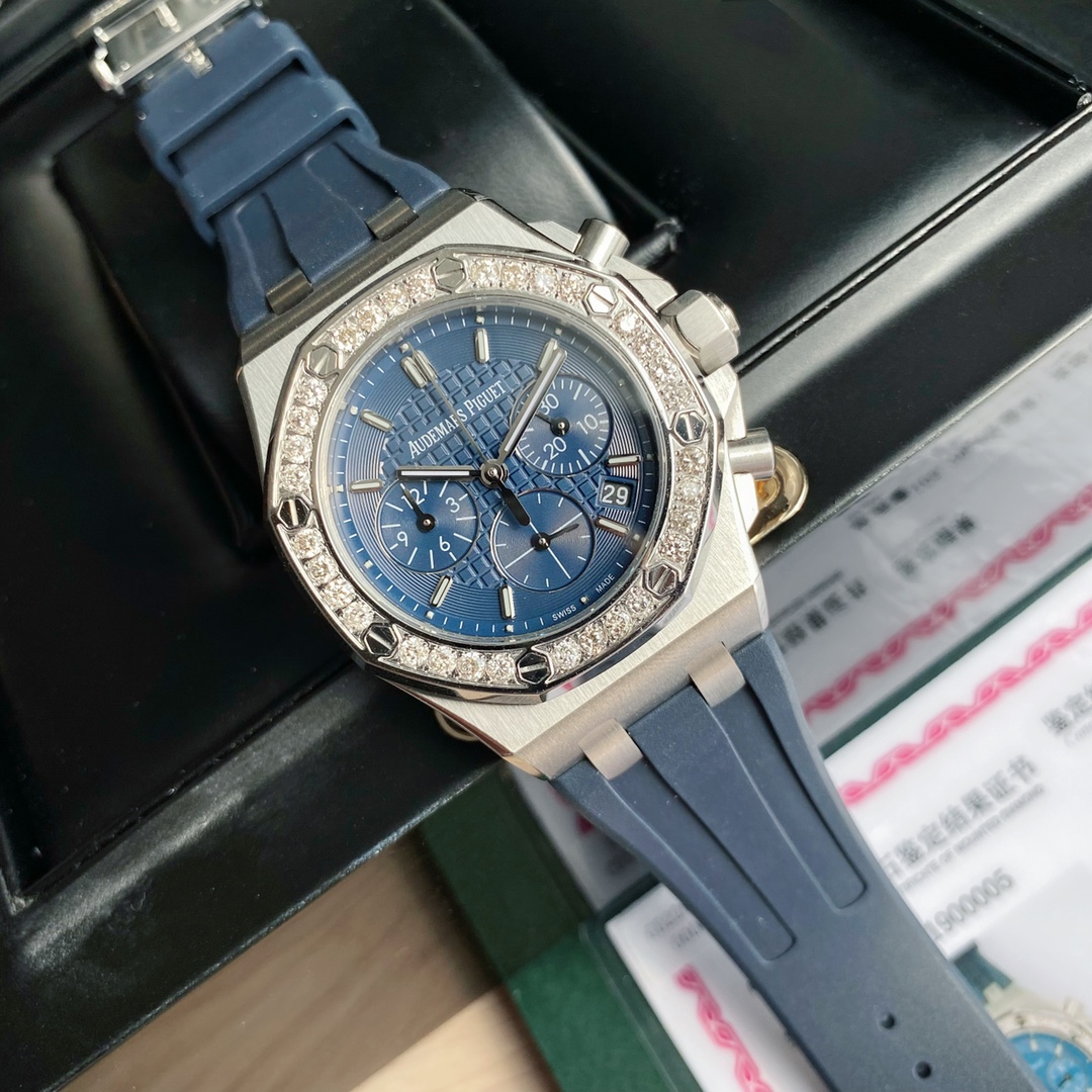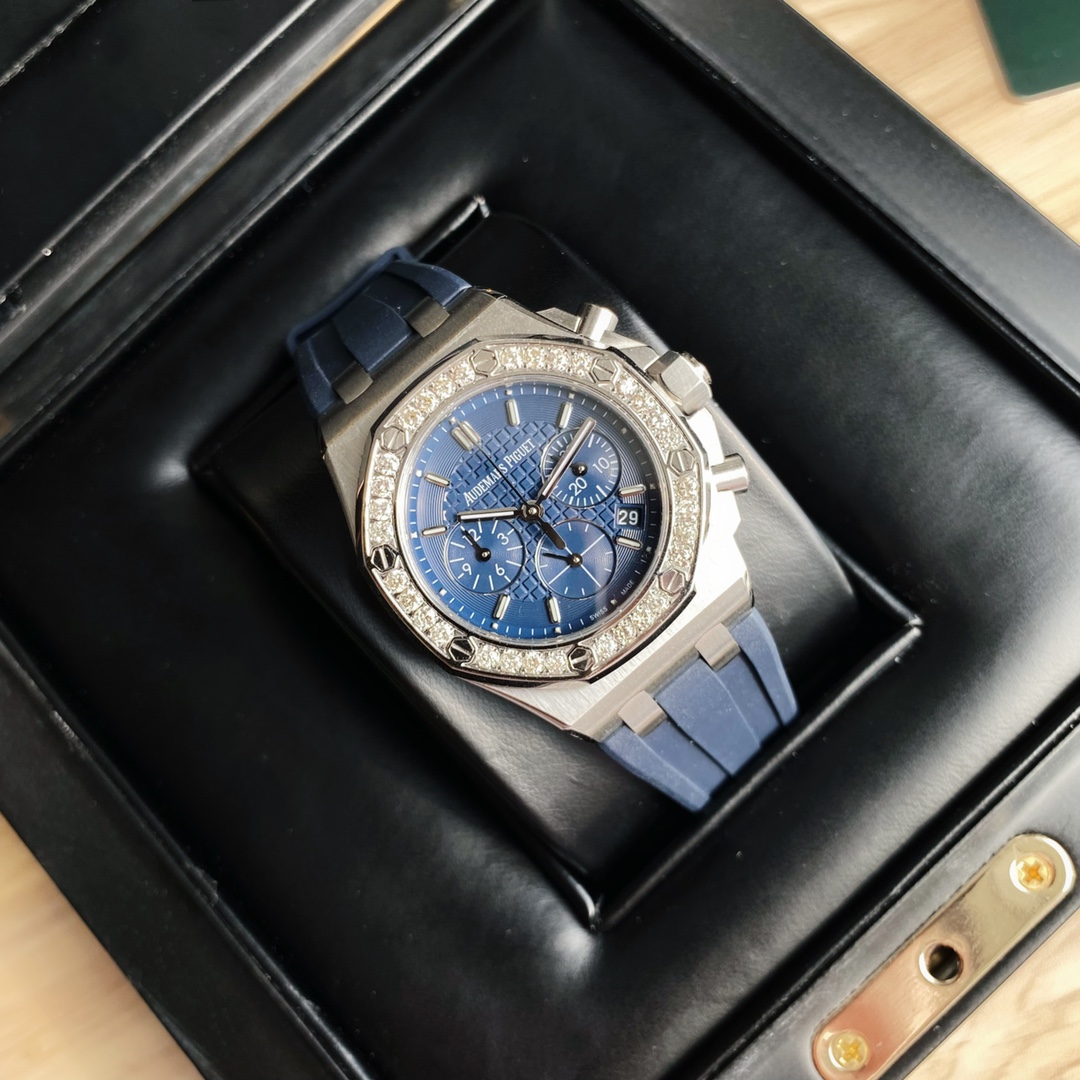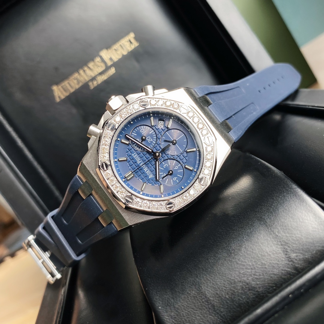 The latest Royal Oak Offshore series chronograph quartz watch, one of the most popular Audemars Piguet women's watches! A.P - Audemars Piguet Royal Oak Offshore series, the dial is decorated with Lady Tapisserie pattern, presenting a stronger visual impact. The case is made of 904 stainless steel, set with 32 2.0 bright VVS grade cut diamonds (approximately 1.02 carats), offering an extraordinary touch and visual enjoyment. According to the Audemars Piguet counter sales, their diamonds are only set in D color, presenting a brilliant luster, which is the attitude that only jewelry watches have. The watch size is 37 mm, catering to the modern trend for large-diameter women's watches, creating a more heroic side for women, shining and full of texture. The strap is made of white liquid silicone, certified by the EU as an environmentally friendly material. If it gets dirty, it can be rinsed with clean water or wiped with a wet tissue. The six-hand chronograph uses an imported quartz movement, ensuring accurate timekeeping with zero error. The sapphire scratch-resistant glass makes reading the time clearer and more straightforward. The octagonal case design style highlights uniqueness and is full of vitality! The best classic among women's models.