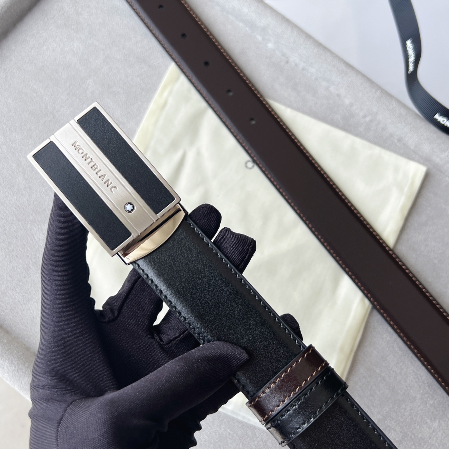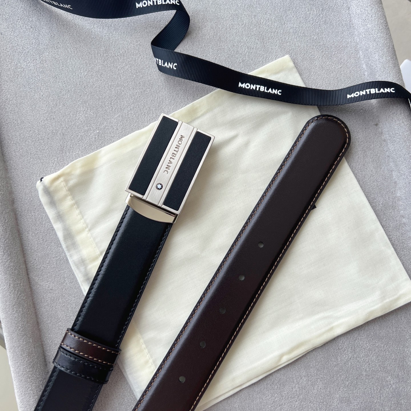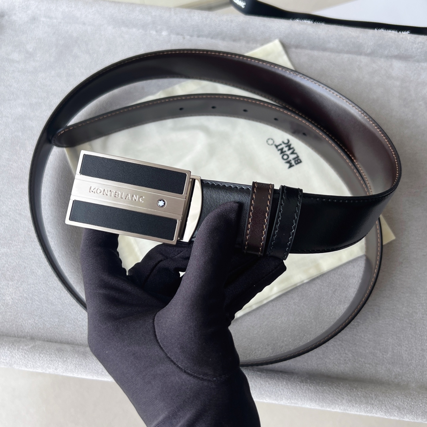 Black/brown reversible belt (35mm). Matte palladium-plated rectangular buckle with Montblanc emblem. Casual and elegant style.