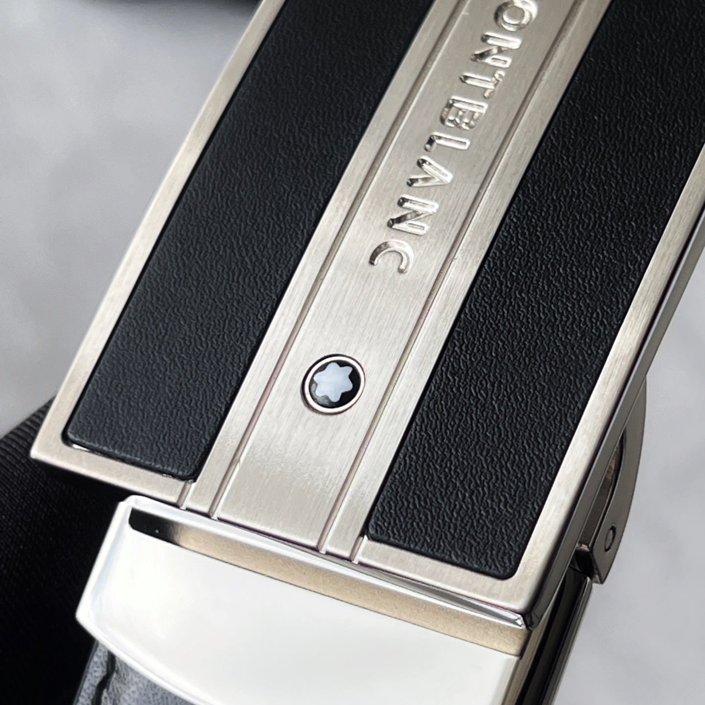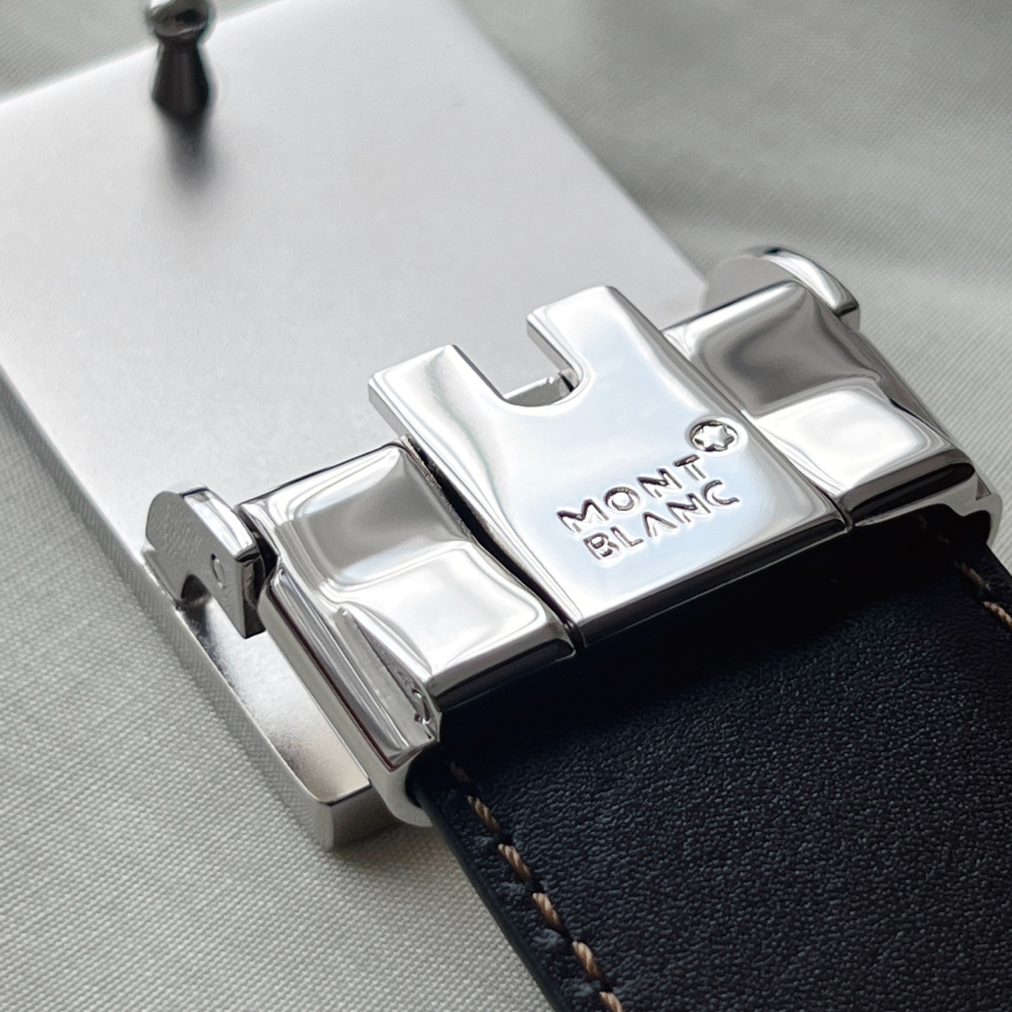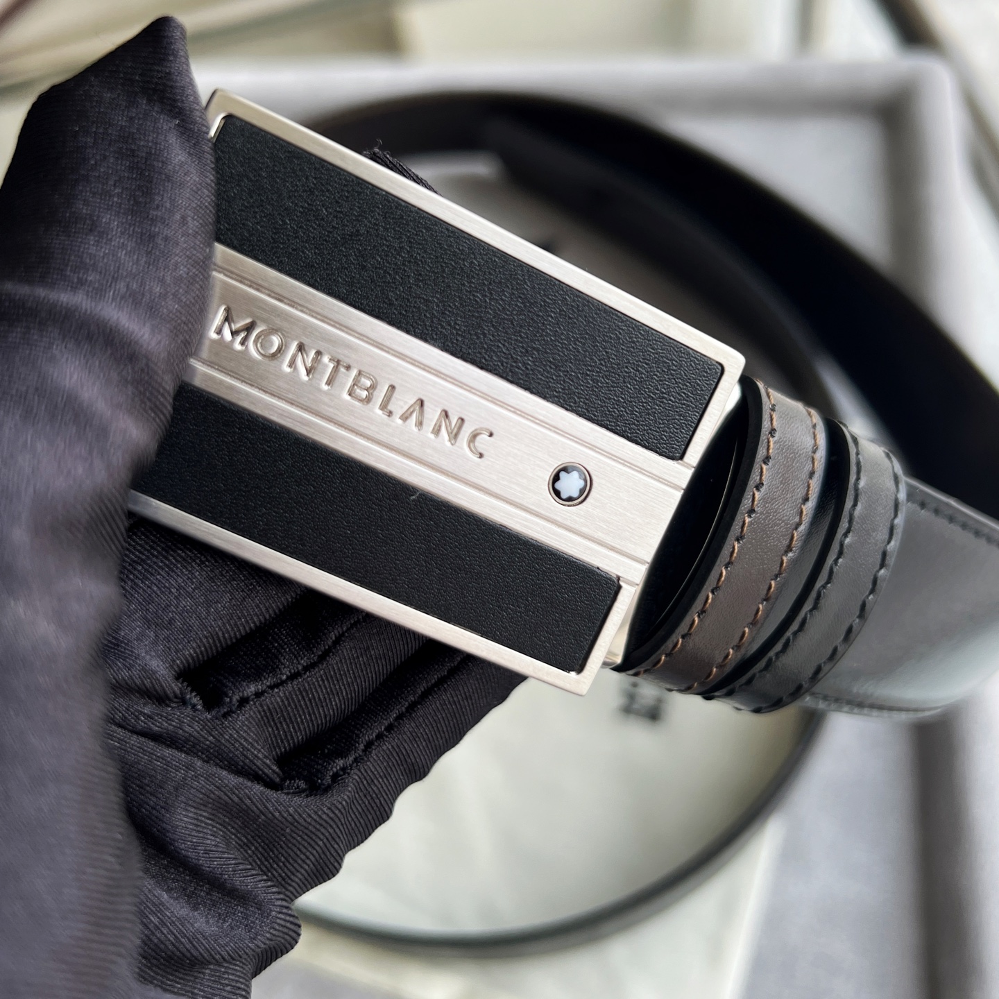 Rectangular matte palladium-plated buckle, Meisterstück collection design, engraved with the Montblanc brand name and the hexagonal white star logo, 3cm x 120cm, black and brown reversible belt. Exudes a casual yet elegant temperament.