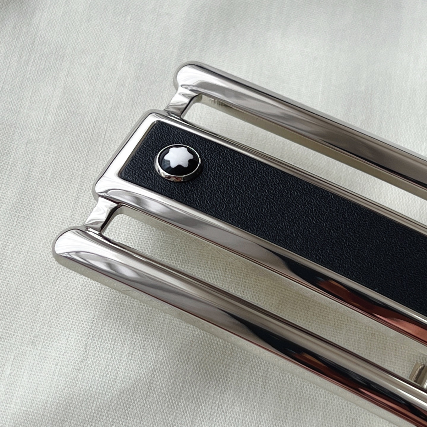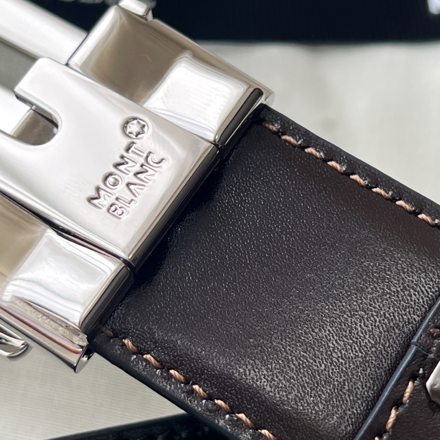 Rectangular openwork 3-ring pattern black leather and stainless steel decorated buckle. Adjustable length, 3.5 cm x 120 cm, black and brown reversible belt.