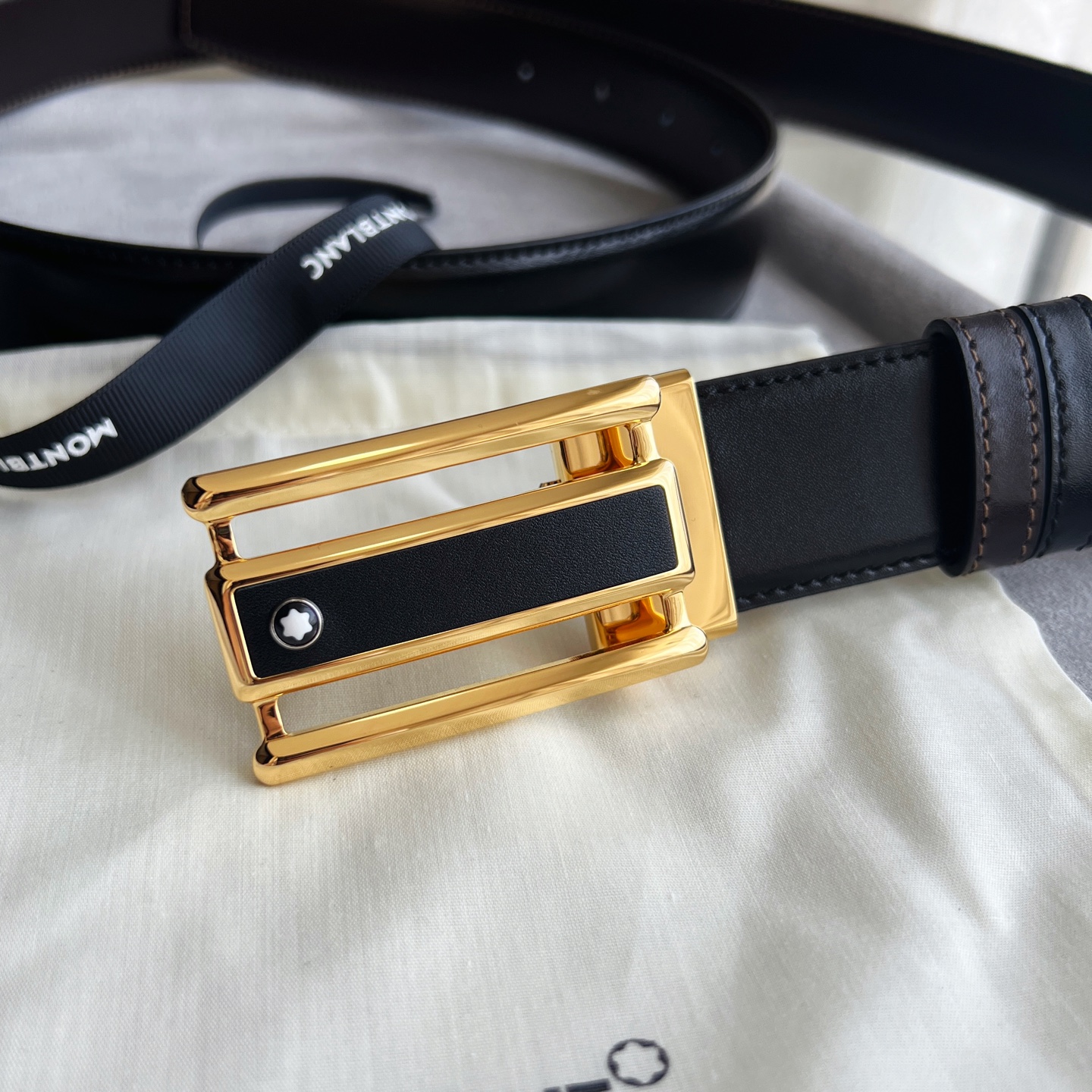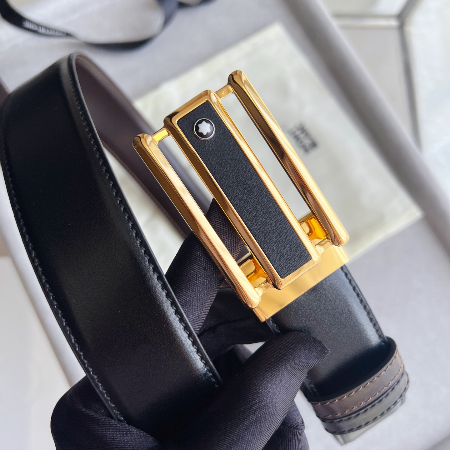 Rectangular openwork 3-ring pattern black leather and stainless steel decorated buckle. Adjustable length, 3.5 cm x 120 cm, black and brown reversible belt.