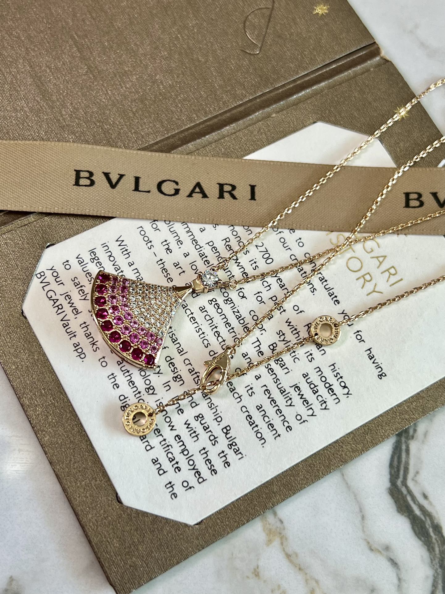 Bulgari large skirt pink full diamond, latest boutique Bulgari high-end original clasp original engraving beautiful small skirt diva series necklace high-end 1:1 custom popular, fan-shaped necklace luxurious beautiful in-store现货 necklace length 48cm