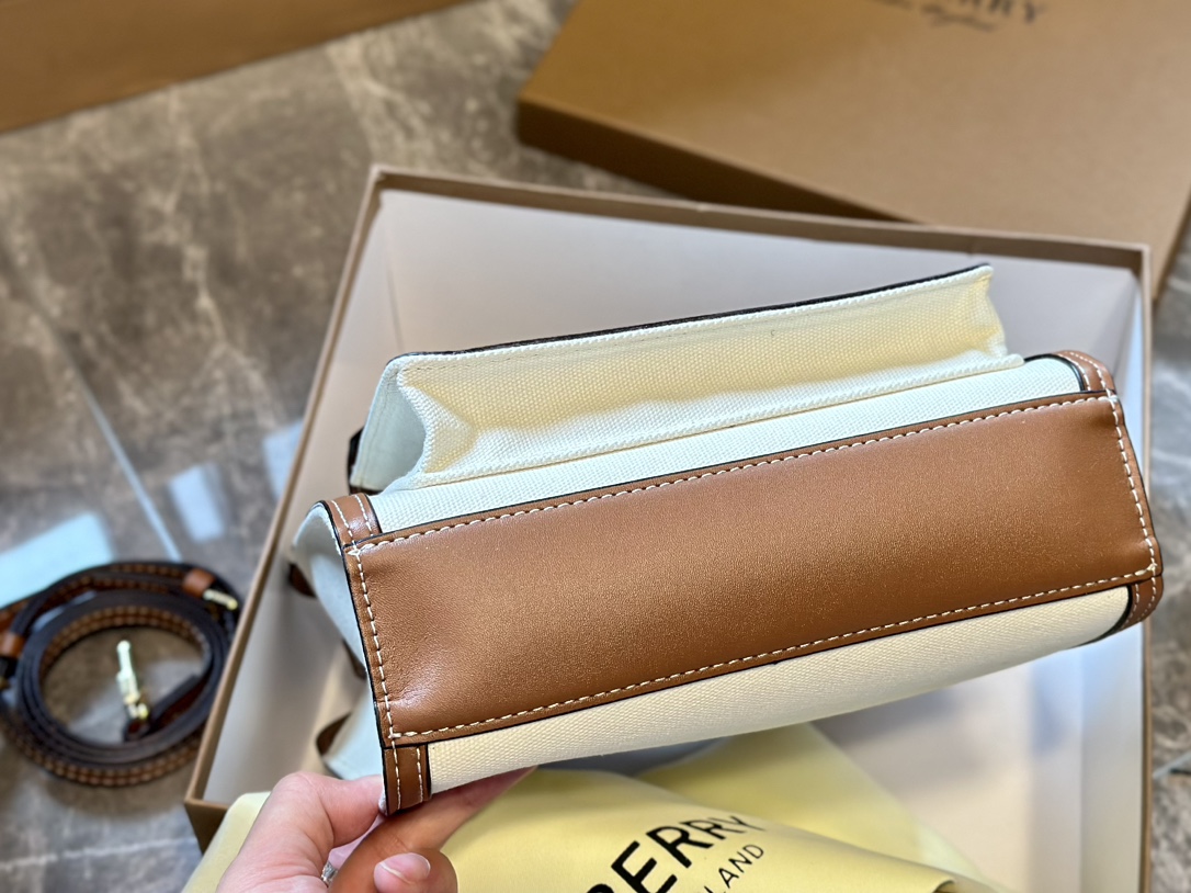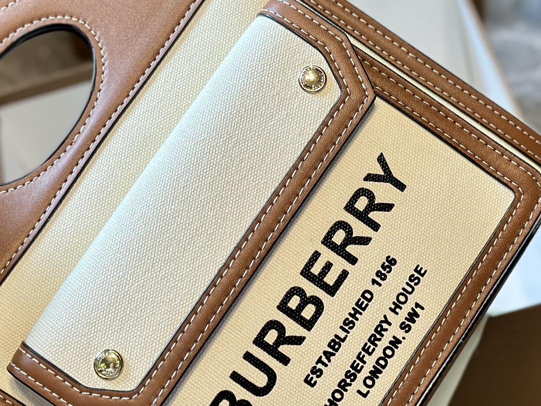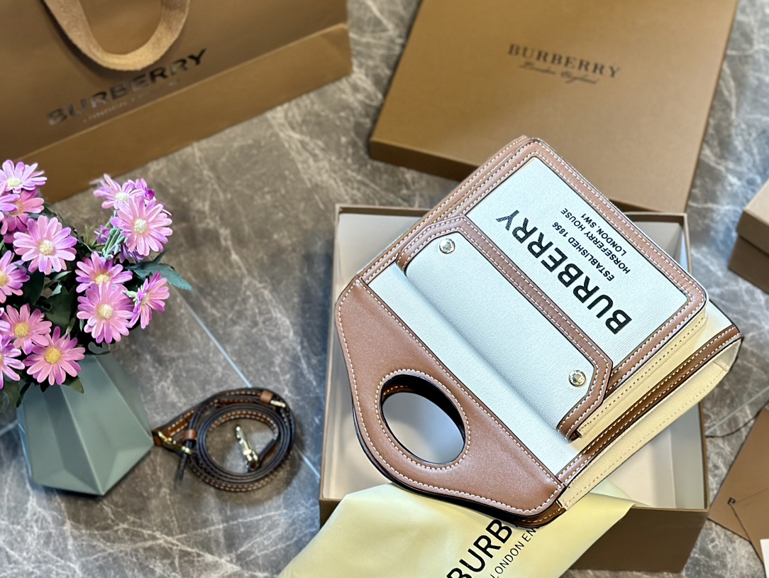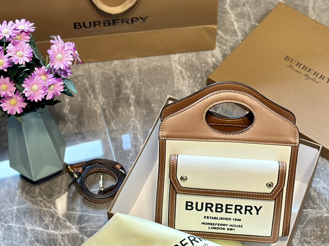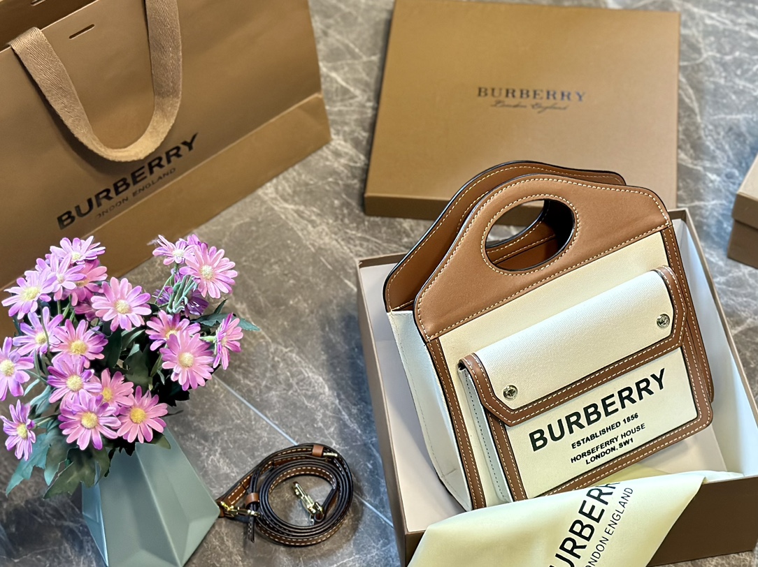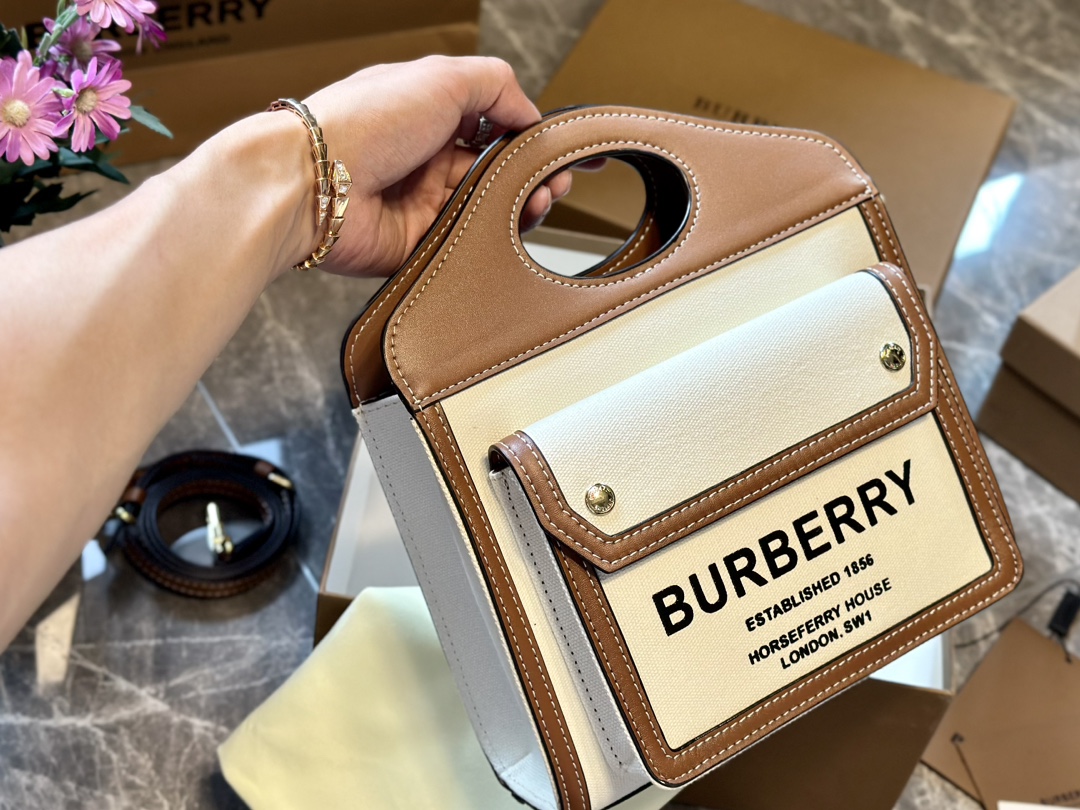 Burberry Hard-to-find Bag BURBERRY is simply too beautiful, with a textured brown canvas blend that is retro yet casual. The most distinctive feature of this series must be this [pocket bag]. The bag shape is not seen in other brands, making it highly recognizable. The bag is very lightweight, the strap is detachable, and it can be worn in various ways. Because it's made of canvas, the price is particularly attractive. Dimensions: 22 25cm