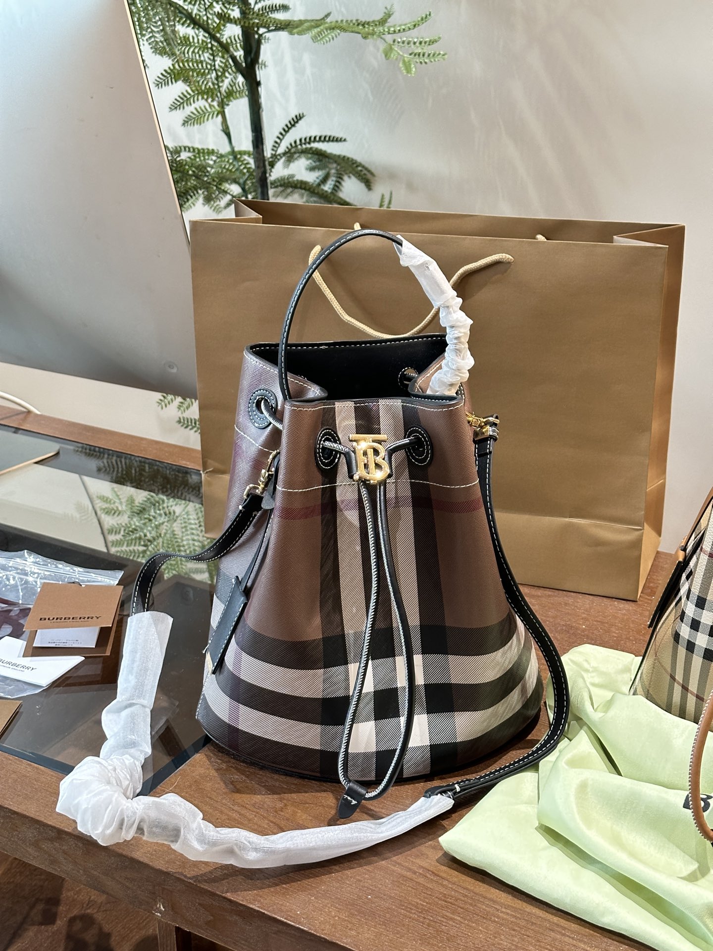 Burberry | Bucket Bag Inspired by the drawstring bucket bag of champagne barrels from the medieval period, adorned with Burberry check pattern, incorporating the exclusive TB logo design. 25×30