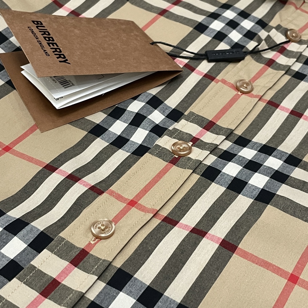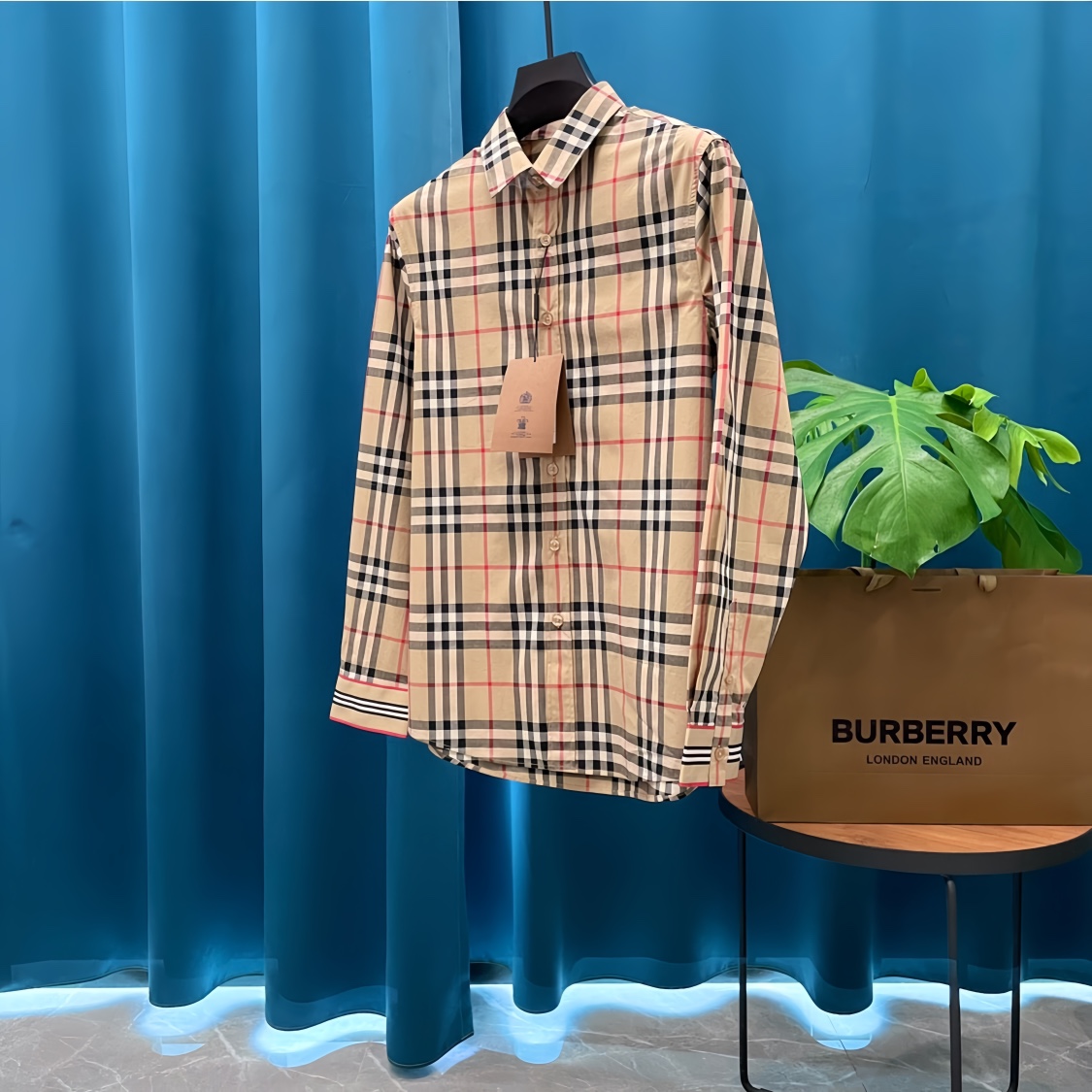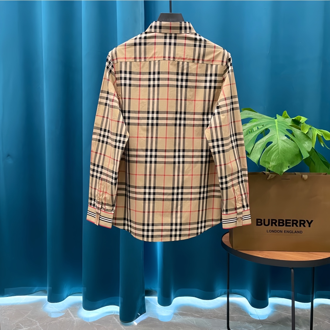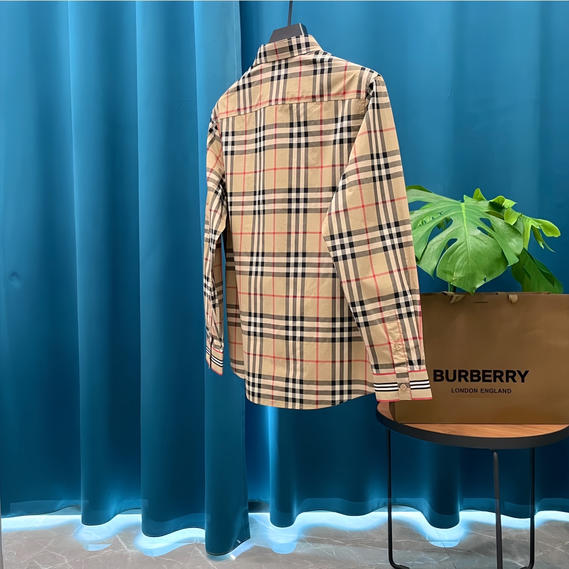 Burberry long sleeve shirt with cuffed woven tape. Original pattern adjustment, 100% cotton checkered fabric. Precise cutting, aligned placket and sleeves. Imported sewing equipment, neat stitching. Comes with spare buttons and original logo packaging. Unisex. Sizes: S-3XL.