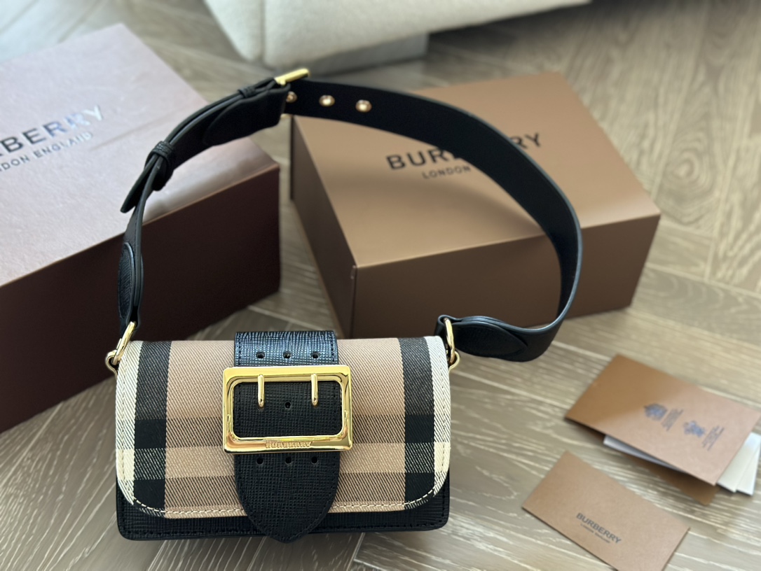 Burberry plaid house buckle bag, small crossbody with adjustable strap. Classic, roomy, and stylish for all seasons.
