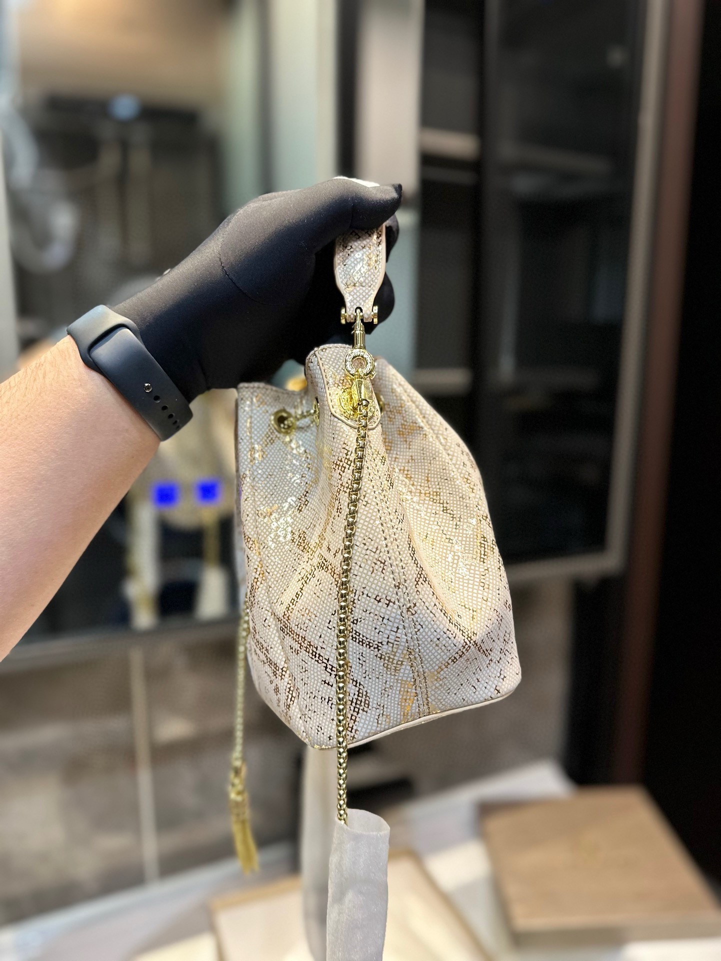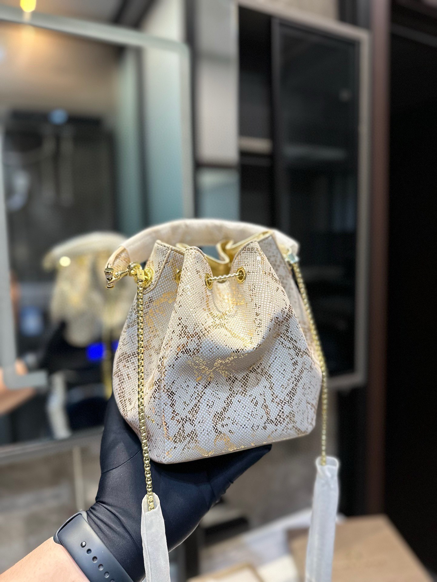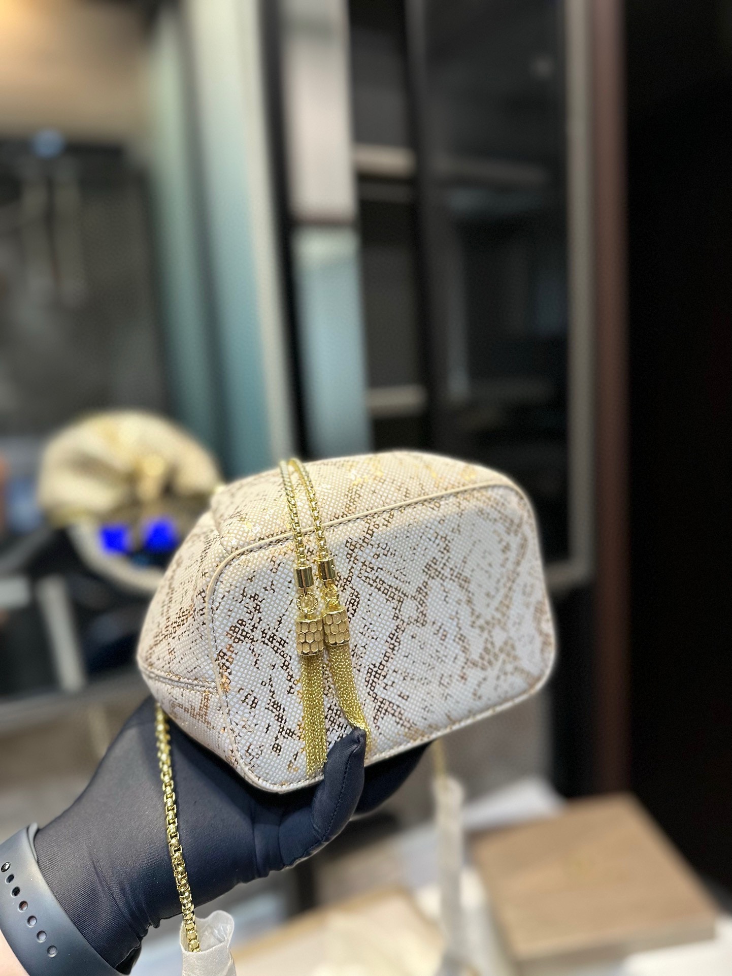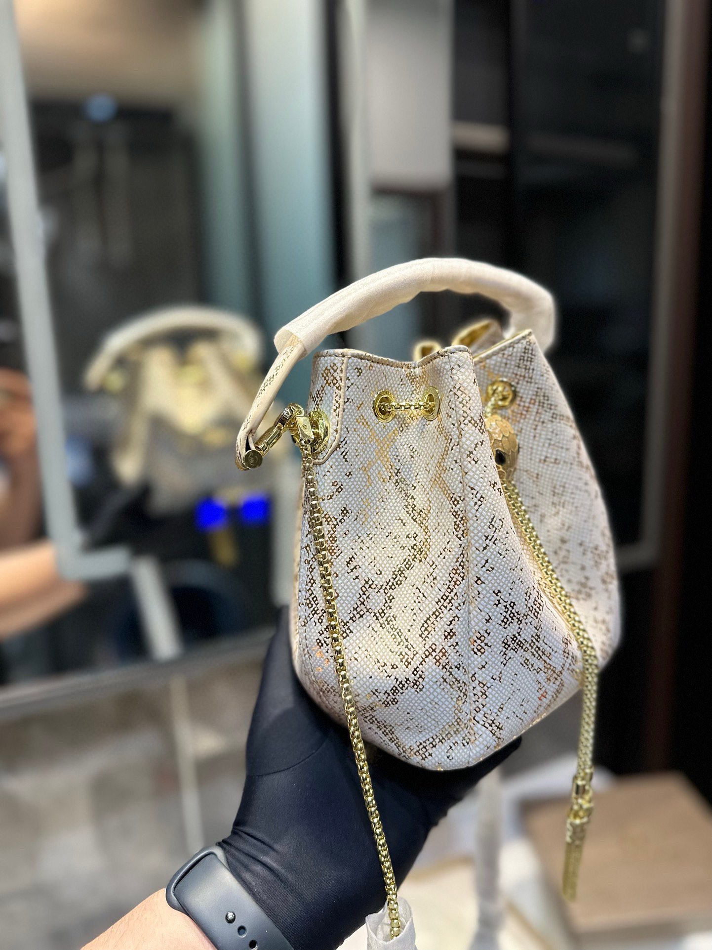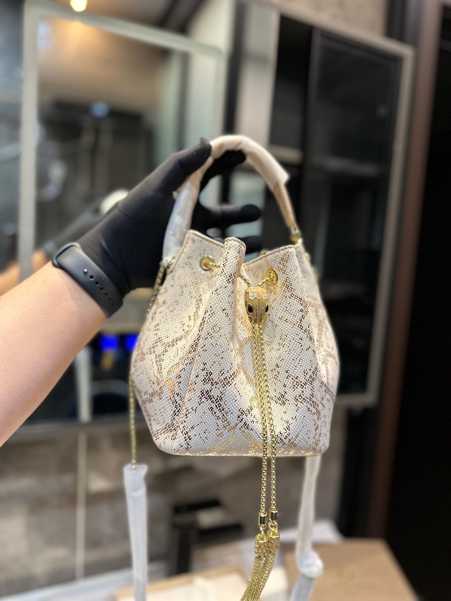 Bvlgari bucket bag, small and lovely, sparkling and exquisite. Genuine leather, elegant chain. Size: 16.5*19cm.