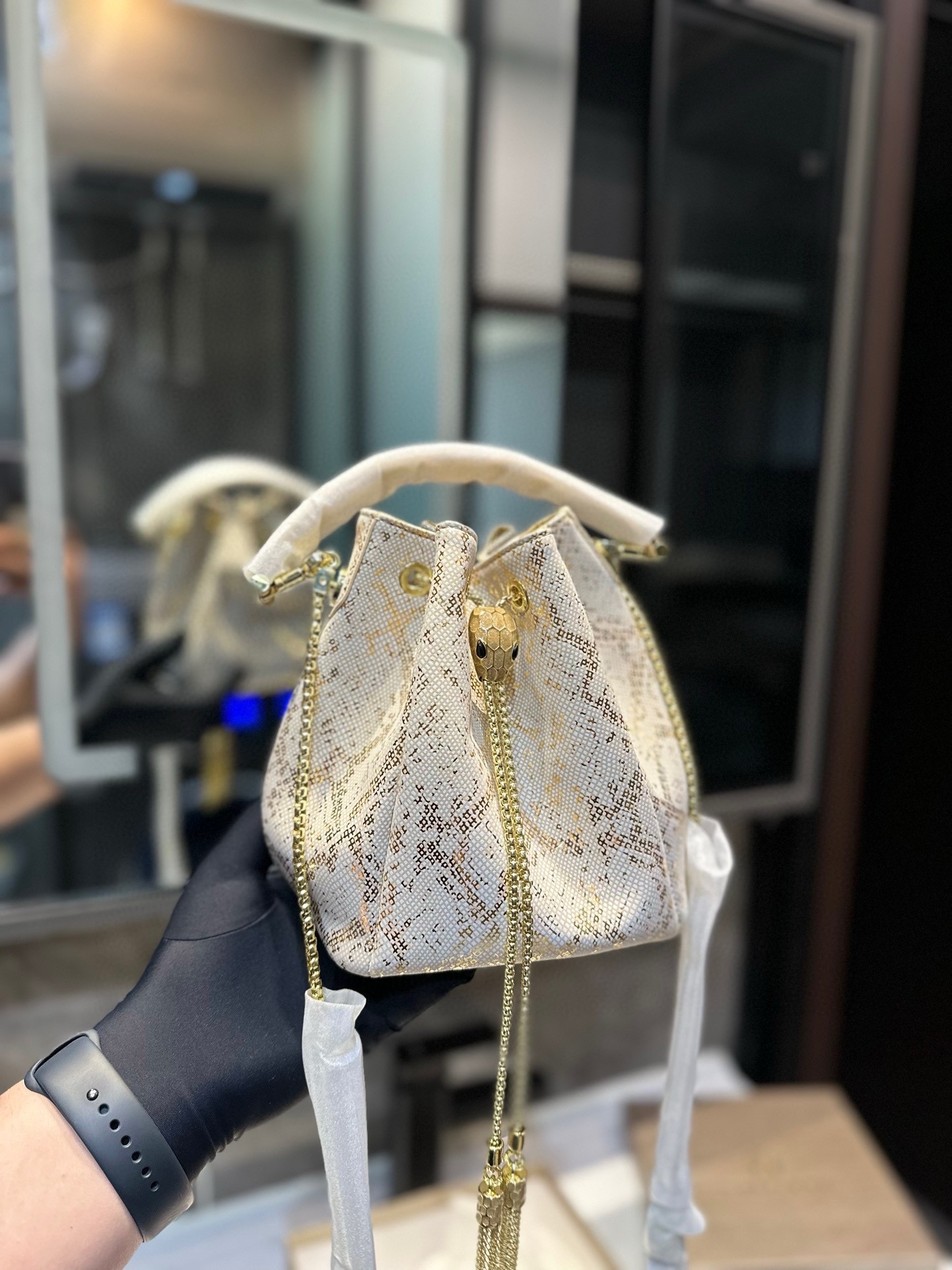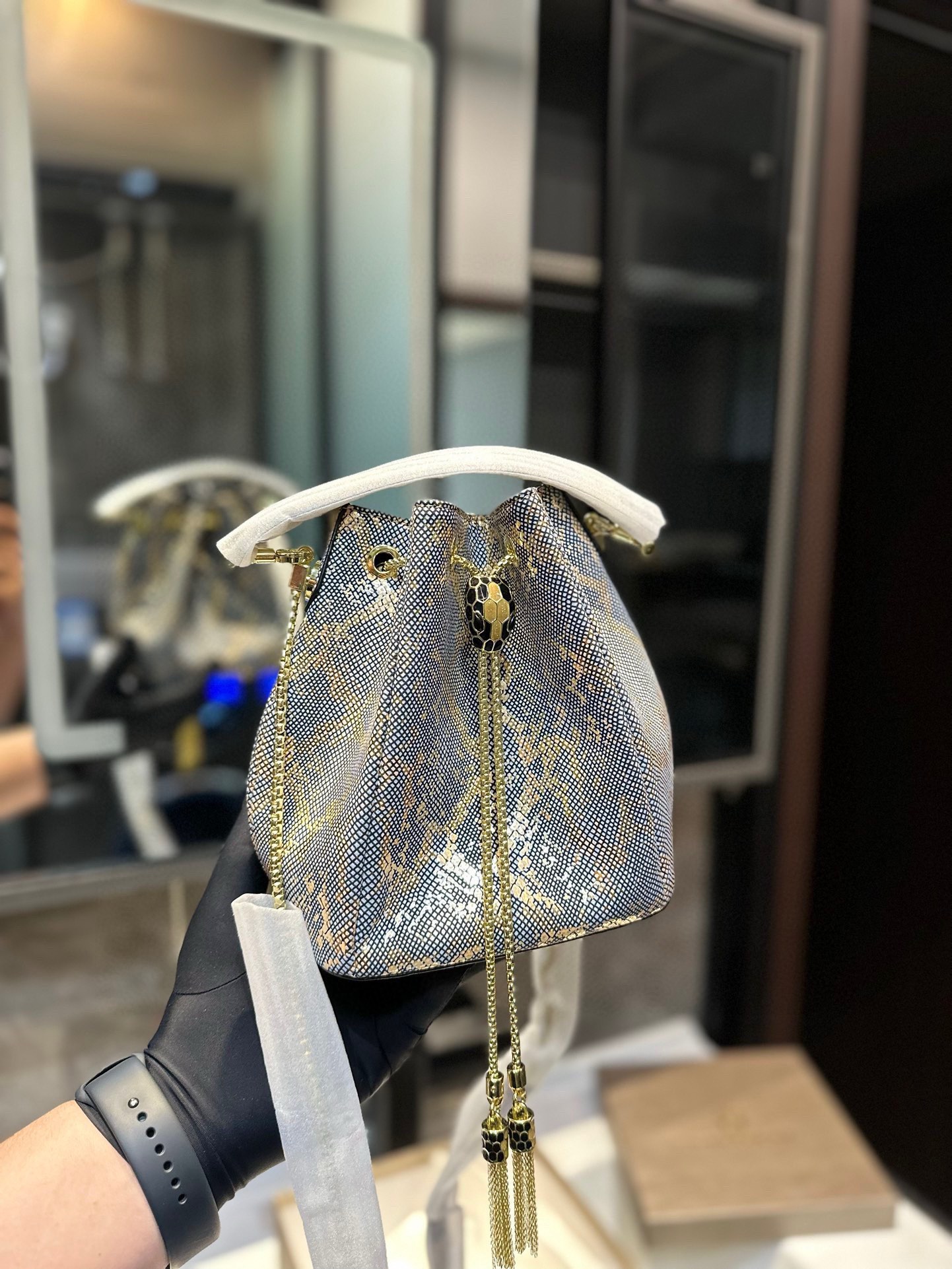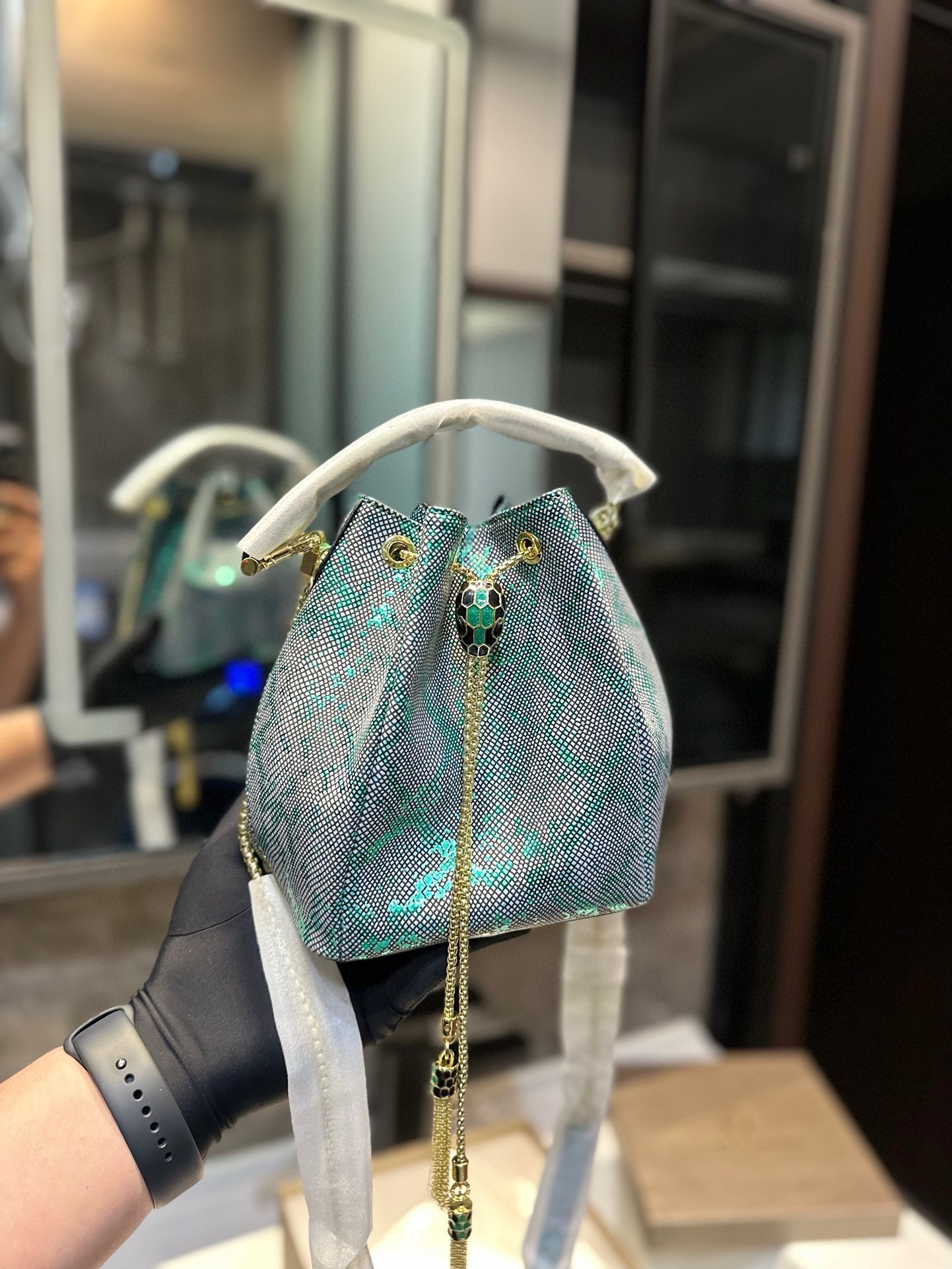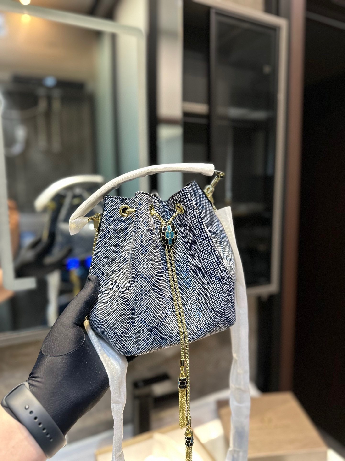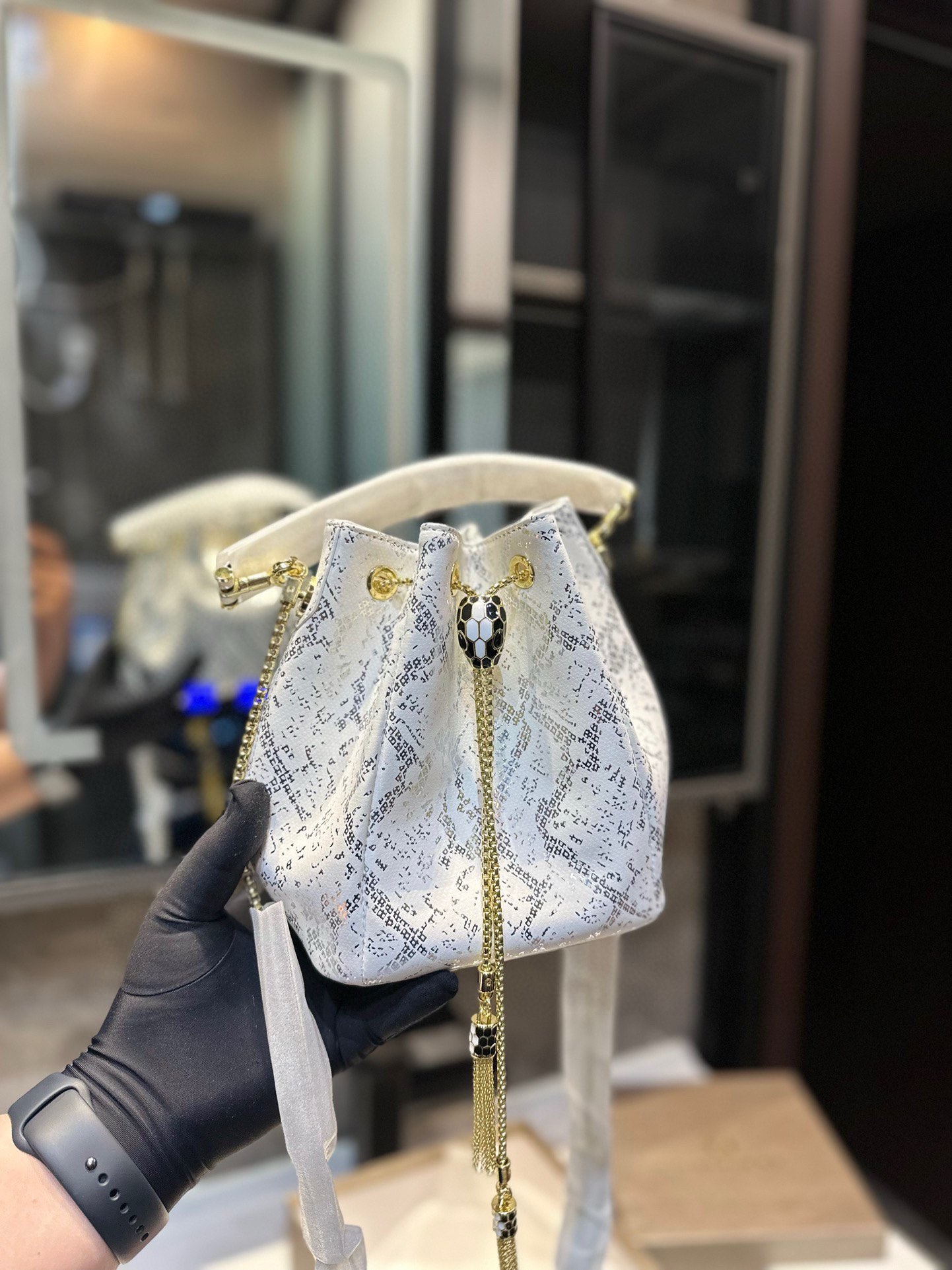 Bvlgari bucket bag, small and lovely, sparkling and exquisite. Genuine leather, elegant chain. Size: 16.5*19cm.