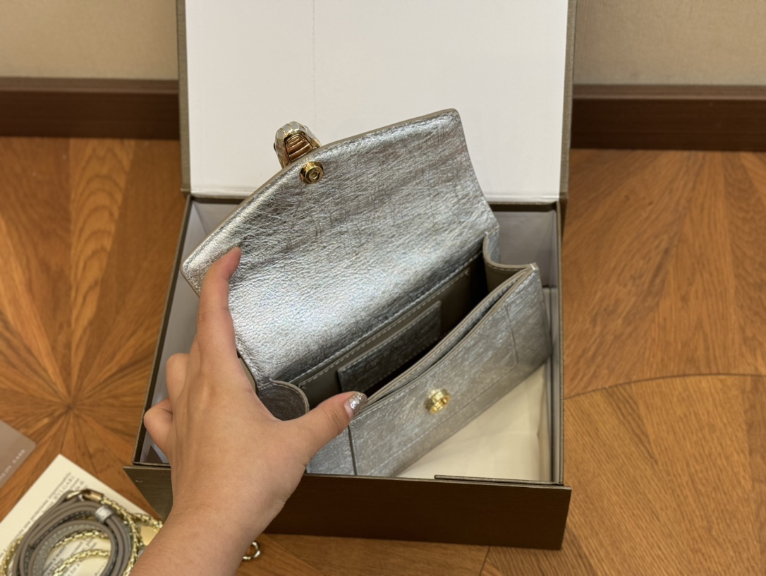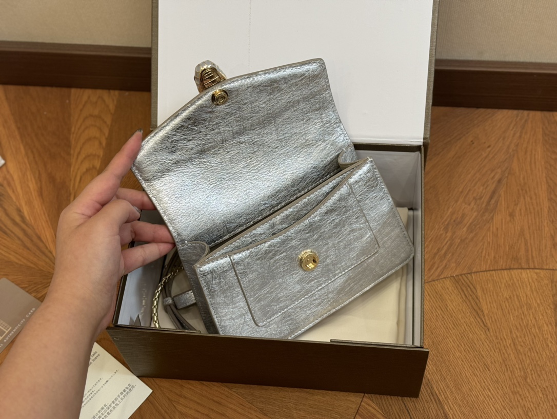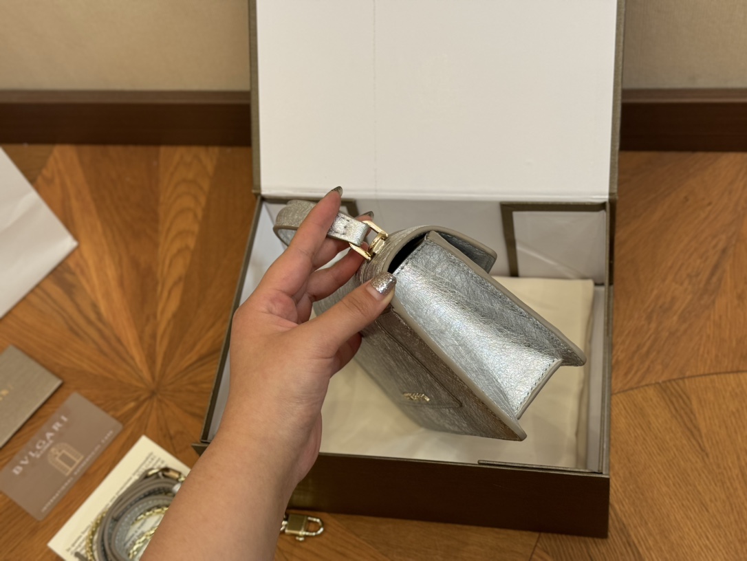 Bvlgari classic leather foldable box with snakehead clasp and chain. Size: 19.13cm.
