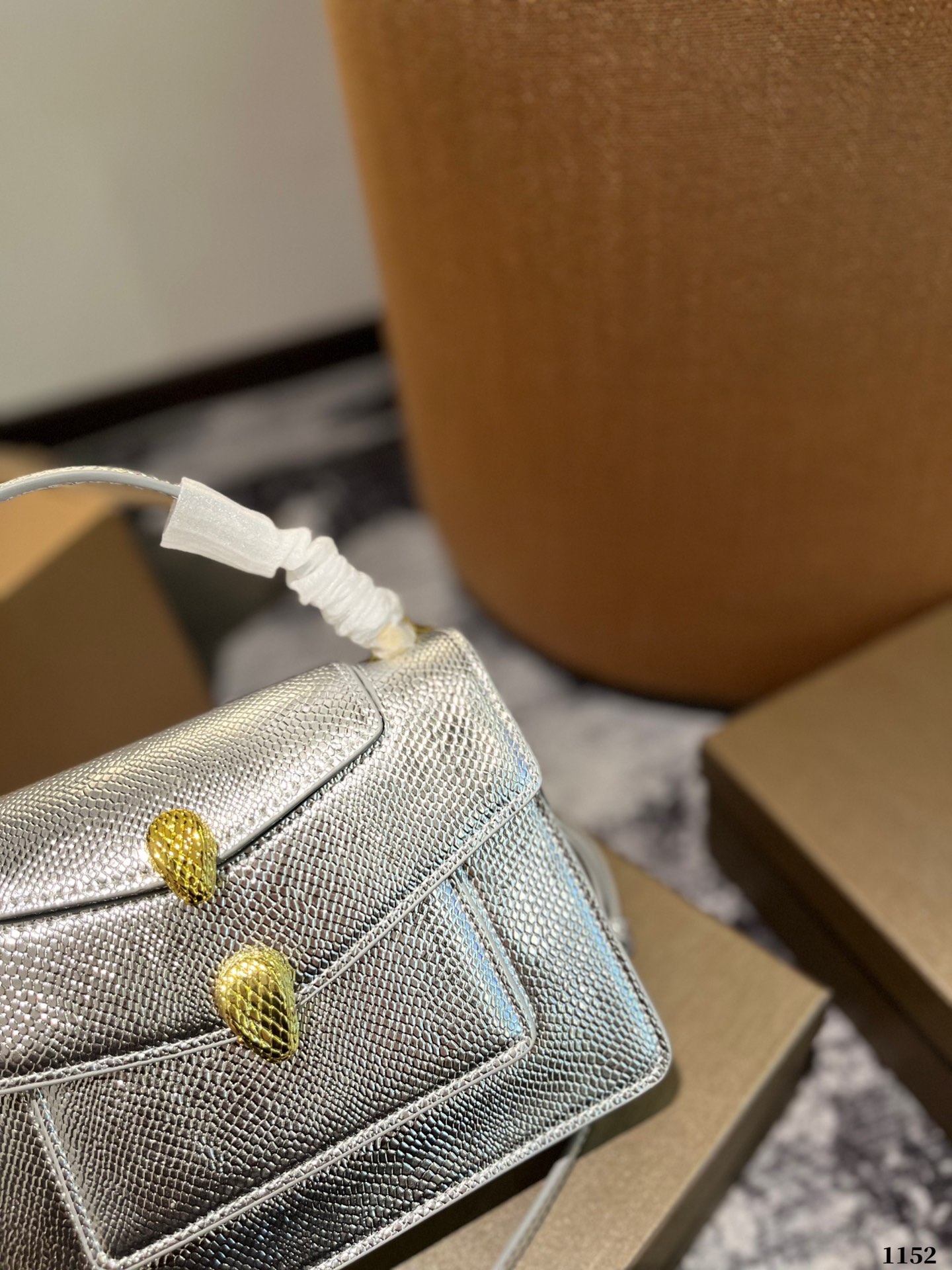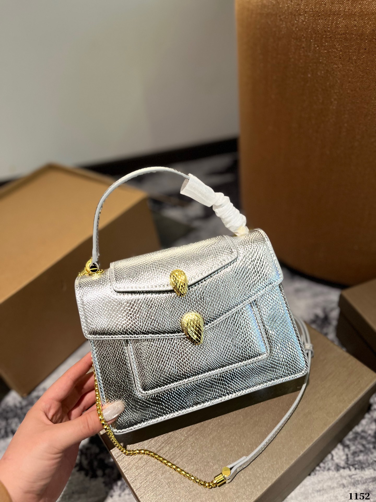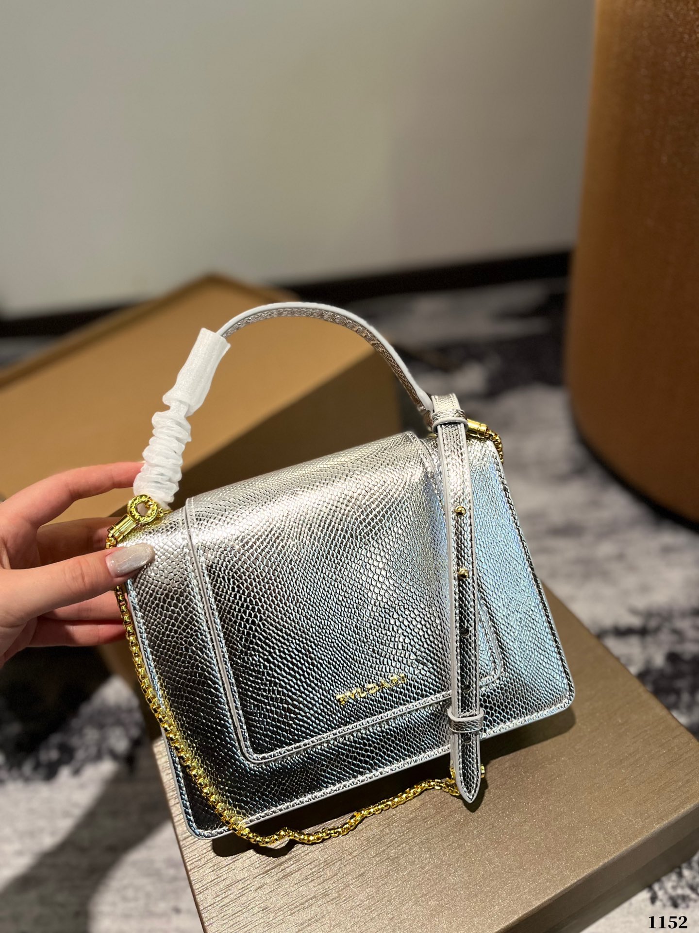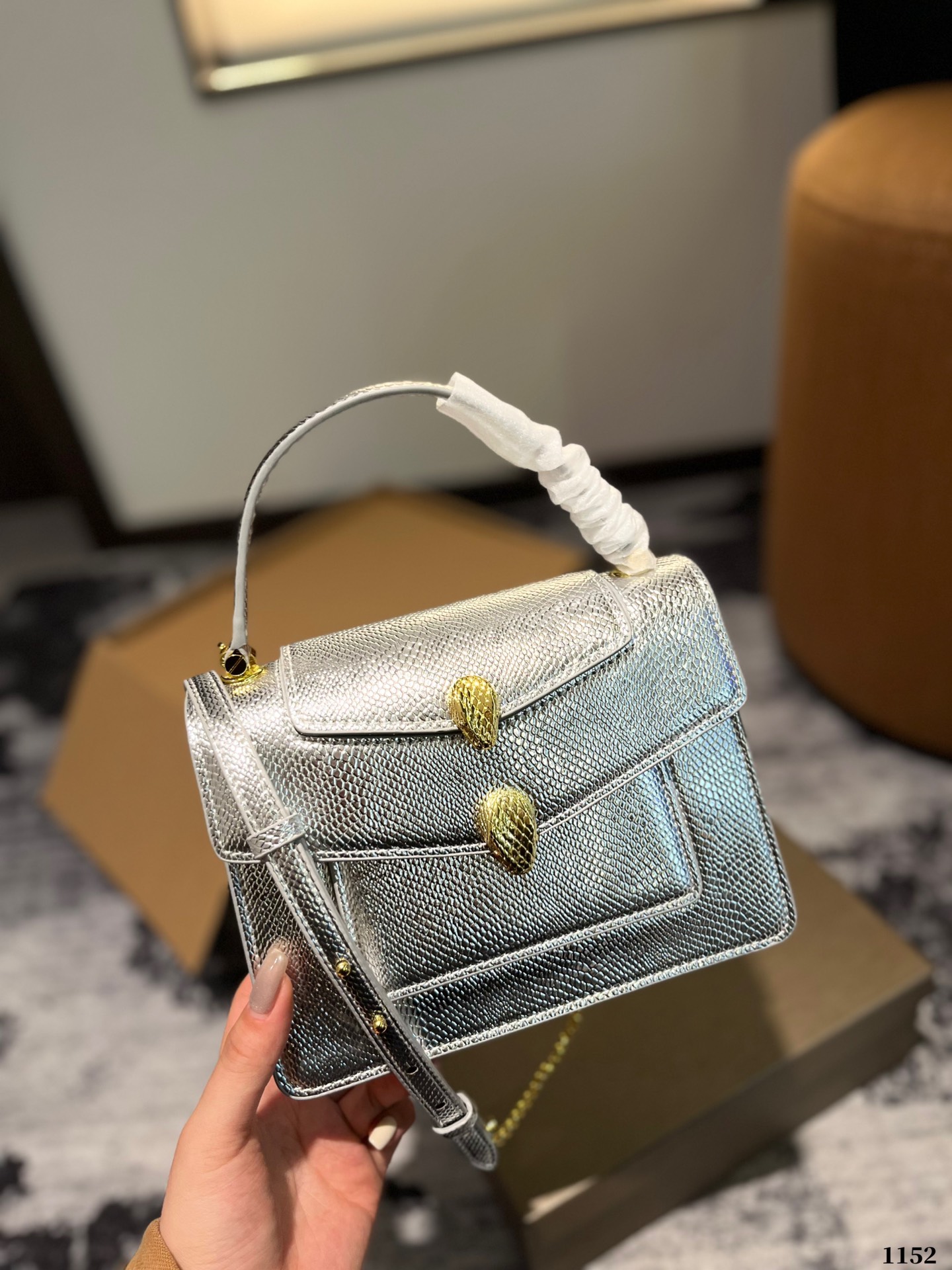 Bvlgari adds unique colors to the BVLGARI world with vibrant and exquisite handbags and beautiful shawl gift sets. This "Serpenti Cabochon" series shoulder bag features a soft and colorful calfskin flap and back, inspired by the enchanting surface of cabochon-cut gemstones. The geometric pattern of Matelassé embossing makes this bag even more distinctive. Paired with a thick chain and a comfortable leather shoulder strap, versatile and adaptable. Dimensions 21 15