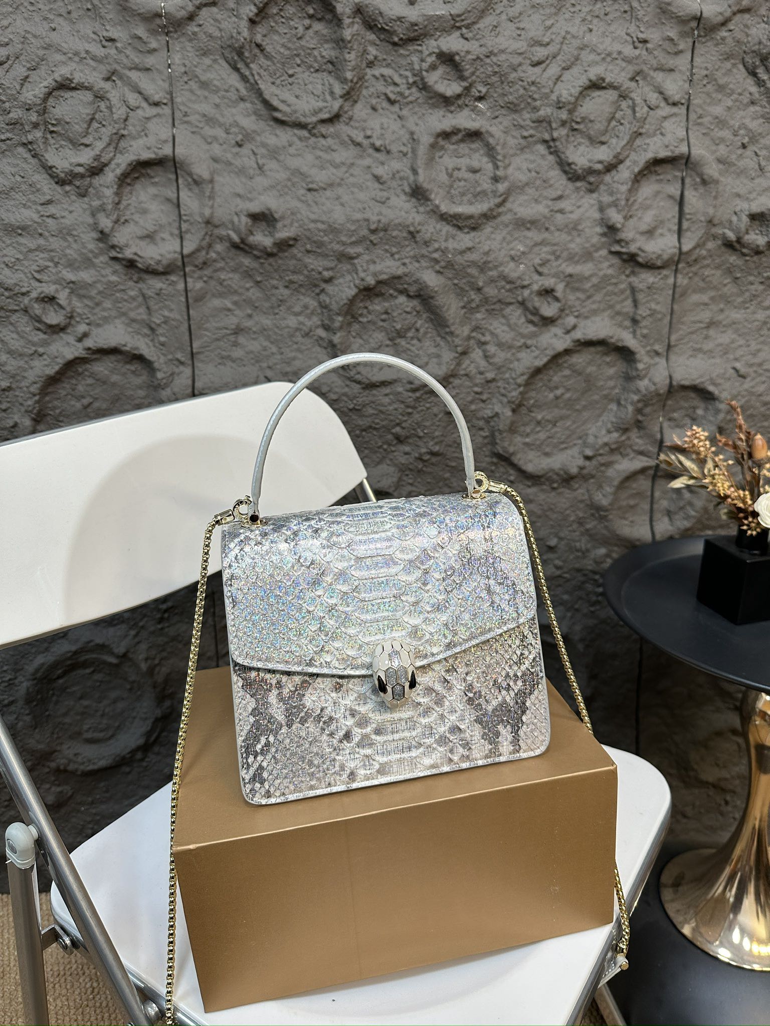 Bvlgari snake head bag with embossed leather and folding box. Recent innovations in colors and styles. Exudes luxury and elegance, compact size 20.17cm.