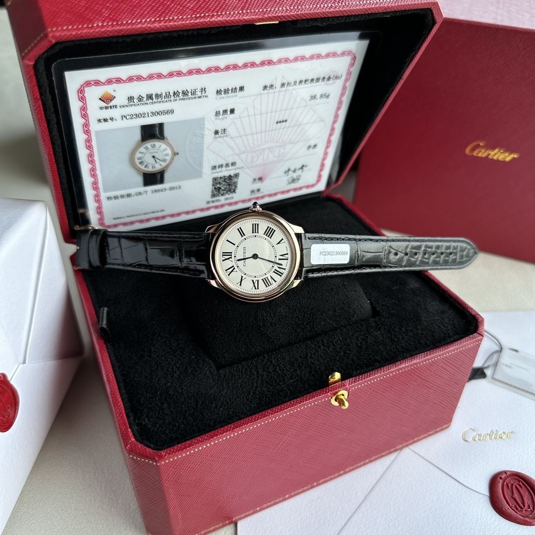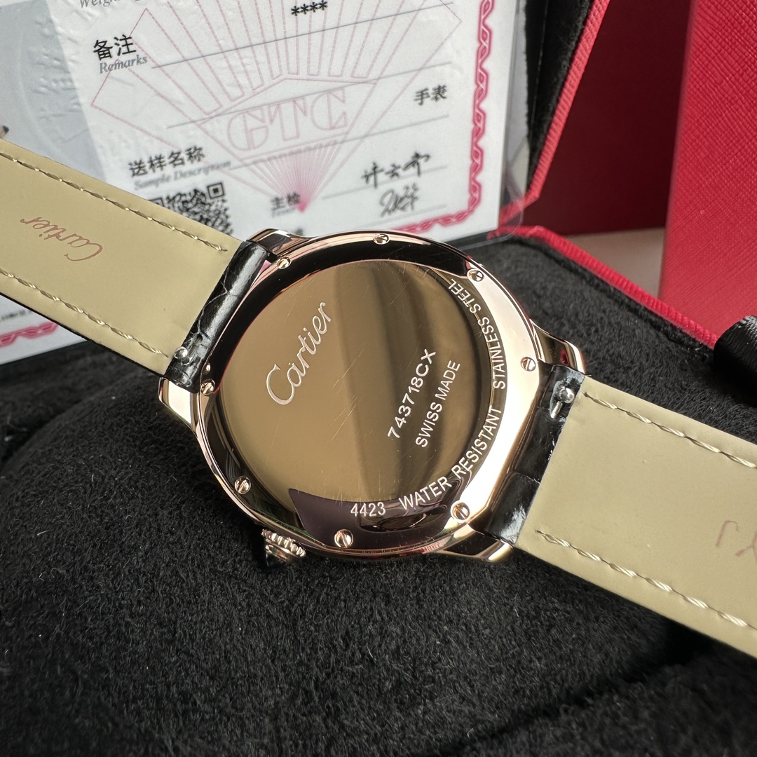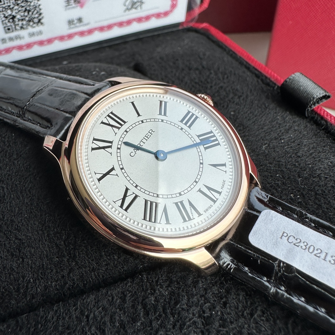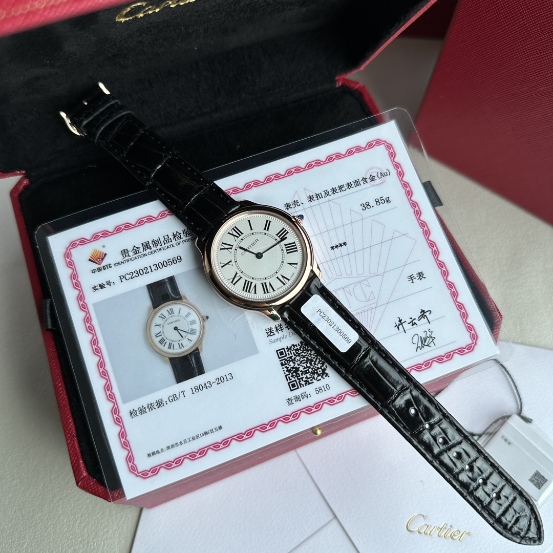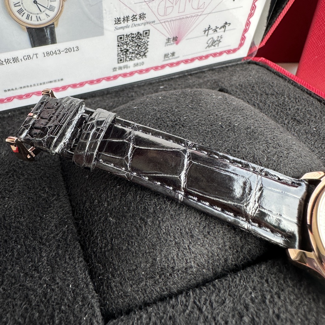 Cartier genuine 18k gold plating, matched with China GTC authoritative institution inspection certificate, one item one certificate, supports re-inspection! The case is made of full precious metal (fully gold-plated), with more rounded and delicate lines. Swiss original quartz movement Ronde Lonuis series watch, inheriting the classic rounded shape, with a more streamlined case and classic Roman numeral hour marker dial design, making a stunning return! Refreshed dial: the bezel is fuller and more rounded, the silver sandblasted dial is equipped with a seconds track minute circle, paired with sword-shaped blue steel hands and a convex sapphire crown! Exquisite and elegant, showcasing the watch's style. Dial diameter: 36mm. Dial thickness: 7.18mm. Classic black imported American alligator leather strap, equipped with Cartier 157 dedicated movement, both internally and externally flawless, welcome to compare the internal structure details! Recognize the details! Heavy gold version, quality and craftsmanship comparable to top-tier!