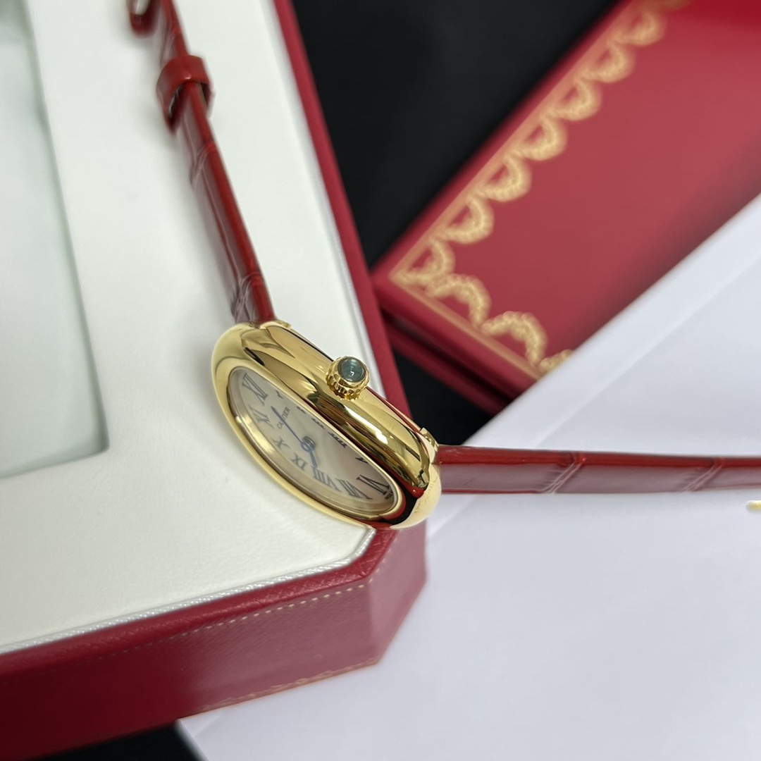 【Design】Features a distinctive oval shape inspired by the original bathtub design. The golden case is paired with Cartier's classic sapphire crown. Unlike the current silver-white dial, the vintage porcelain-white dial enhances the overall appearance, perfectly capturing classical beauty!