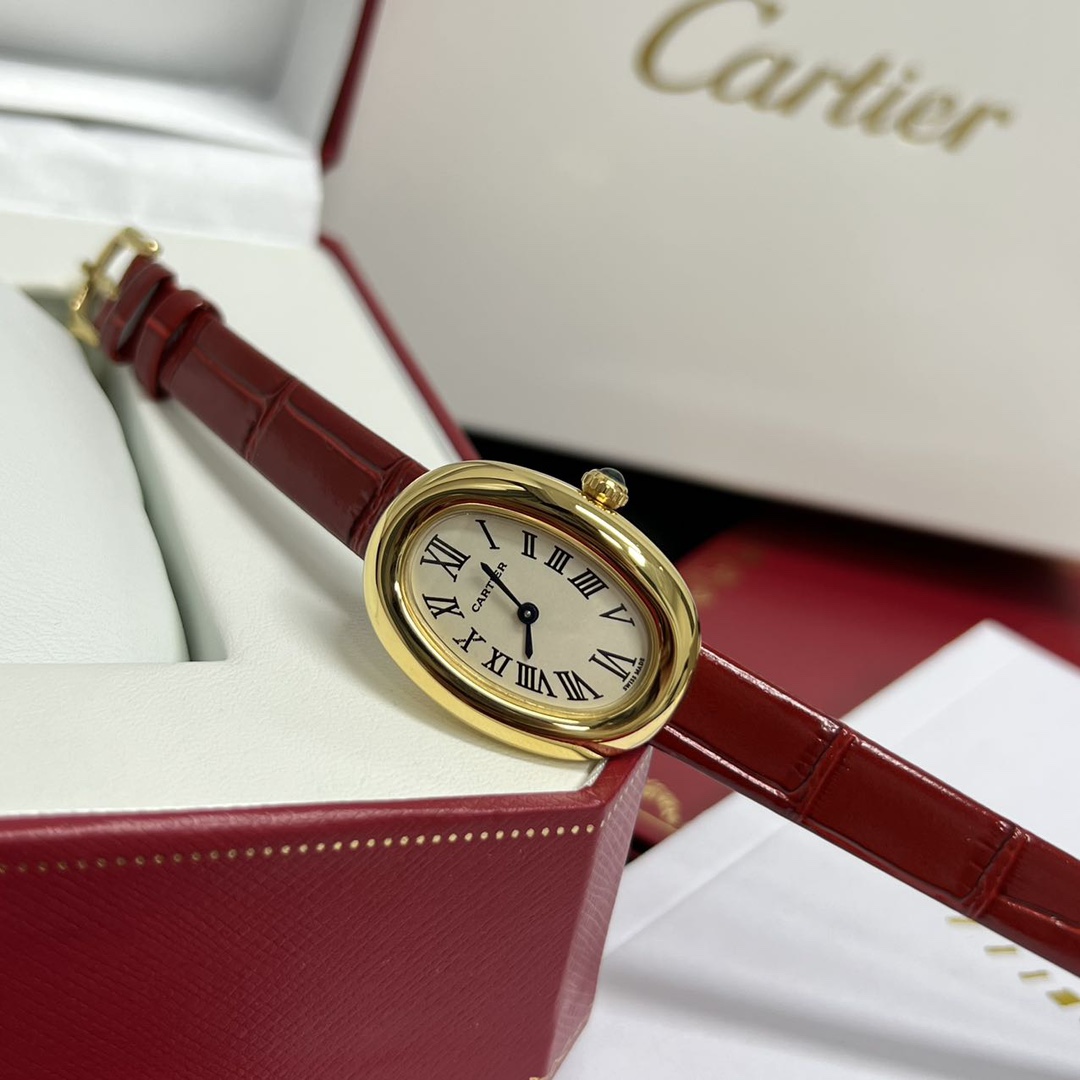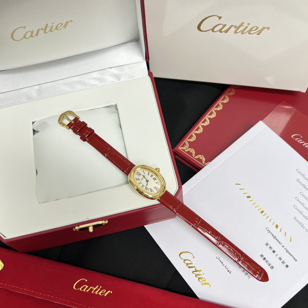 Cartier Baignoire watch with Swiss quartz movement and elegant oval design. Features gold case, sapphire crystal, and leather strap. Multiple colors available.