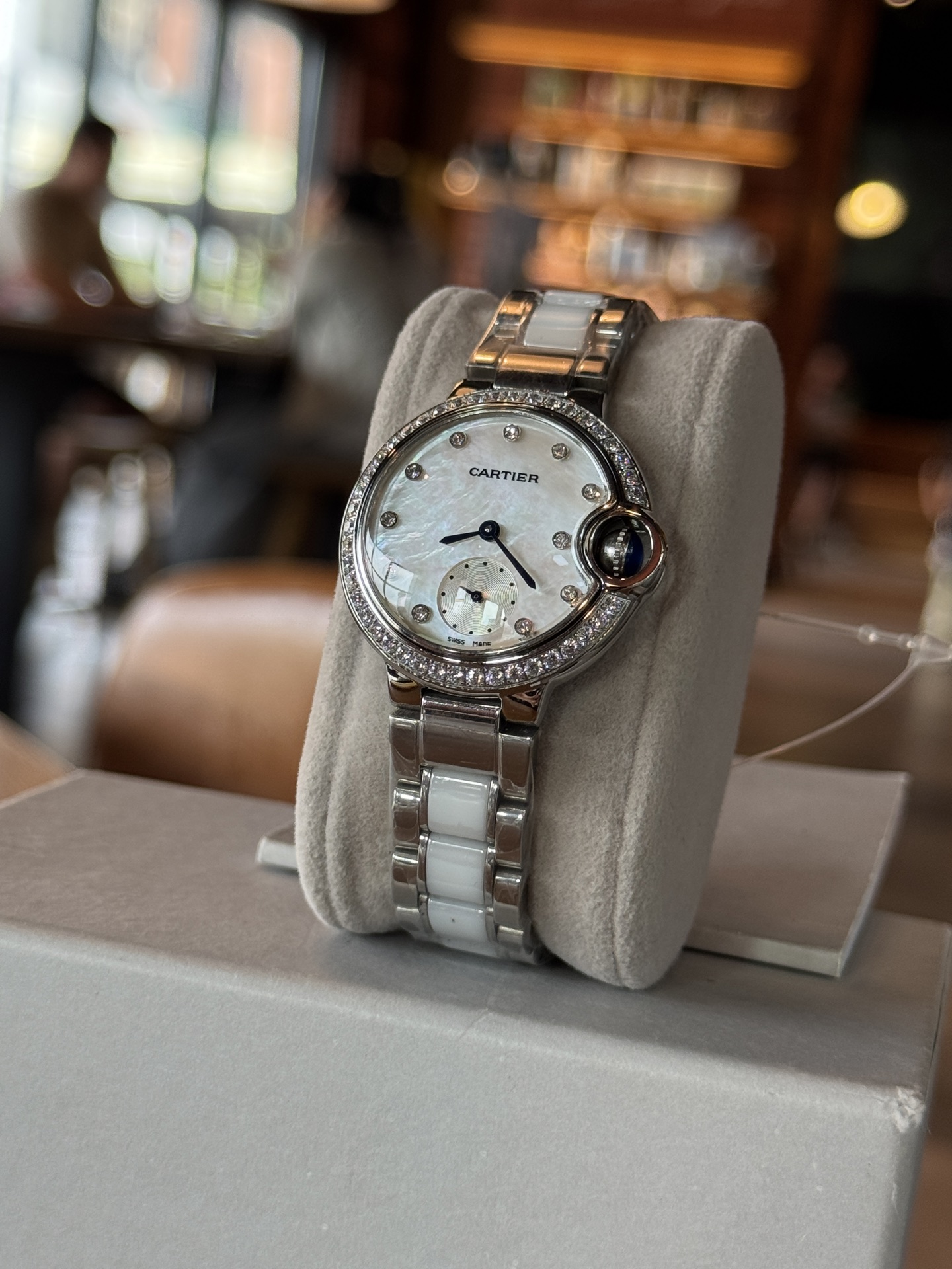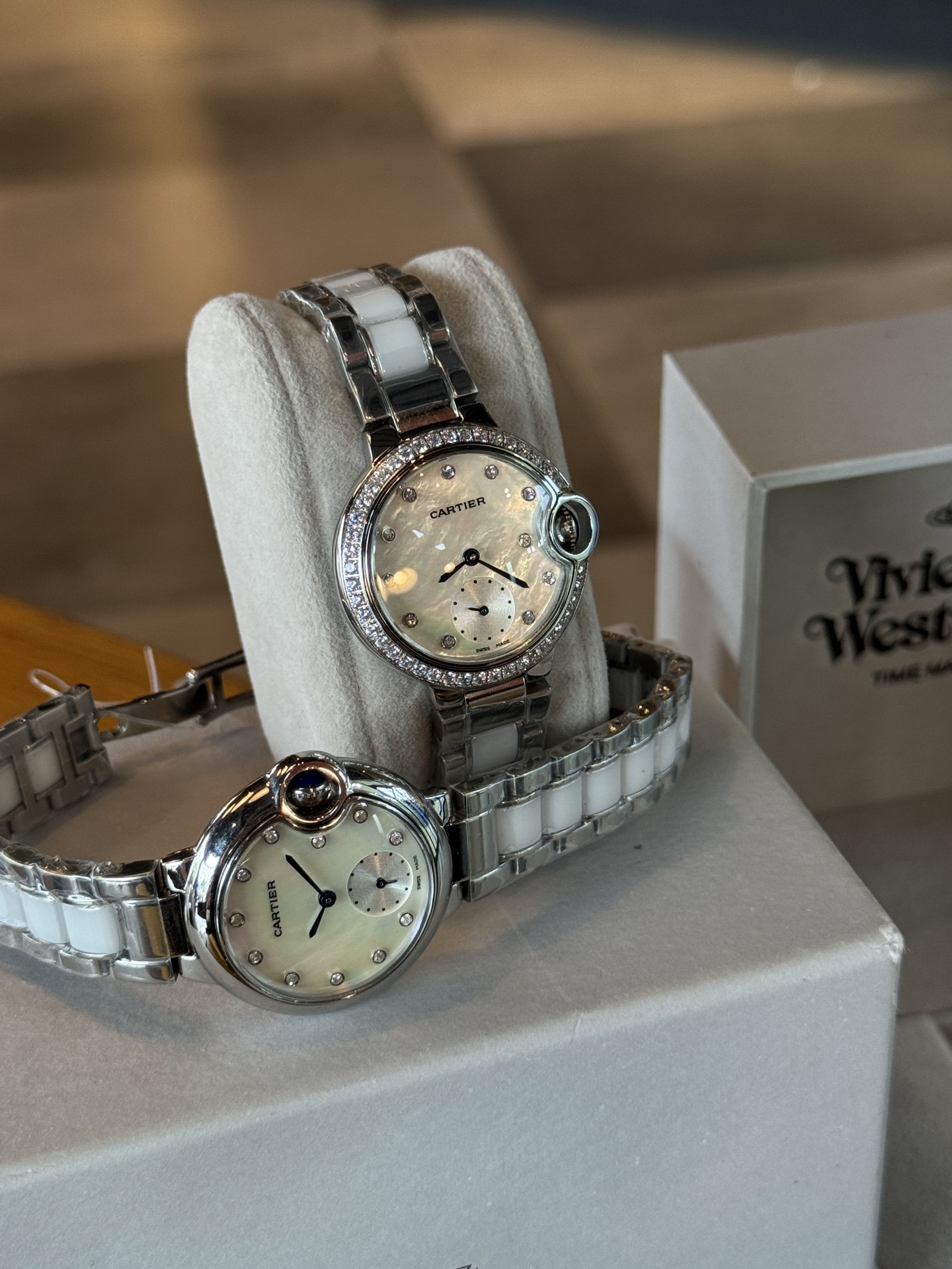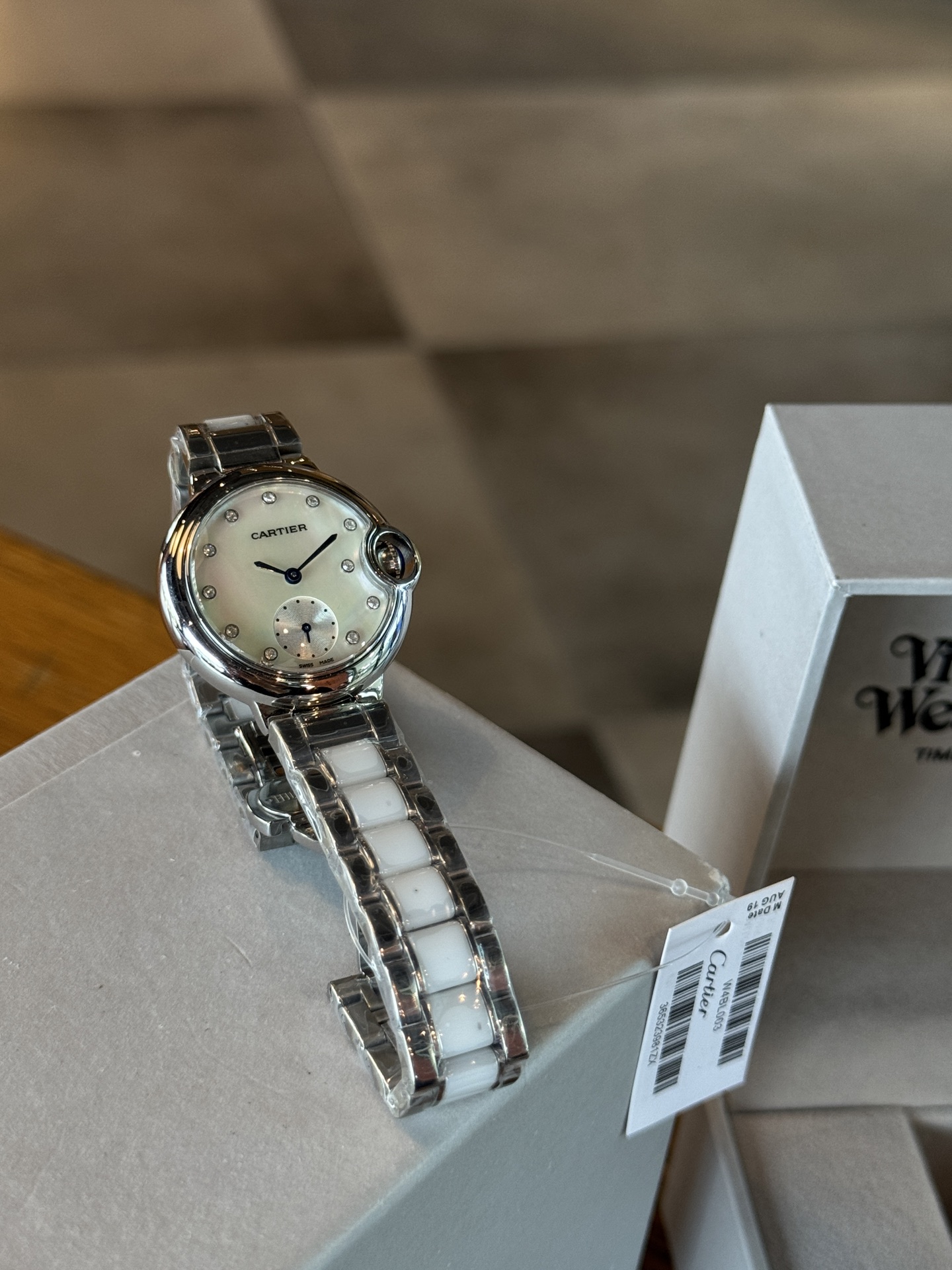 Cartier Blue Balloon watch, 33mm quartz, classic three-hand design, Swiss movement, alligator strap, full packaging.