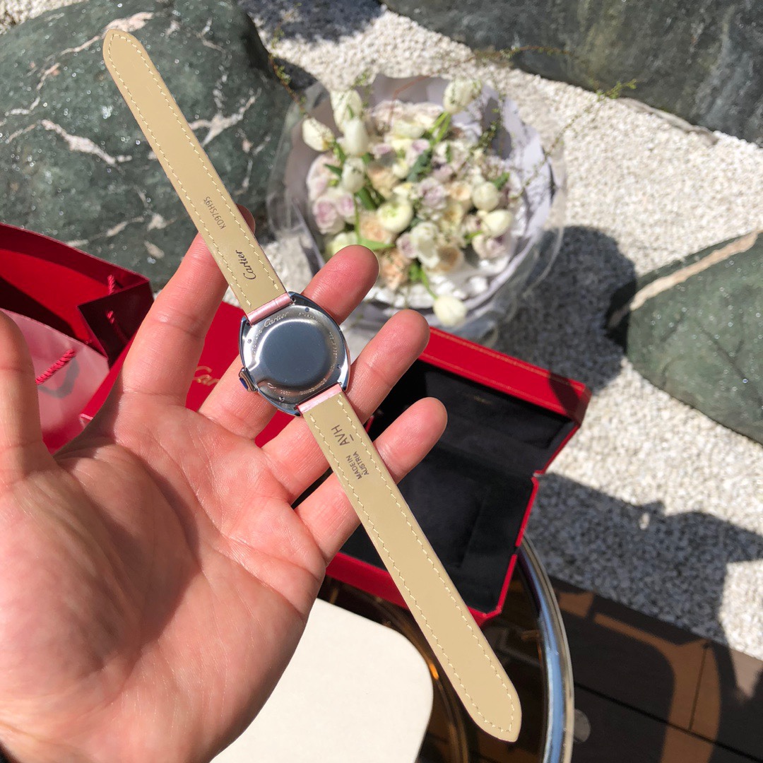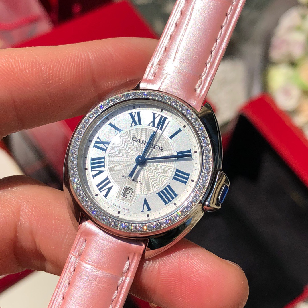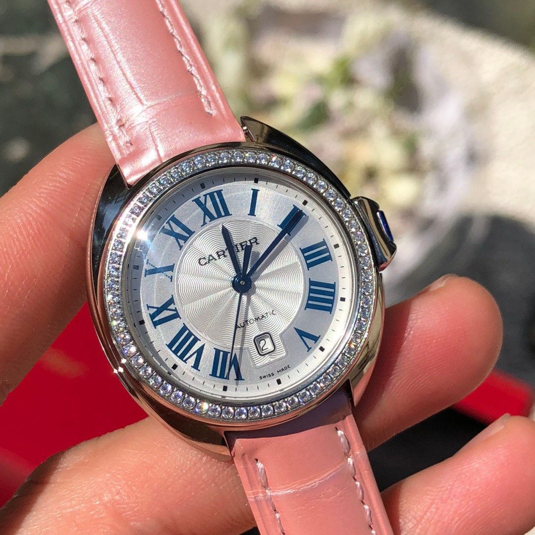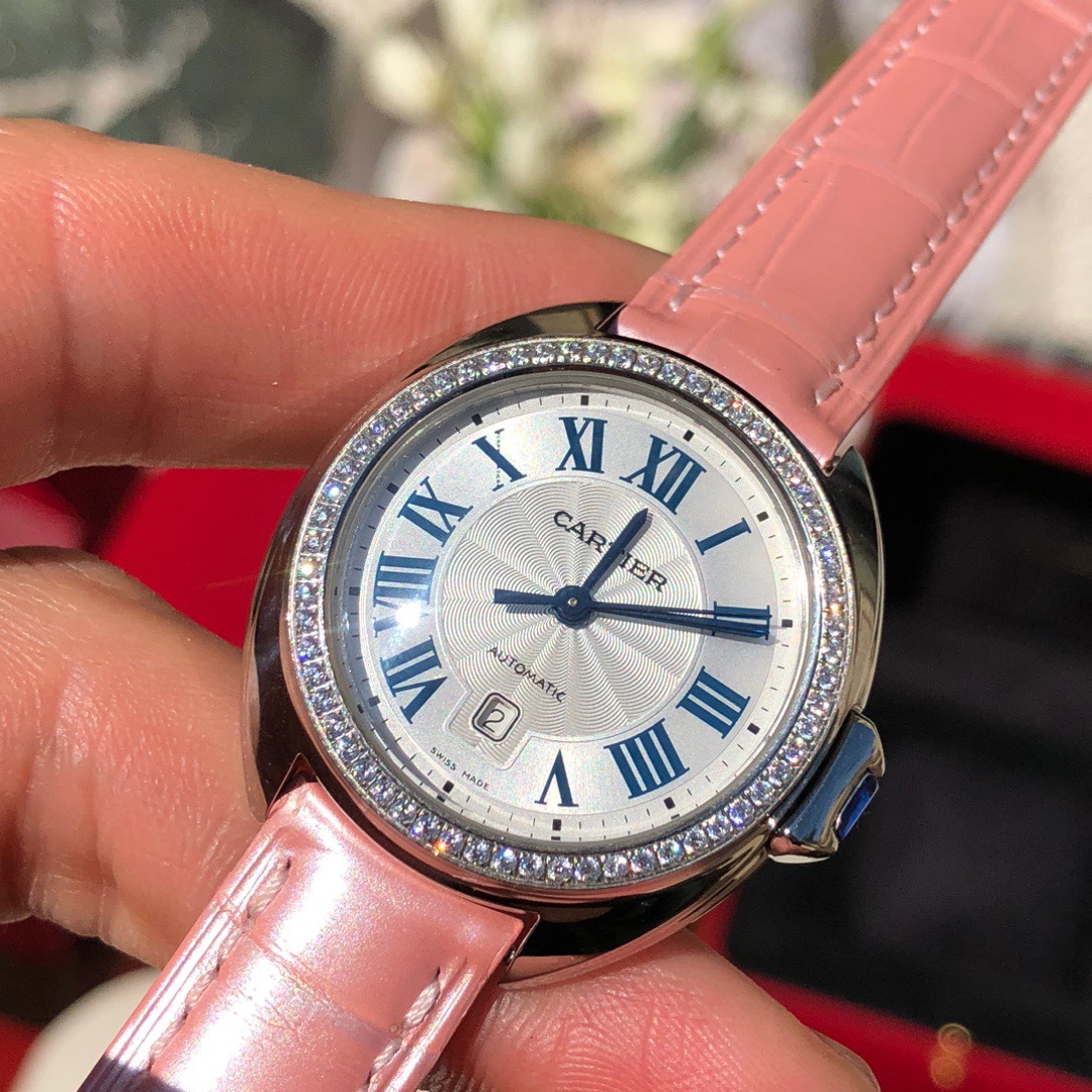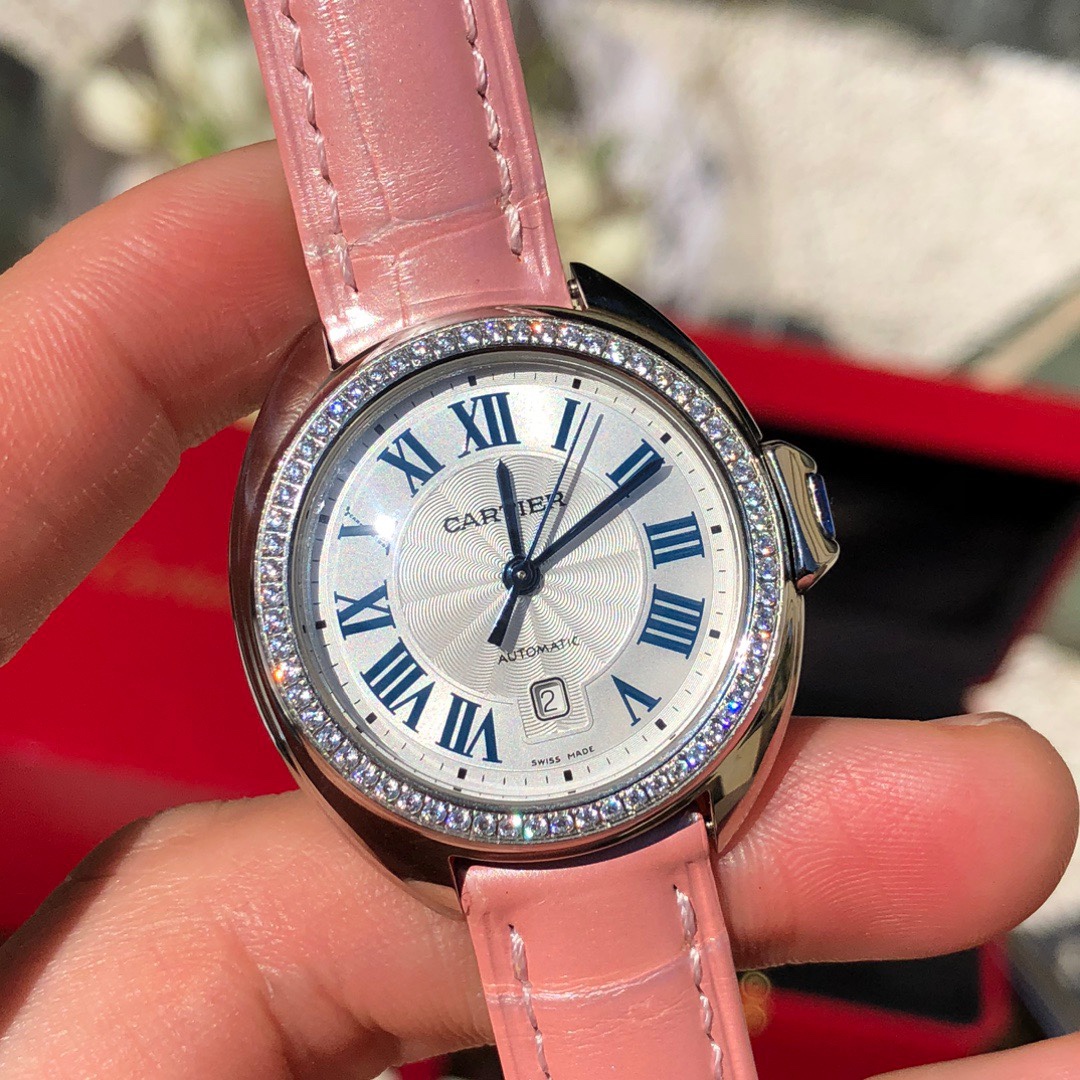 Model 1: Rainbow-colored pink strap with fully diamond-studded bezel Dazzling and eye-catching CLÉ DE CARTIER Cartier Key Watch, 31mm model, self-winding mechanical movement. Stainless steel case, key-shaped crown set with a synthetic spinel. Stainless steel bezel set with 61 brilliant-cut round diamonds, total weight 0.39 carats. Silvered guilloché dial with sunray finish, blued steel sword-shaped hands, sapphire crystal, pink alligator leather strap, stainless steel folding buckle. Case thickness: 11mm. Water-resistant to 3 bar (approximately 30 meters). Original title: Model 1: Rainbow-colored pink strap with fully diamond-studded bezel Dazzling and eye-catching CLÉ DE CARTIER Cartier Key Watch, 31mm model, self-winding mechanical movement. Stainless steel case, key-shaped crown set with a synthetic spinel. Stainless steel bezel set with 61 brilliant-cut round diamonds, total weight 0.39 carats. Silvered guilloché dial with sunray finish, blued steel sword-shaped hands, sapphire crystal, pink alligator leather strap, stainless steel folding buckle. Case thickness: 11mm. Water-resistant to 3 bar (approximately 30 meters).