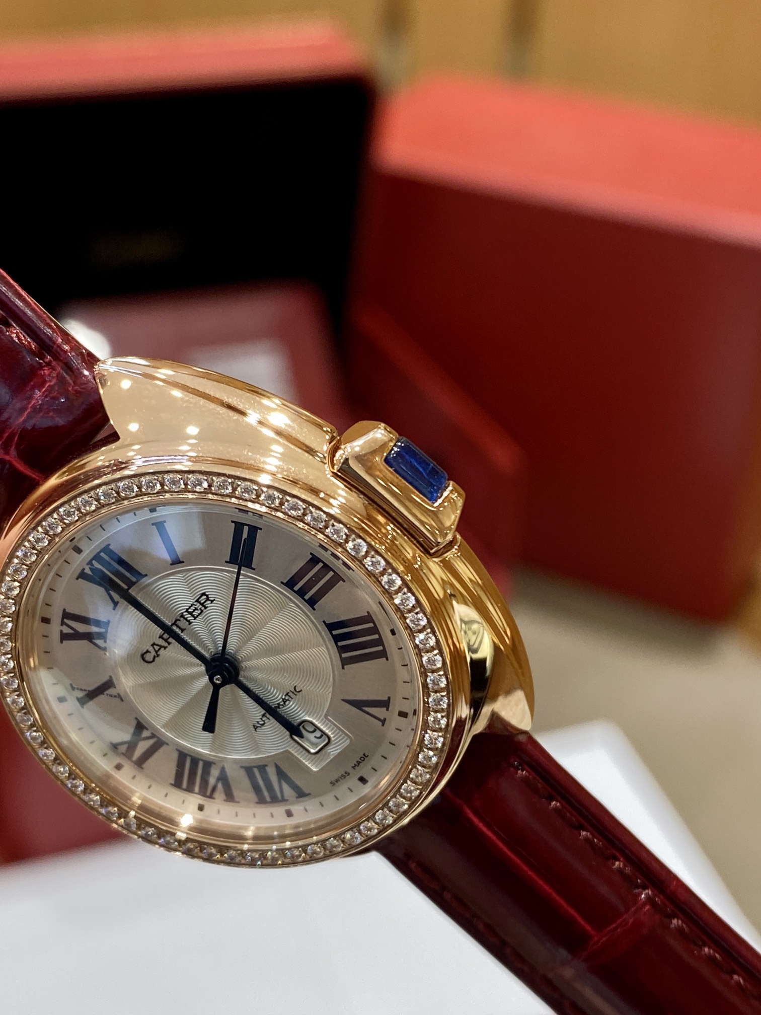 Cartier Key series watch retains classic design with Arabic numerals, sword-shaped hands, and sapphire crown. Features guilloché dial, sunburst pattern, date window, crocodile strap, automatic movement, 316 steel case, 31mm size. Versatile and high value.