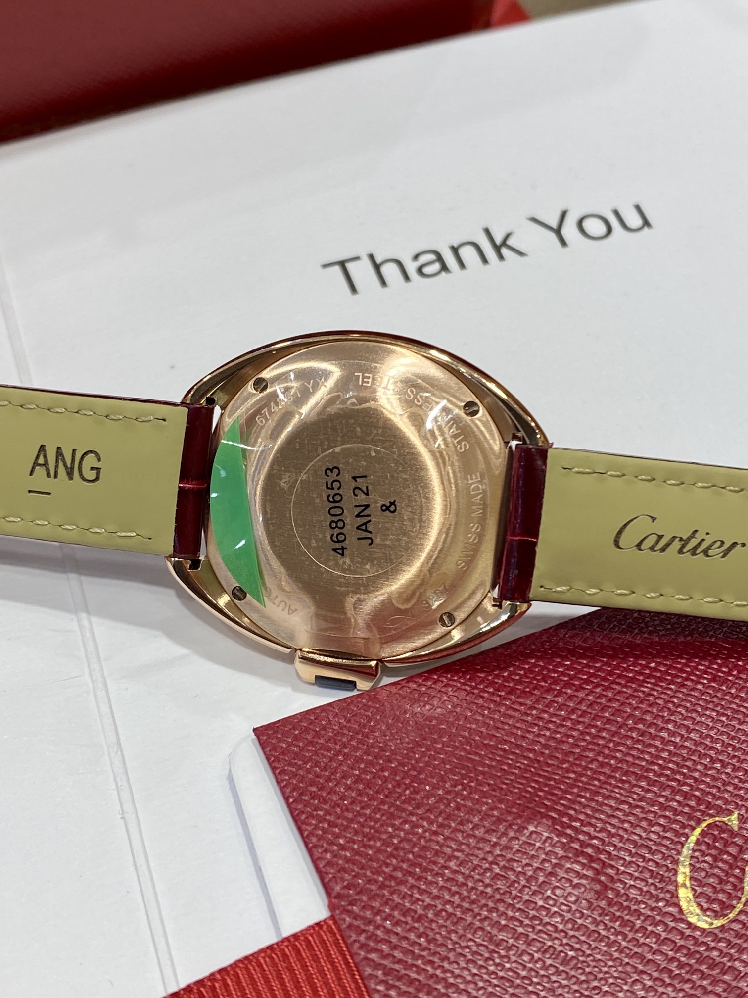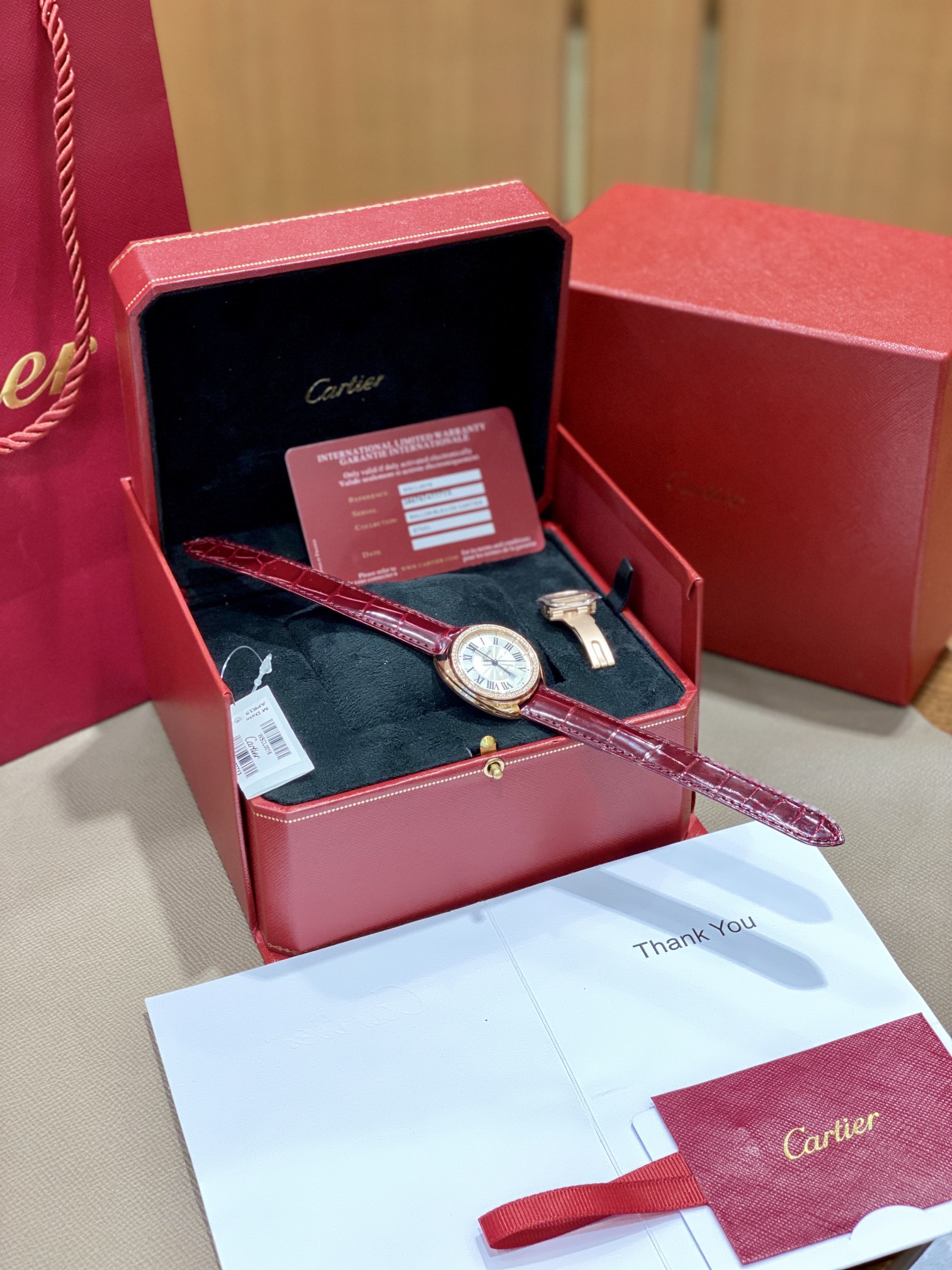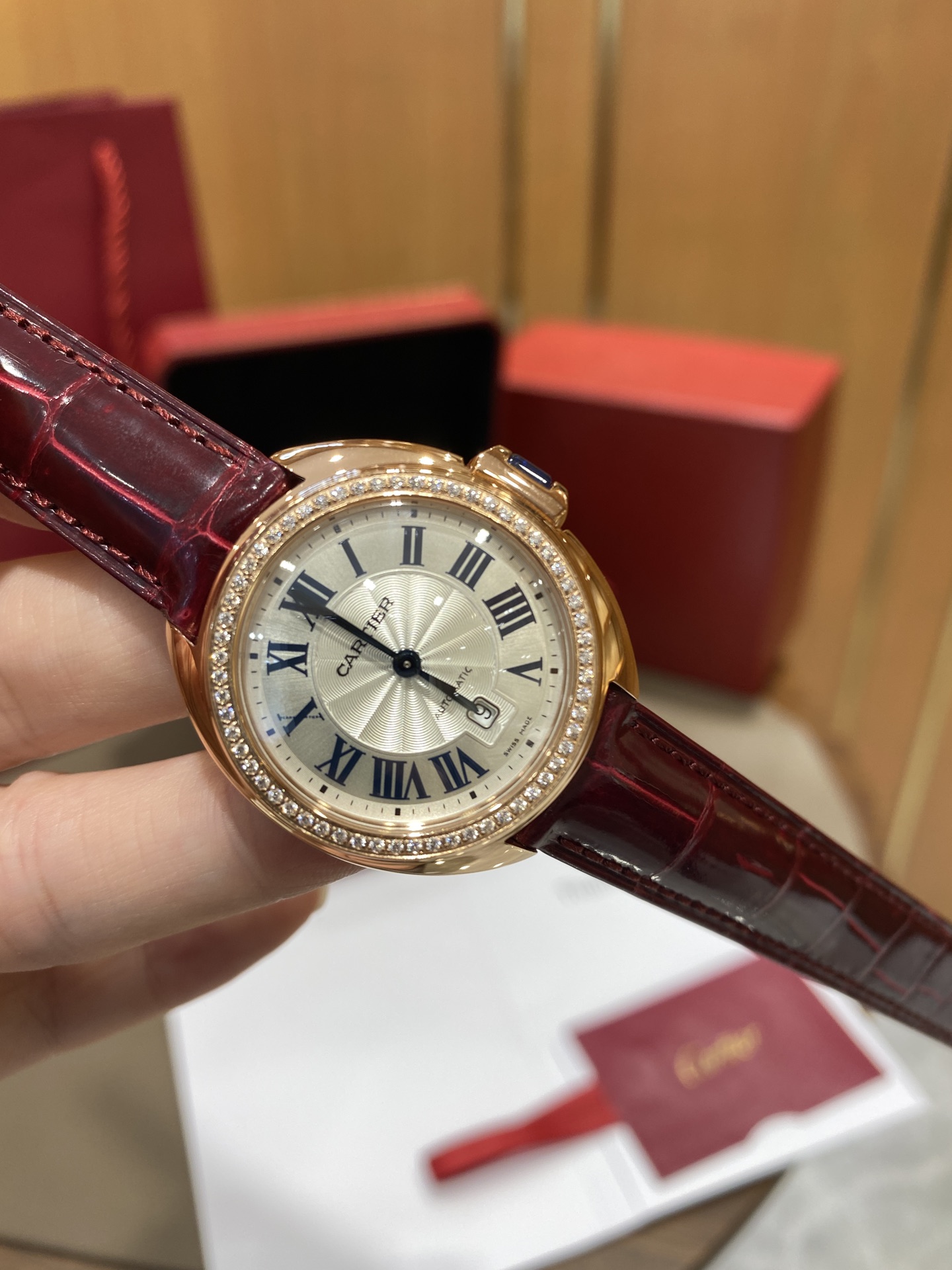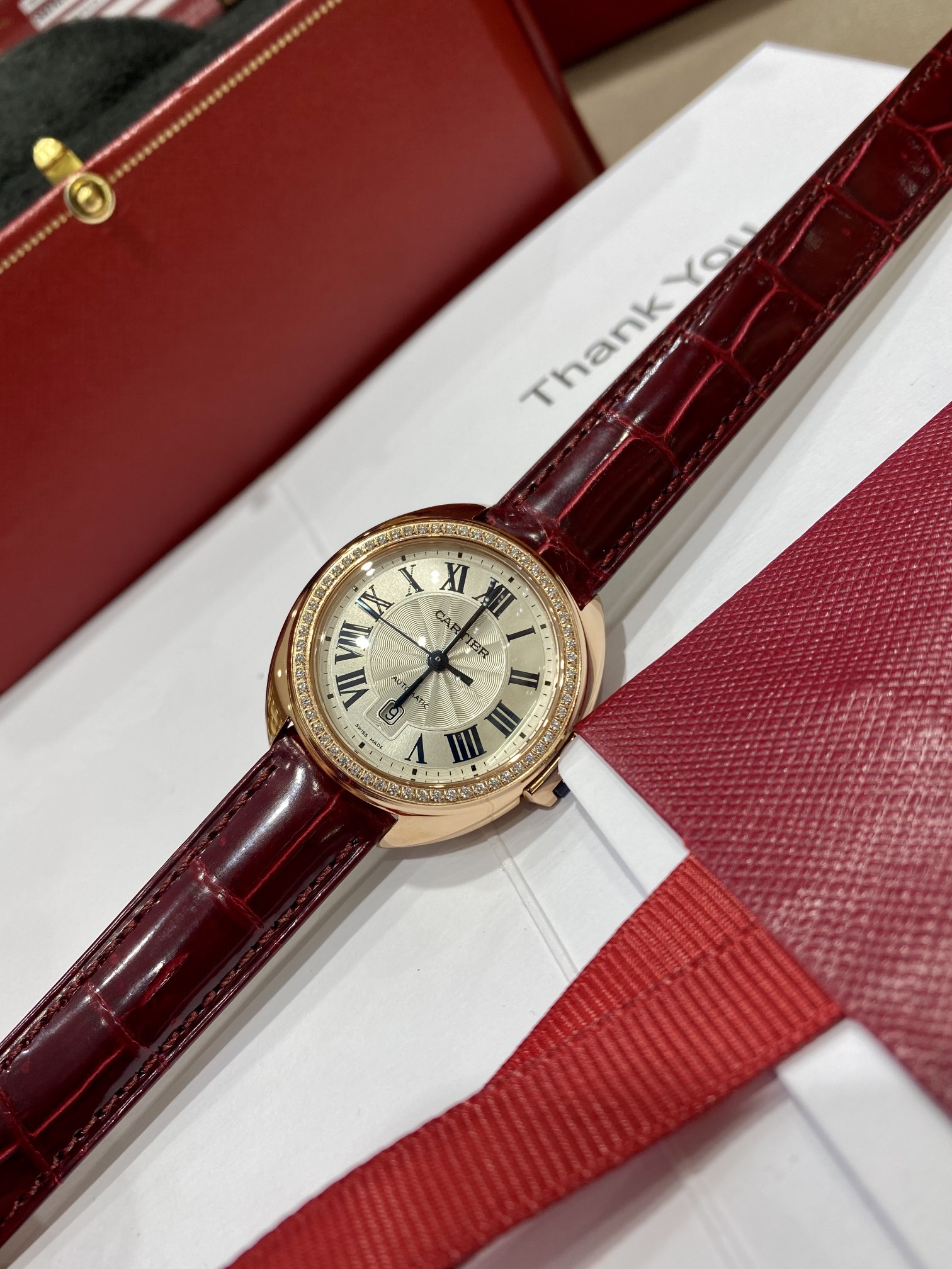 Cartier Key Series The watch retains Cartier's classic design: Arabic numeral hour markers and sword-shaped blue steel hands. The crown, shaped like a key, is set with a sapphire at the top. The engraved dial features sunburst patterns, and there is a date display window at the 6 o'clock position. The watch is paired with an alligator leather strap and features an imported automatic mechanical movement. The case is made of 316 stainless steel, measures 31 mm in size, and uses an abalone shell shape. The classic design offers high recognizability and is suitable for any occasion, making it a watch with excellent cost performance.