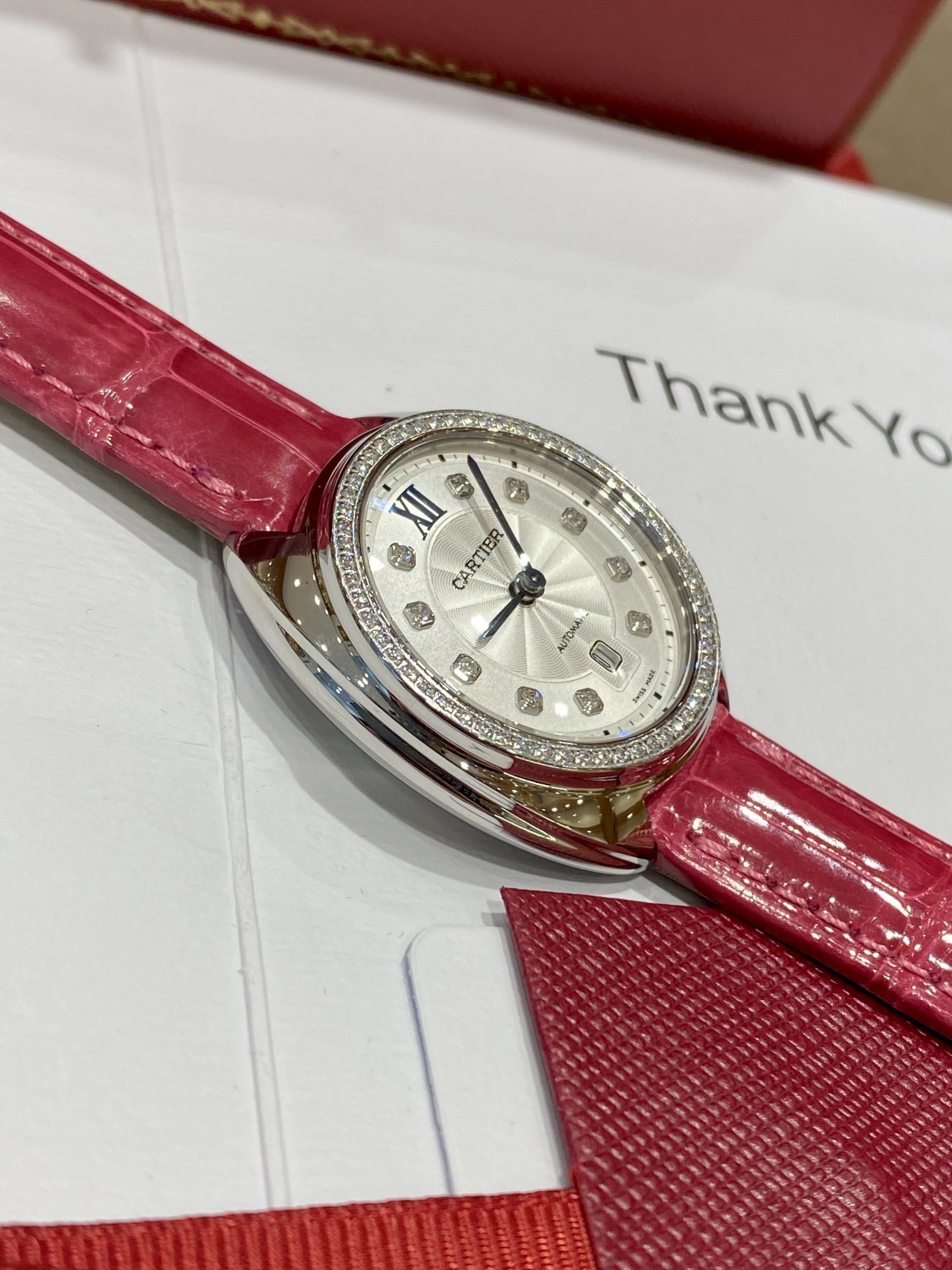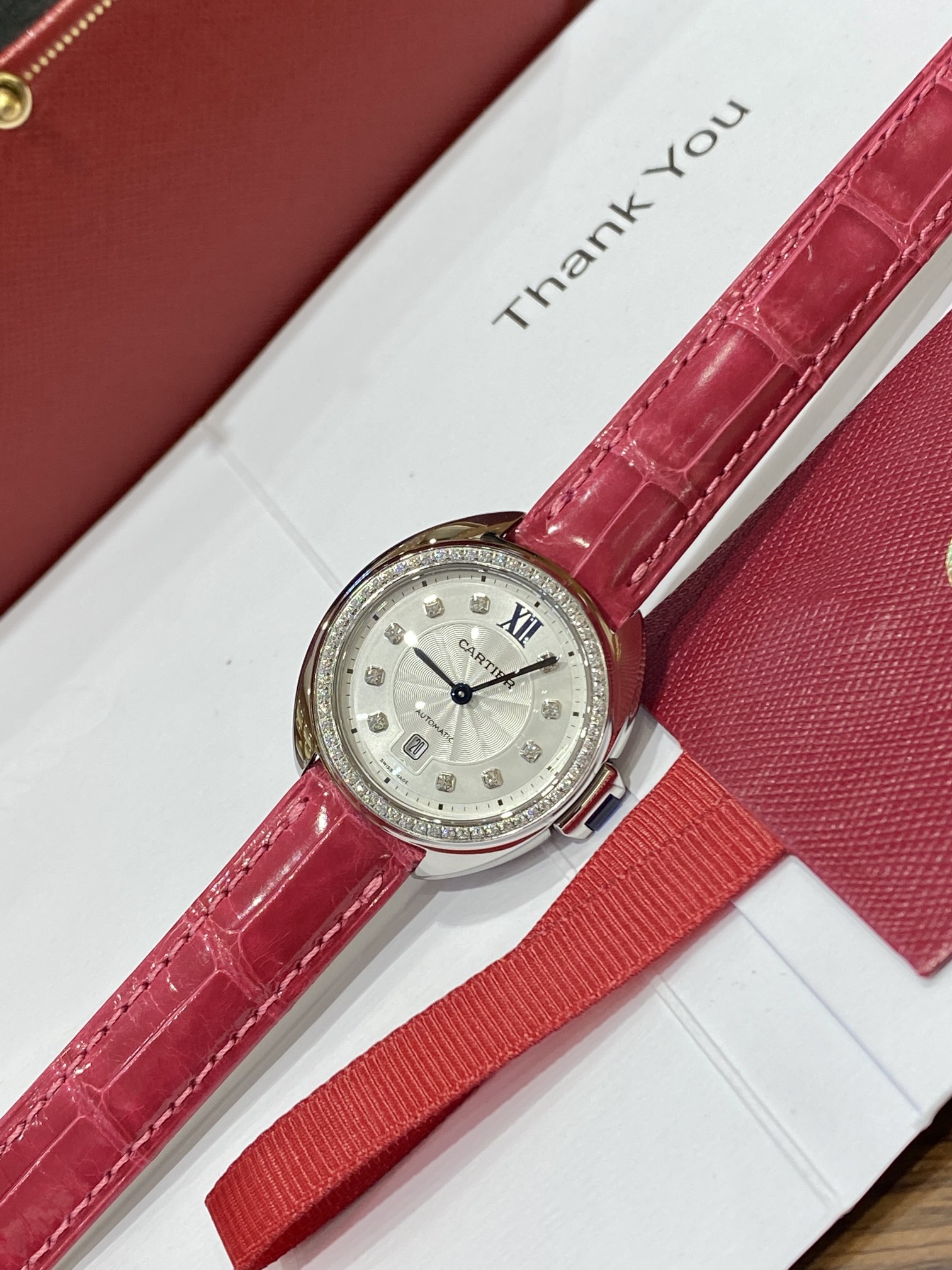 Cartier Key series watch retains classic design with Arabic numerals, sword-shaped hands, and sapphire crown. Features guilloché dial, sunburst pattern, date window, crocodile strap, automatic movement, 316 steel case, 31mm size. Versatile and high value.