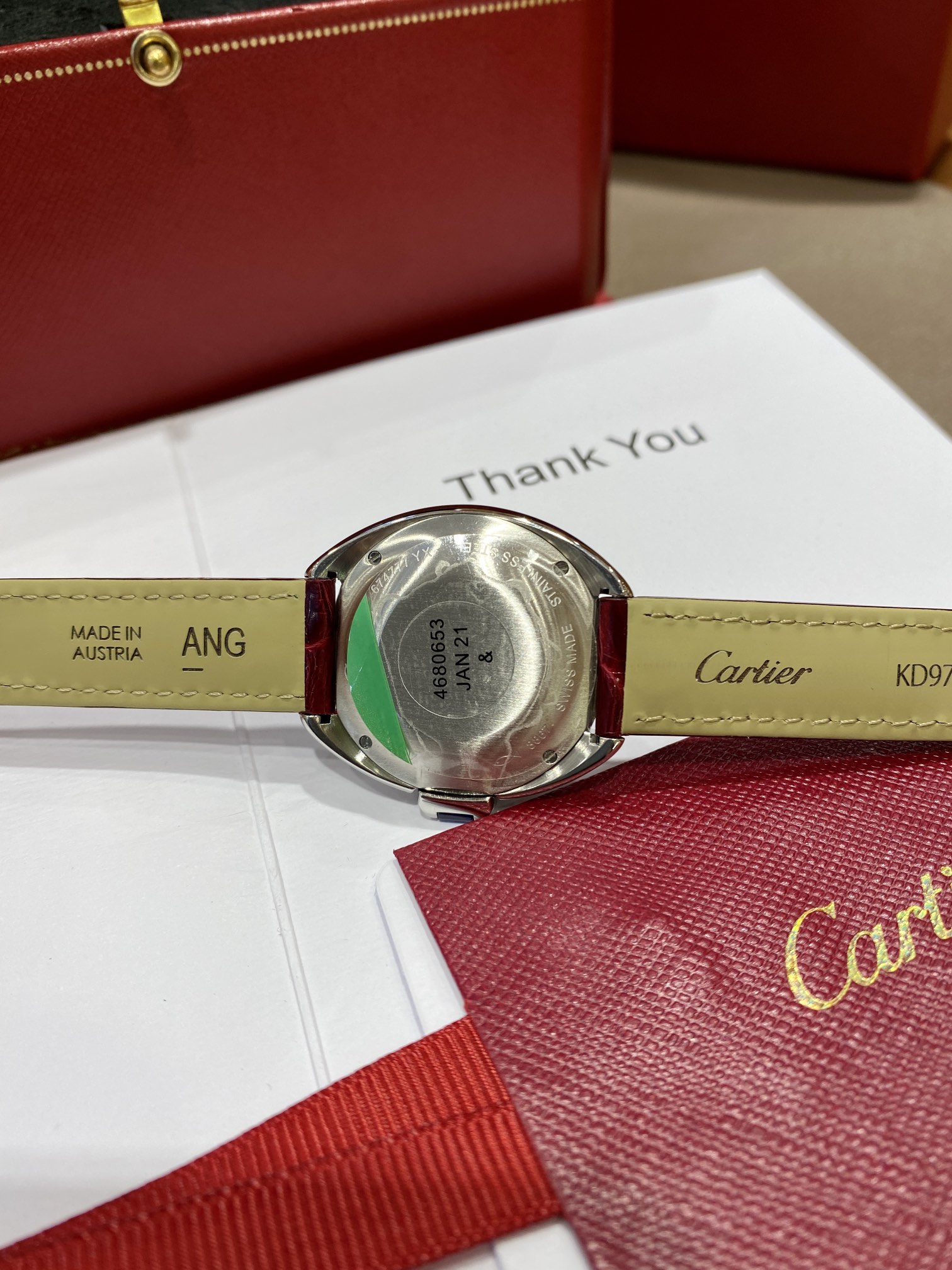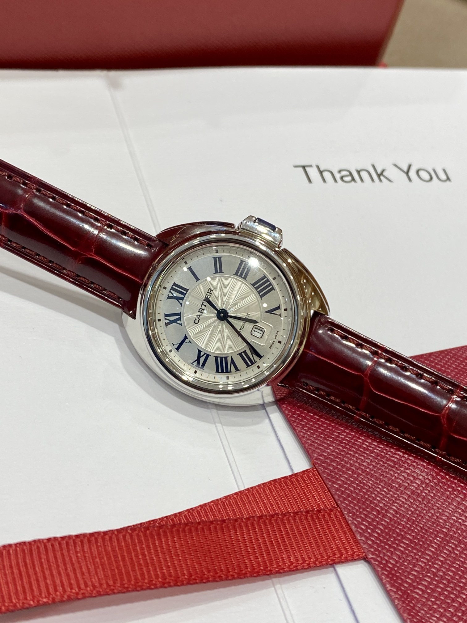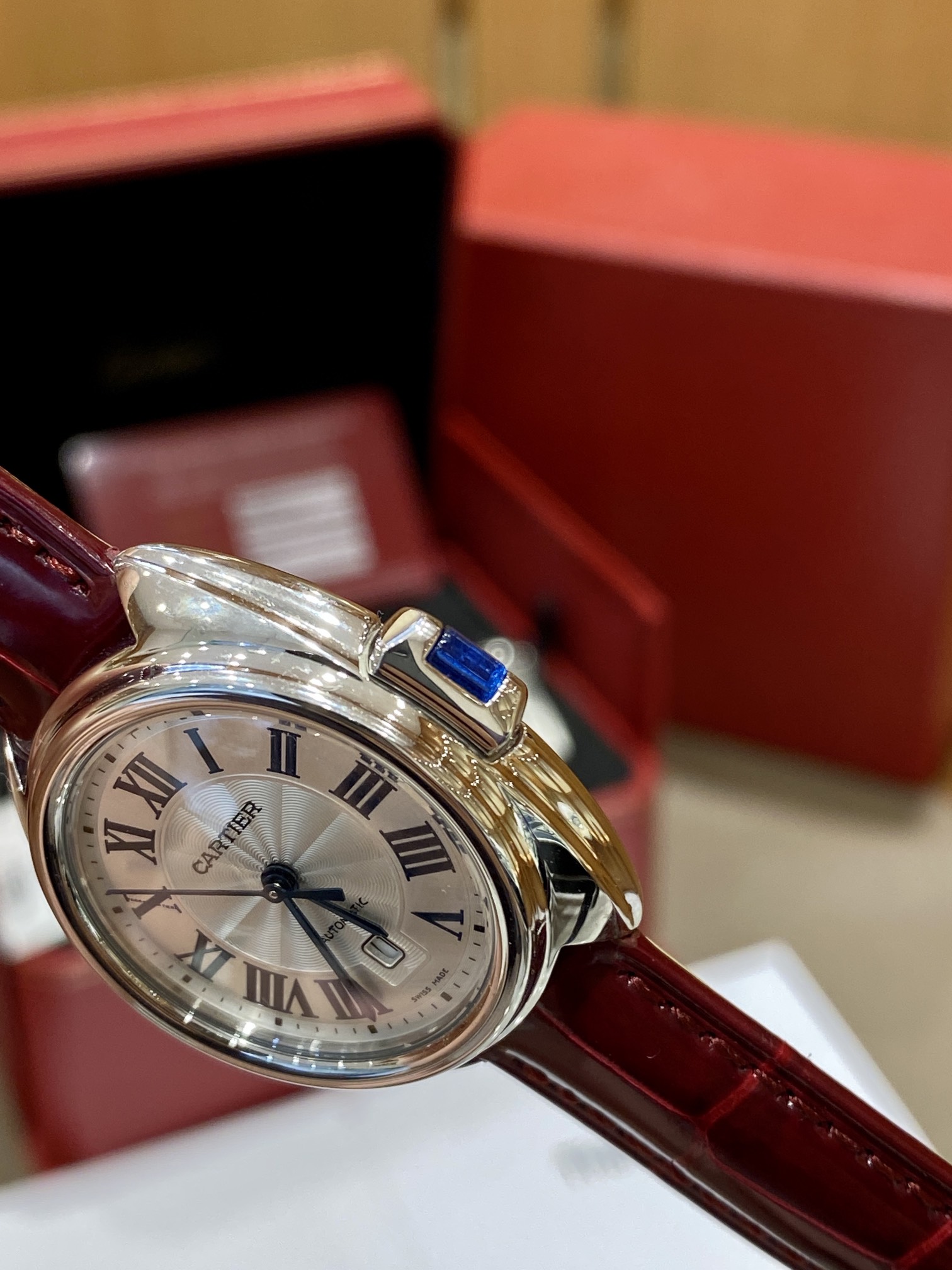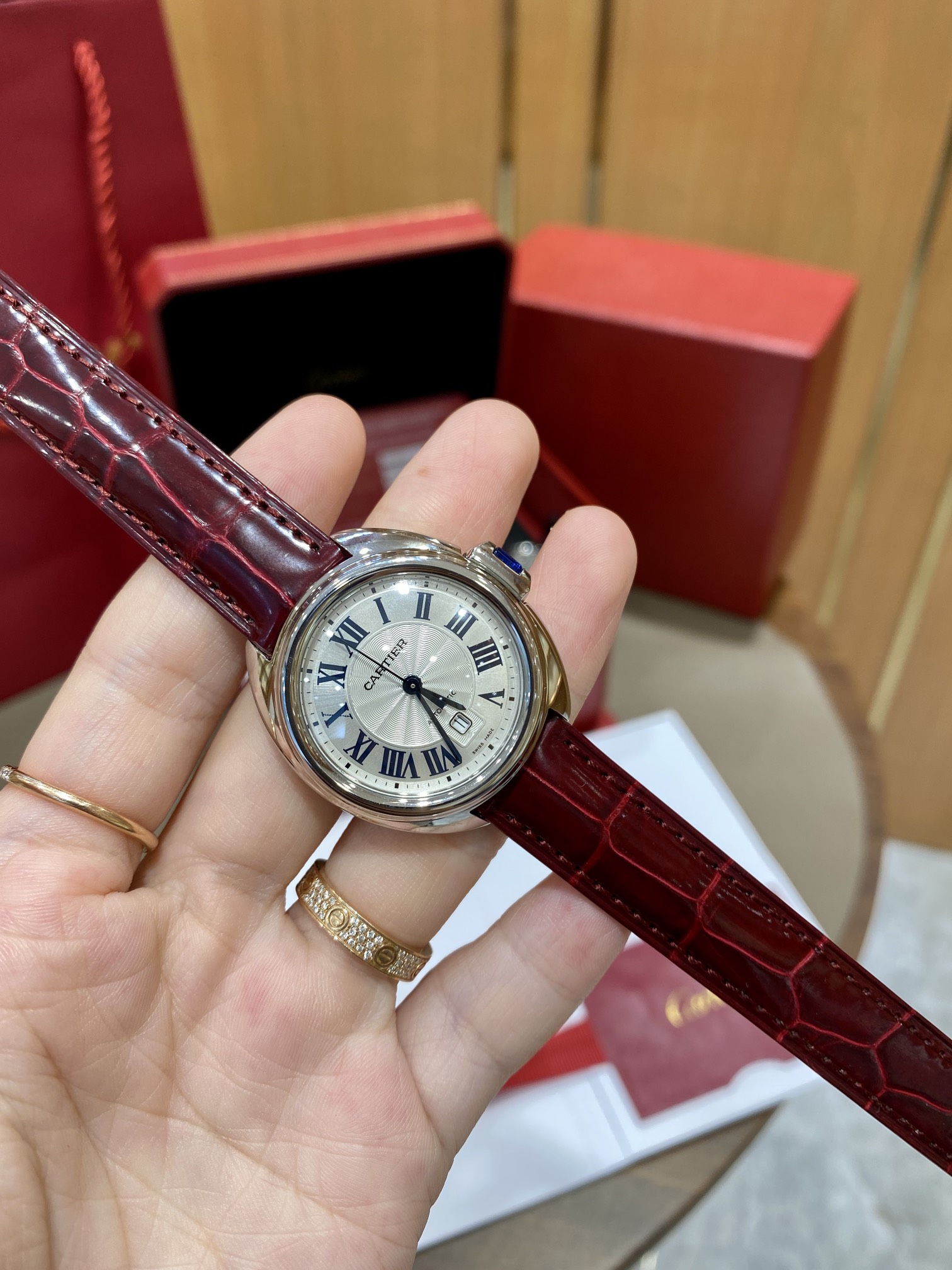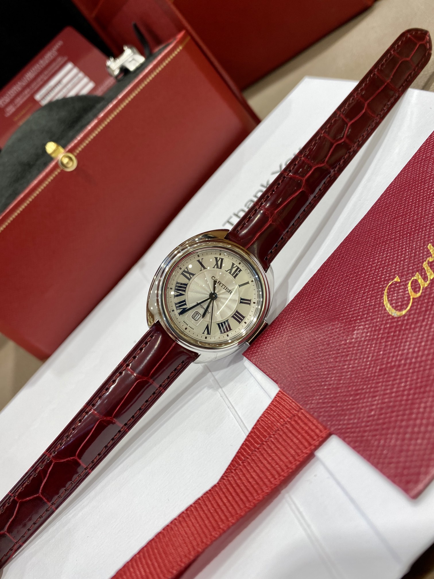Cartier Key Series The watch retains Cartier's classic design: Arabic numeral hour markers and sword-shaped blued steel hands, a crown shaped like a key set with a sapphire on top, a guilloché dial with sunburst pattern, a date display window at the 6 o'clock position. The watch is paired with an alligator leather strap, features an imported automatic mechanical movement, a 316L stainless steel case, 31mm size, and uses an abalone shell shape. The classic design has high recognition and is suitable for any occasion, making it a watch with high cost performance.