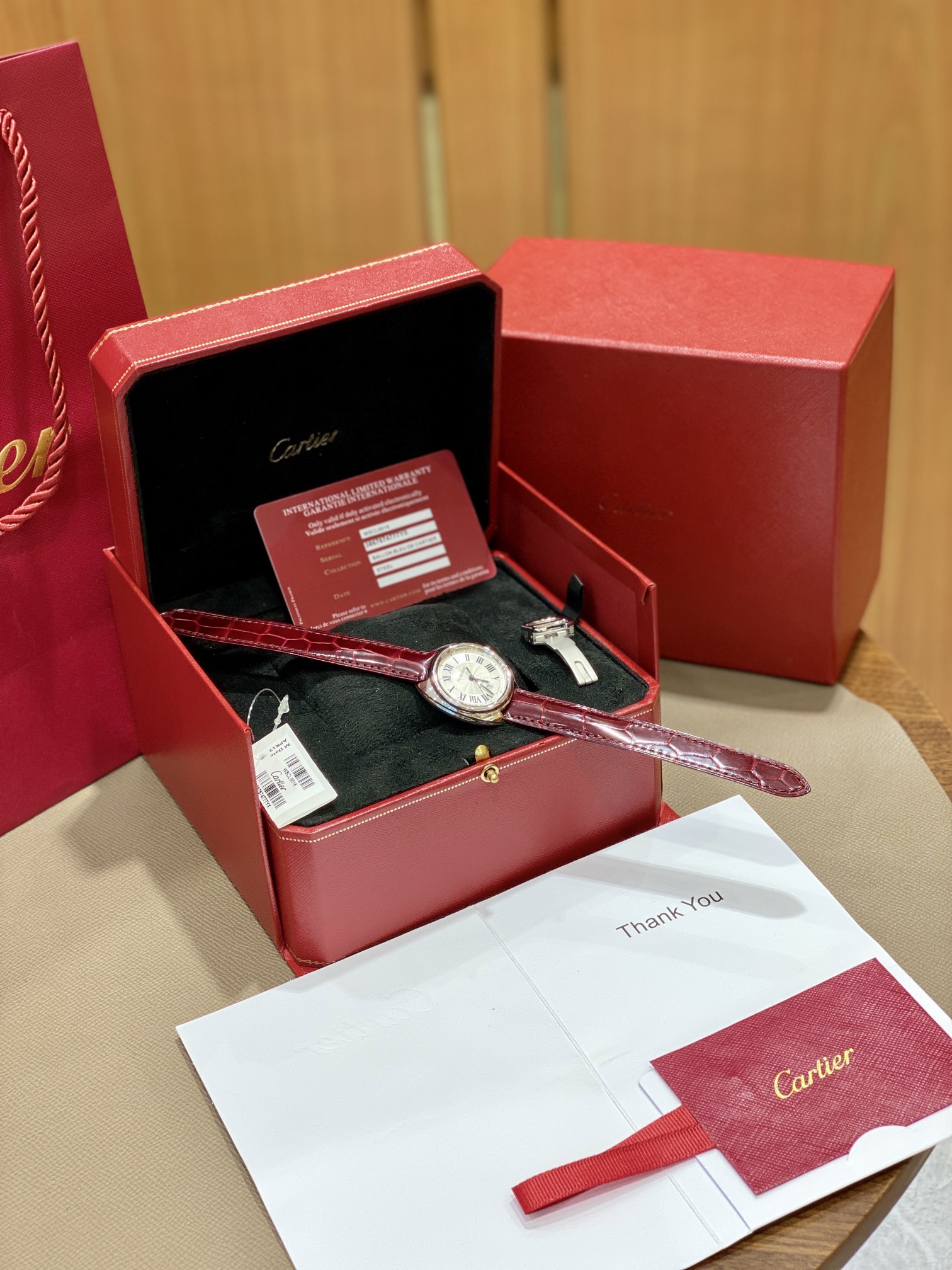 Cartier Key series watch retains classic design with Arabic numerals, sword-shaped hands, and sapphire crown. Features guilloché dial, sunburst pattern, date window, crocodile strap, automatic movement, 316 steel case, 31mm size. Versatile and high value.