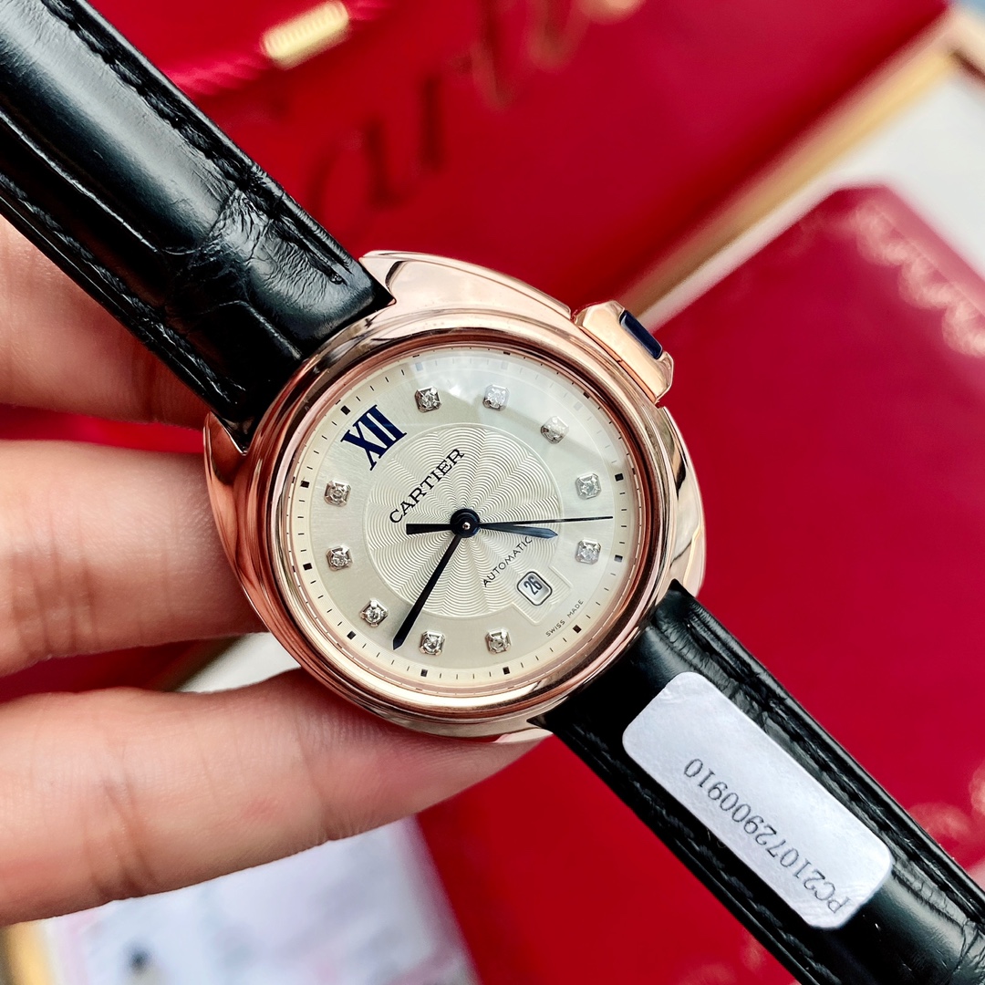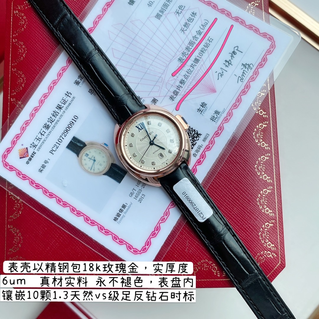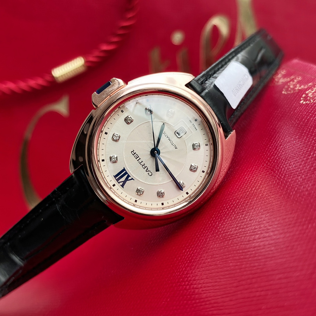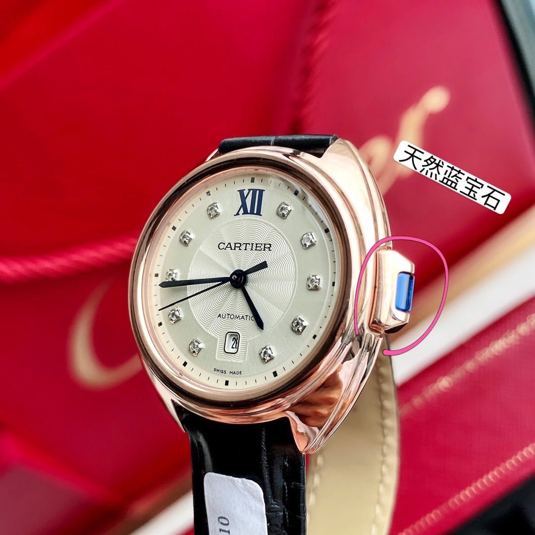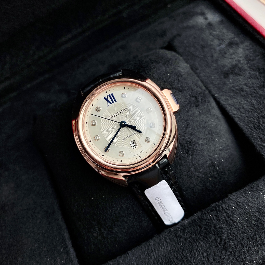 Cartier Key Series watches retain Cartier's classic design: the case is made of stainless steel with 18k rose gold plating, with an actual thickness of 6um that never fades. The dial features 10 natural, fully-cut 1.3 VS-grade diamond hour markers and sword-shaped blue steel hands. The crown, shaped like a key, is set with a sapphire at the top. The engraved dial is adorned with sunburst patterns, and there is a date display window at the 6 o'clock position. The watch is paired with an alligator leather strap and is equipped with an imported automatic mechanical movement. With a 31mm size and an abalone-shaped case, the classic design offers high recognition and is suitable for any occasion, making it a watch with excellent value for money!