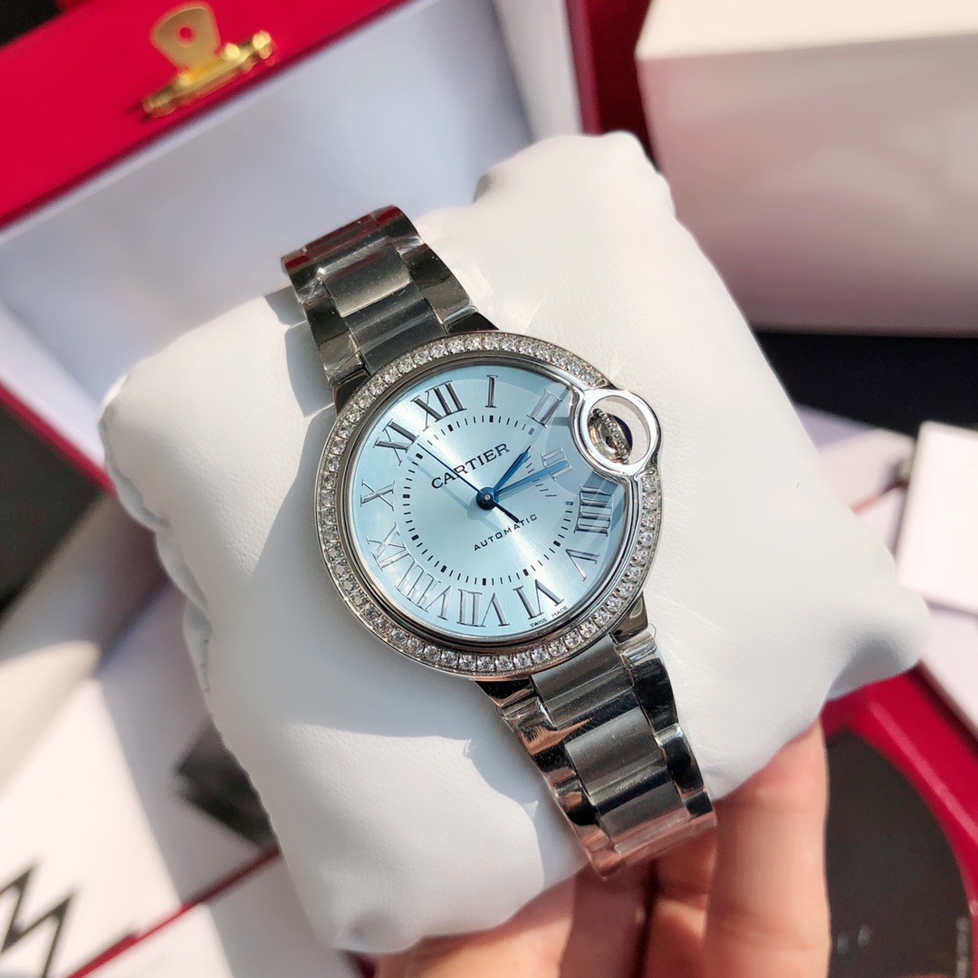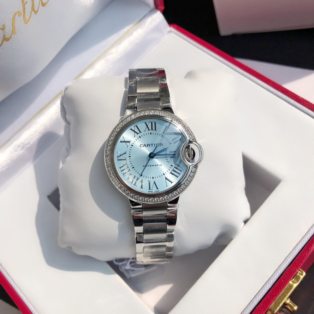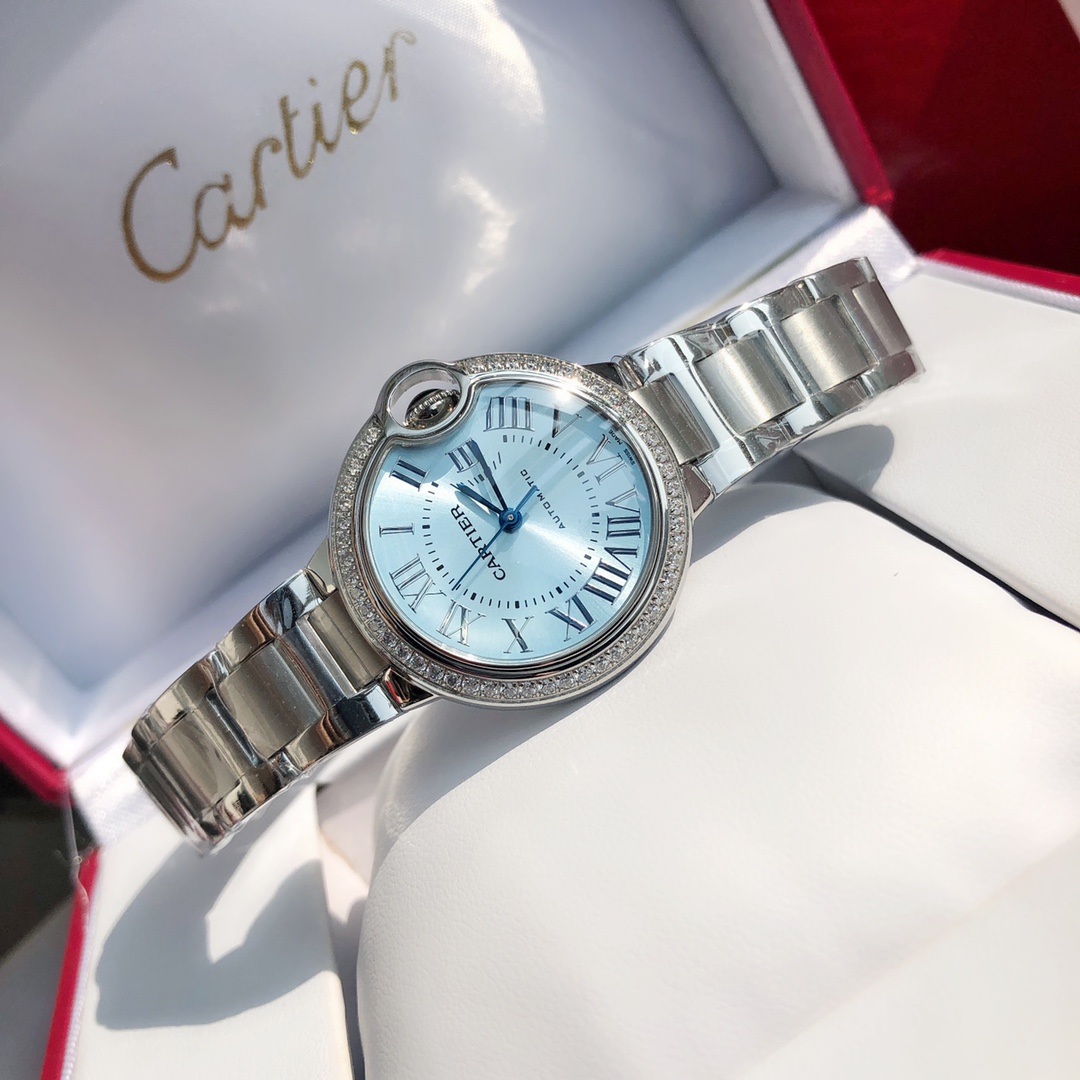 Cartier new ice blue dial mechanical women's watch 33mm. Ballon Bleu series, elegant design, stainless steel case, sapphire crystal, silver sunray dial. Full set with original packaging.