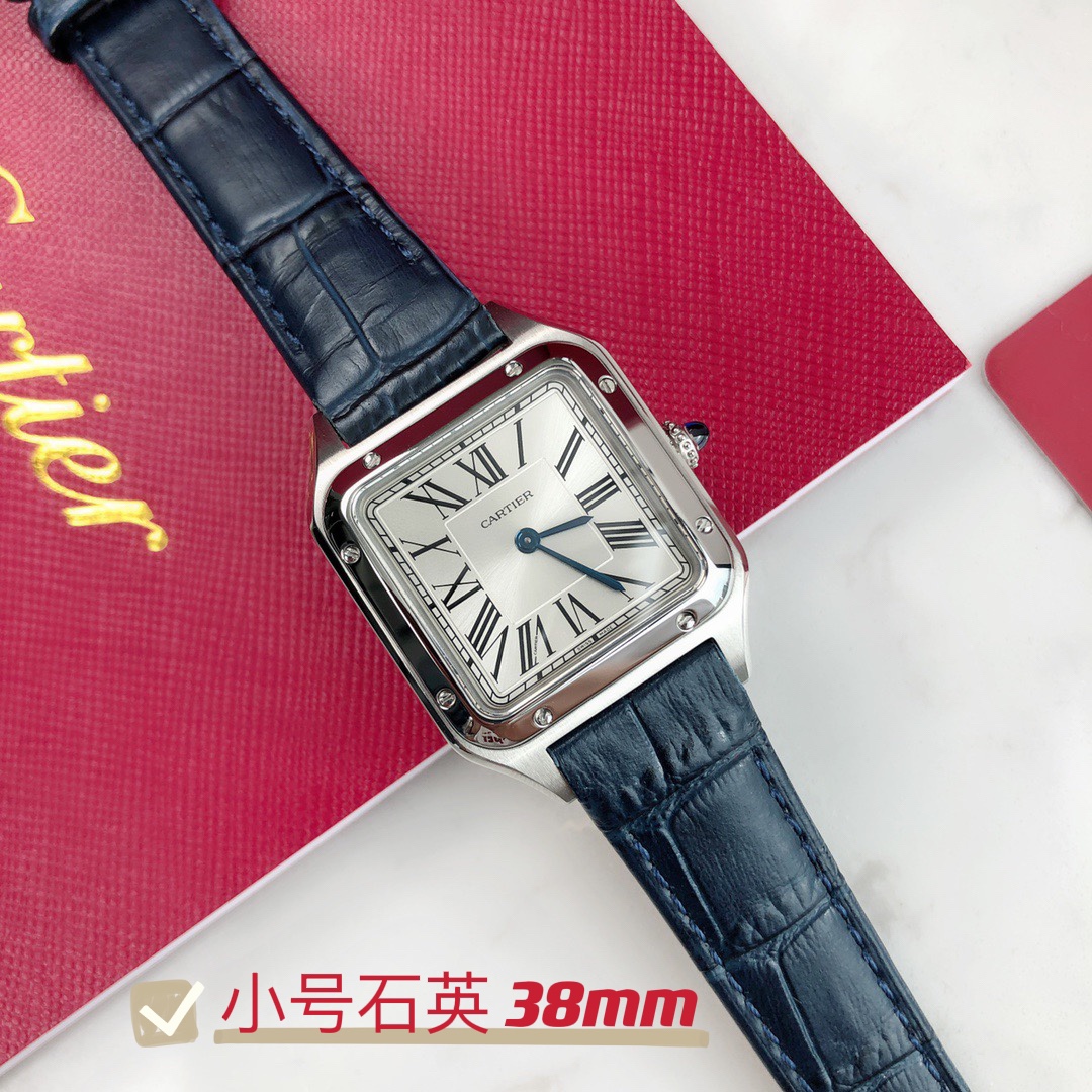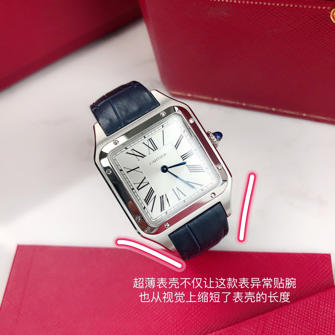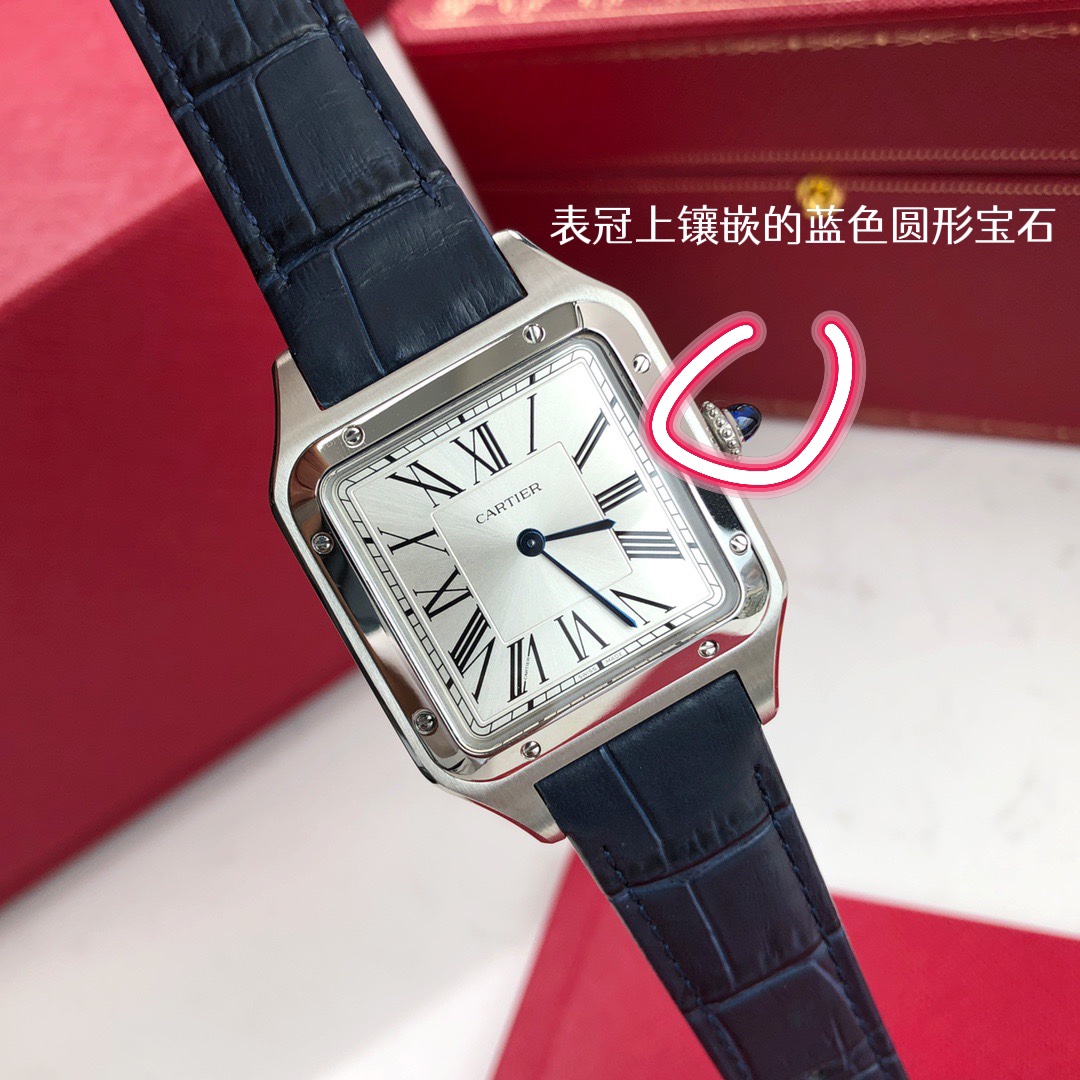 This watch model is crafted from stainless steel material, with ergonomically designed lugs, no gaps at all, pure steel head stands, DIY quick-release technology, 1:1 restoration of genuine product details, convex round deep blue spinel crown, purely hand-polished, 925 sterling silver craft dial purely hand-finished to create a satin sunburst pattern, the watch dial's pinion is round and smooth, flat, edges are neat without burrs, pinholes are concentric, fully interchangeable with store products, classic Roman numeral hour markers, classic and durable. The outer ring of the Roman numeral hour markers features a rail scale, adding some retro characteristics to the watch dial. The bezel is decorated with 8 screws, very distinctive. The sides are treated with a brushing process, the bezel is polished and refined, suitable for both formal wear and casual style. Paired with Italian imported calfskin pressed with crocodile pattern, the strap matches the blue round gemstone inlaid on the crown, overall presenting an elegant, refined gentlemanly气质; the case back is engraved with Cartier's Logo and the signature of Alberto Santos-Dumont "S=D"; the轮廓 is smooth,简约优雅, very much in line with the contemporary gentleman's trendy taste. Large model diameter: 43.5*31.4mm, small model diameter: 38*27.5mm; Swiss quartz movement.