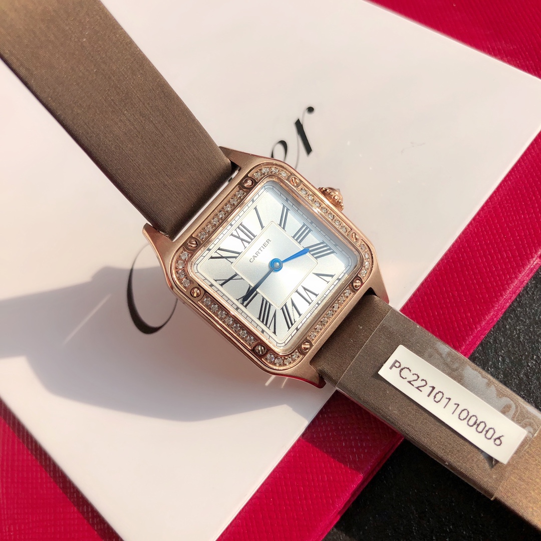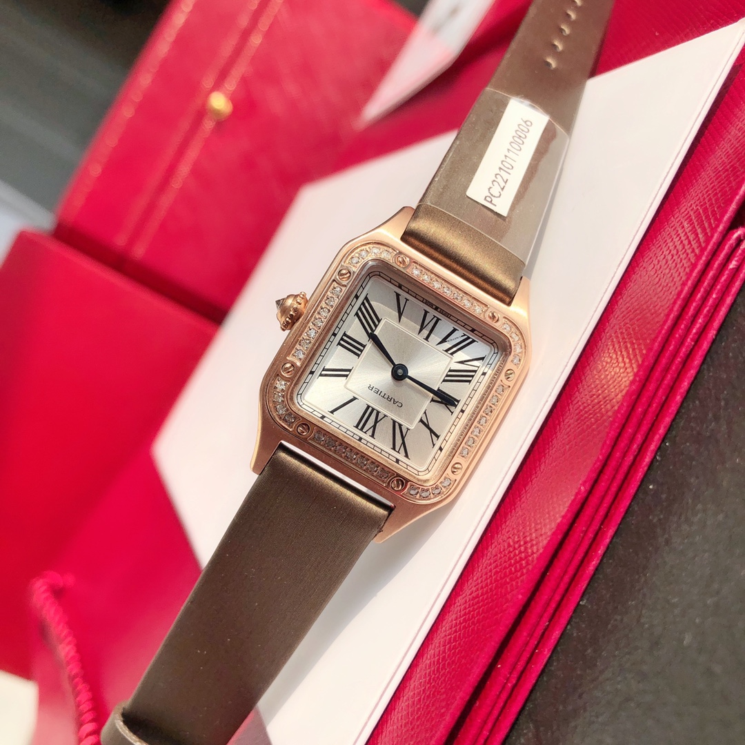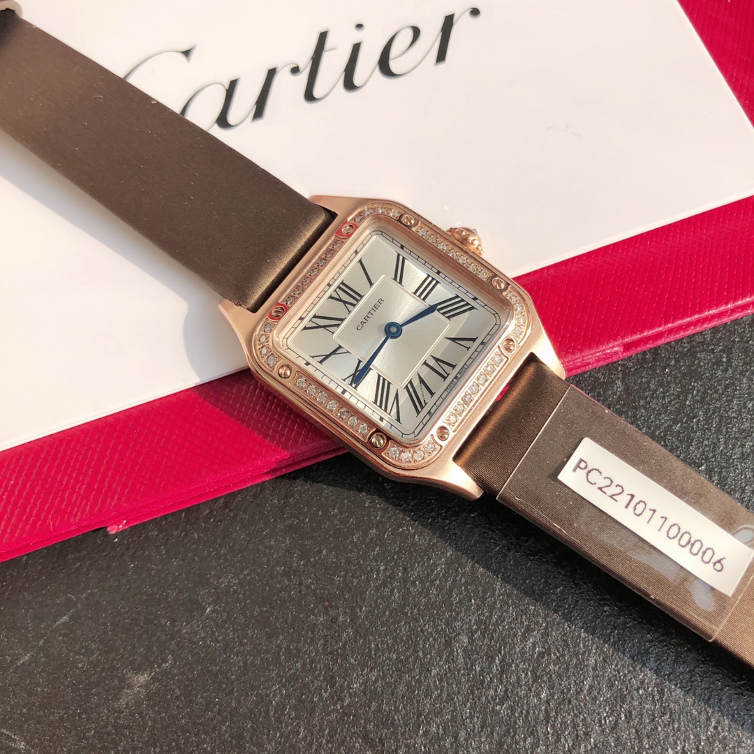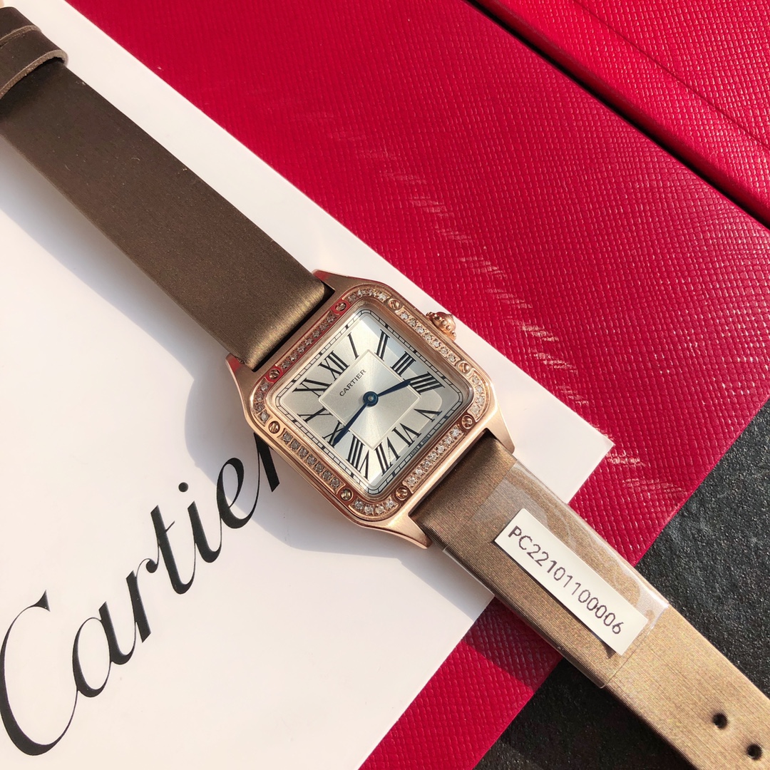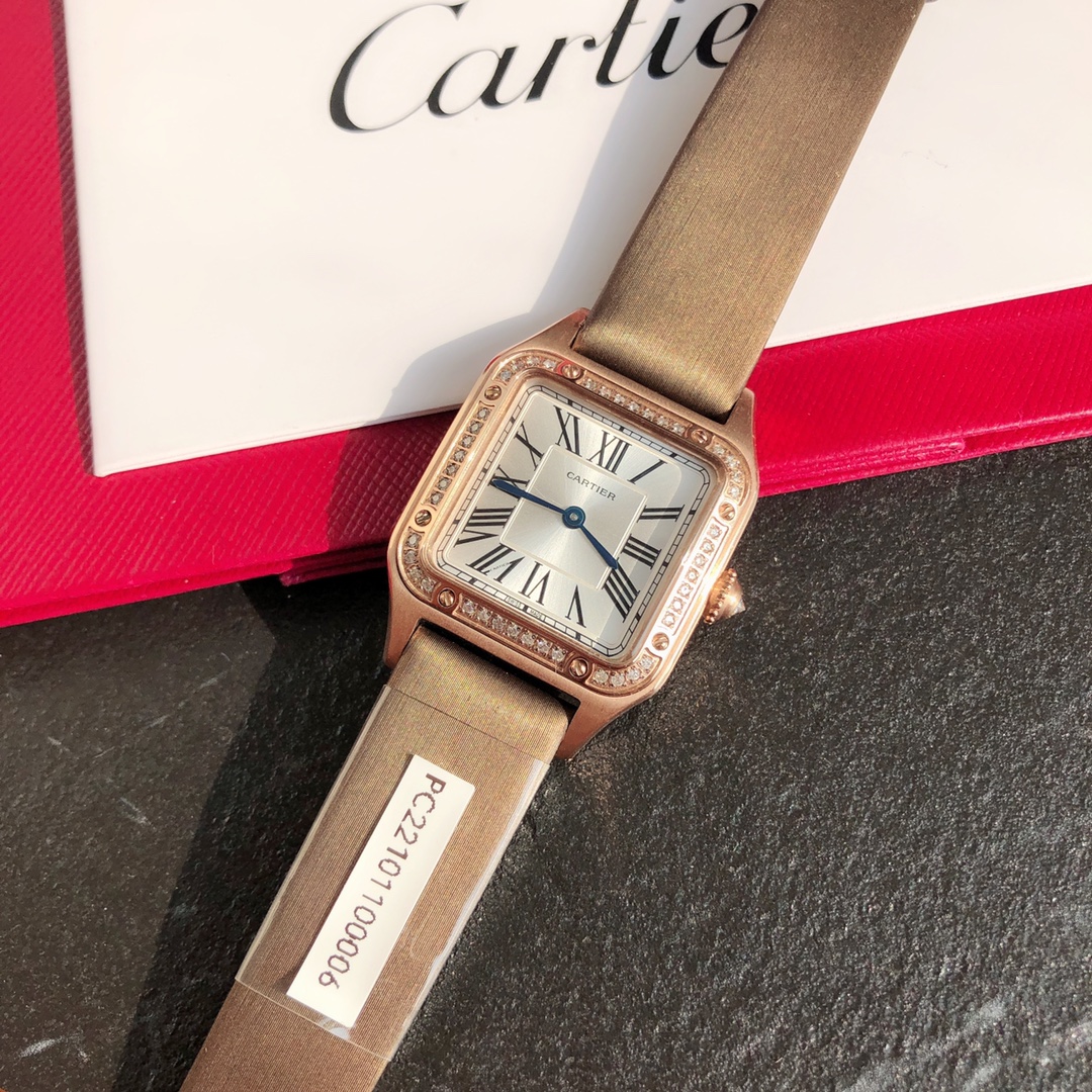 Model WJSA0017. Size 27.5✖️38mm. Genuine diamond inlay, gold-plated case, overall made of 904L stainless steel. Plated with 18k rose gold. The dial is set with 44 brilliant-cut round diamonds (approximately 0.46 carats). Certified by national professional inspection authorities, each watch comes with a unique code and certificate, supports customer re-inspection, guaranteed authenticity! Imported American alligator leather strap. The sapphire crystal bezel is polished, with blued steel hands fired at 1600 degrees Celsius. The dial is made of 904L stainless steel with satin-brushed, silver-plated sunray finish. Features 8 exposed screws, continuing the historical heritage of the Santos series' watchmaking典范杰作. The legendary aviator Alberto Santos-Dumont, with his relentless spirit of exploration,诠释先锋精神. Today, Cartier vividly recreates the飞行传奇 of Santos between reality and virtuality, Santos de Cartier watch.