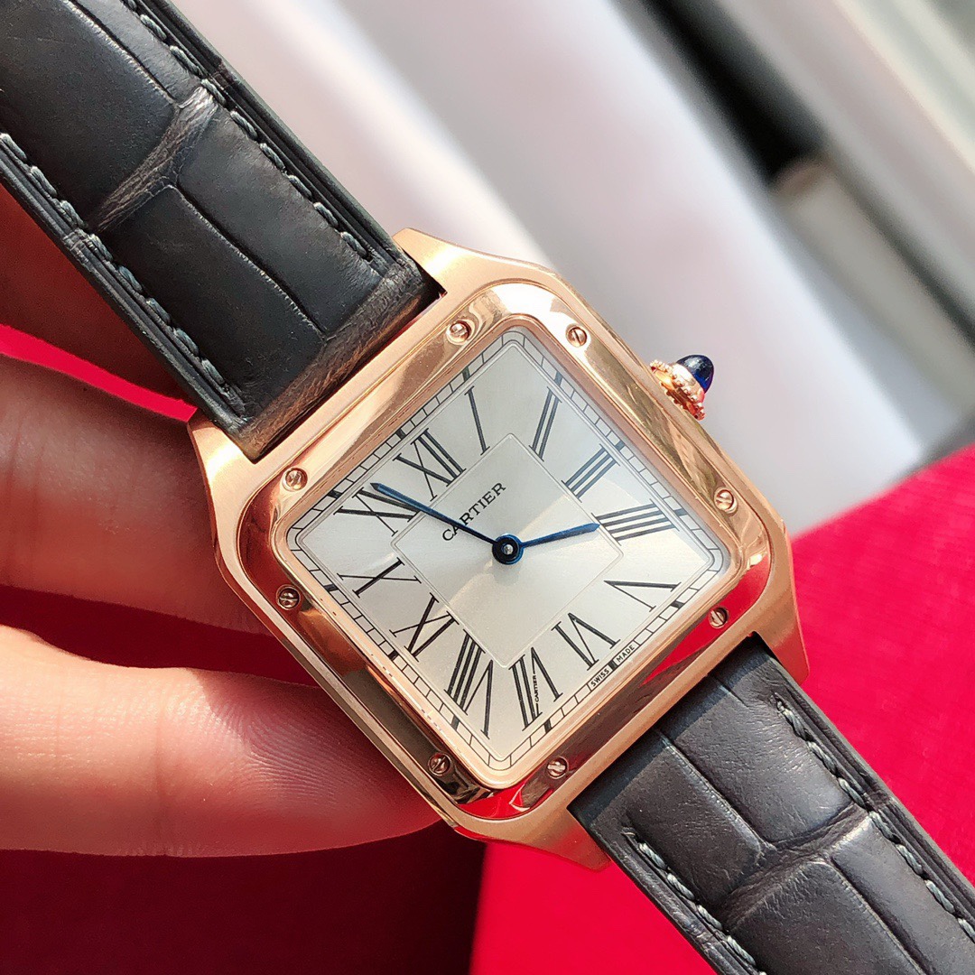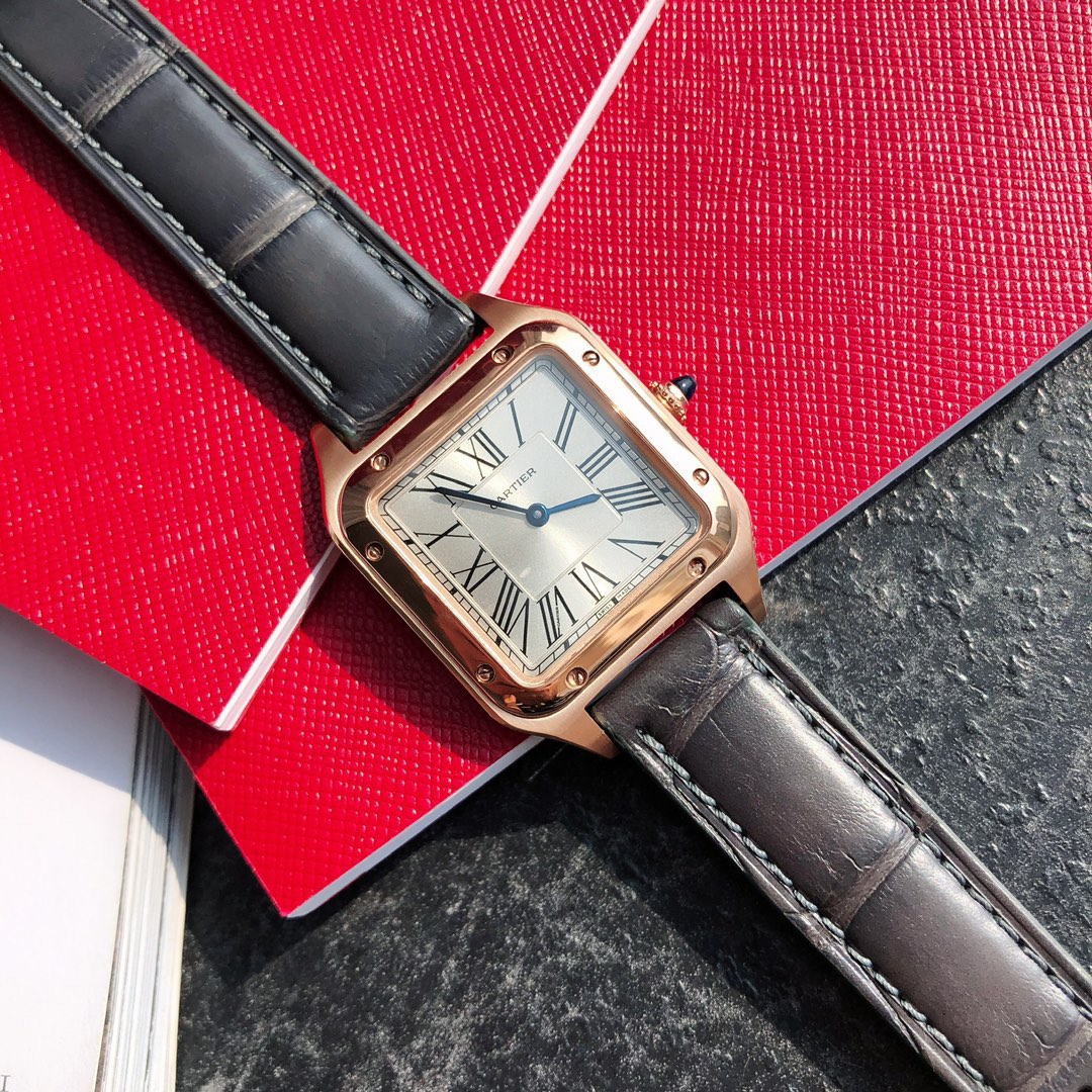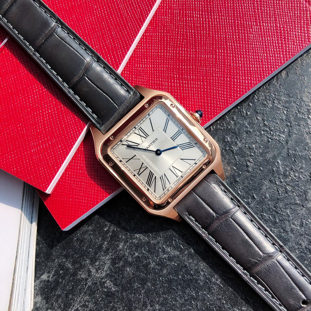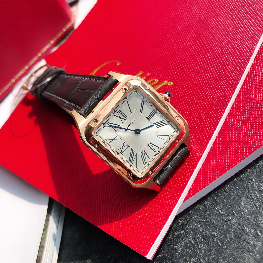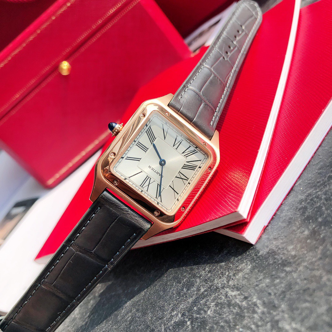Cartier's classic masterpiece, the Santos watch series! Compared to round watches, square watches are particularly unique due to their angular design. When it comes to classic square watches, Cartier's Santos naturally stands out. The Santos watch is not only a model among square watches but is also considered "the first modern wristwatch in the world." The birth of the Santos series is filled with legendary stories. At the time, Louis Cartier created a watch that could be worn on the wrist for his friend, the Brazilian pilot Alberto Santos-Dumont, making it convenient to check the time during flights. Thus, the first modern wristwatch in history came into being. This model is crafted from stainless steel, featuring a frosted dial with sword-shaped blue steel hands and classic Roman numeral hour markers, making it timeless and elegant. The outer ring of the Roman numeral hour markers is adorned with a railway track scale, adding a retro touch to the watch dial. The bezel is decorated with eight screws, making it highly recognizable. The sides are brushed, while the bezel is polished, allowing it to be paired with both formal attire and casual styles. The case has a slight curvature, perfectly fitting the wrist for a very comfortable wear. The crown is set with a blue natural spinel, matching the American alligator leather strap and the blue round gemstone embedded in the crown, presenting an overall refined and elegant gentlemanly气质. The case back is engraved with Cartier's logo and Alberto Santos-Dumont's signature "S=D." The smooth contours, simplicity, and elegance make it highly aligned with the contemporary gentleman's taste. Large model dimensions: 43.5*31.4mm; Small model dimensions: 38*27.5mm; Swiss quartz movement, comes with full packaging.