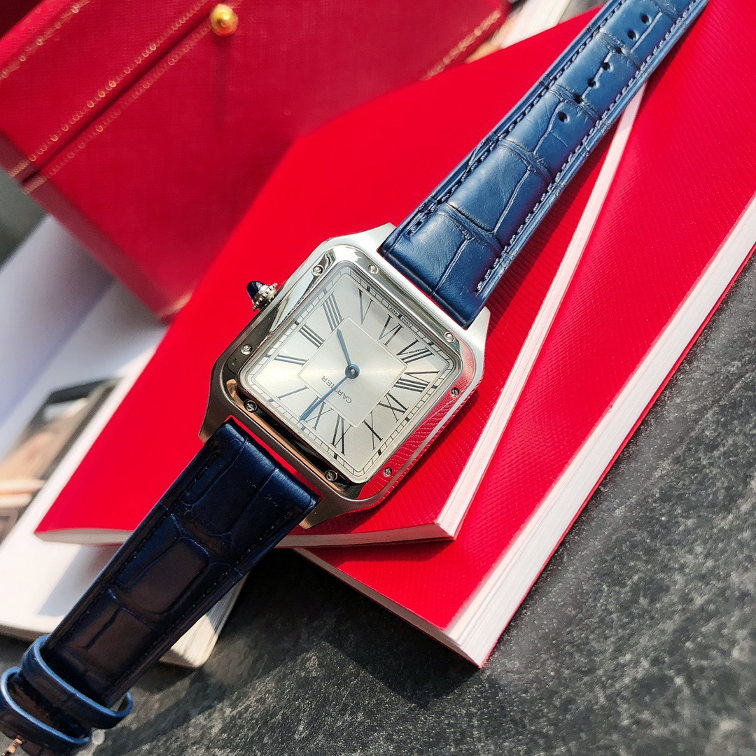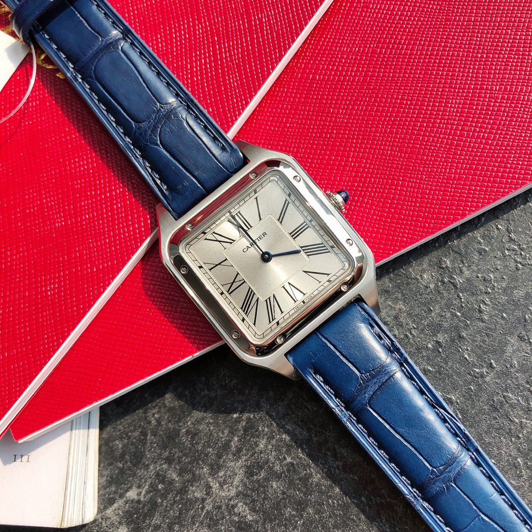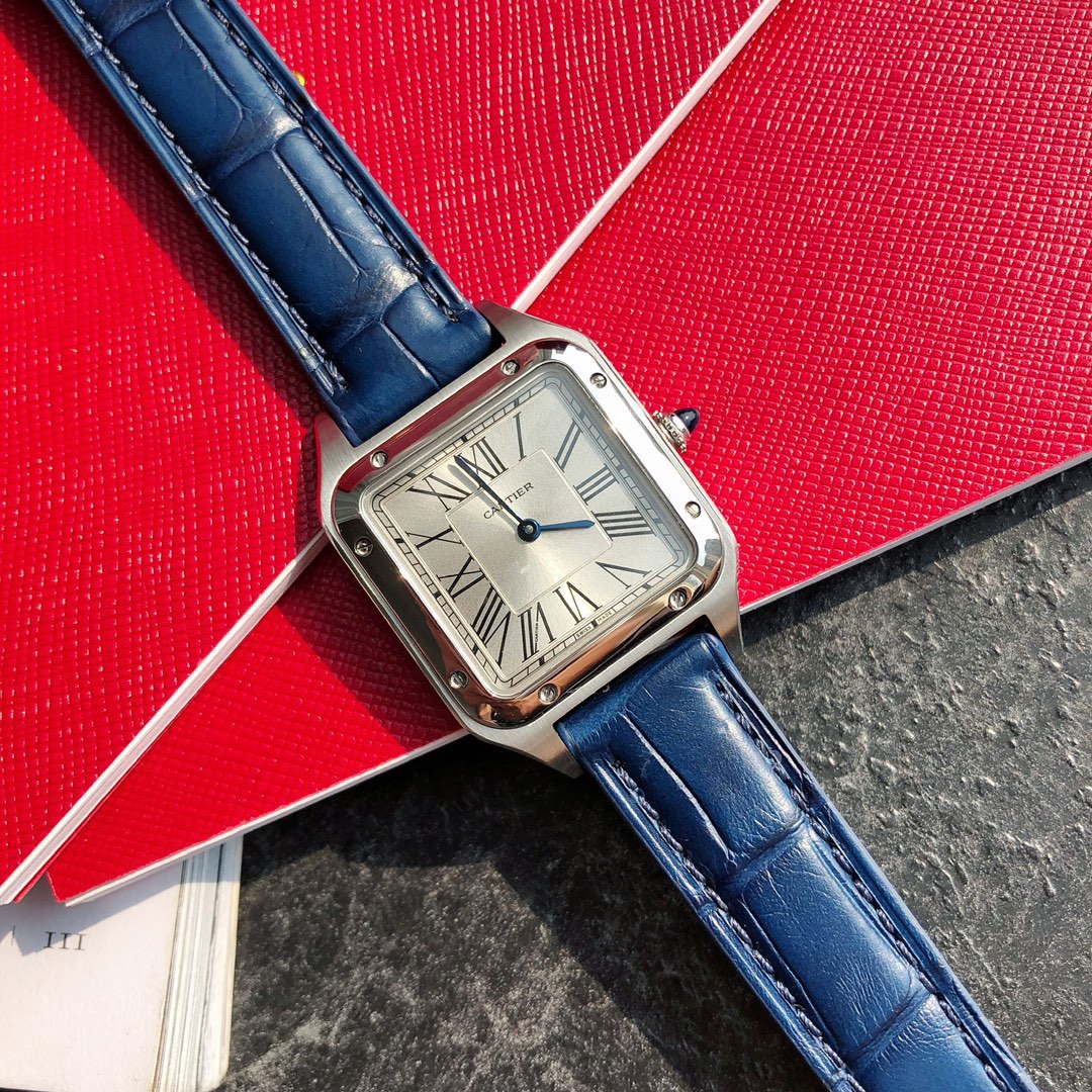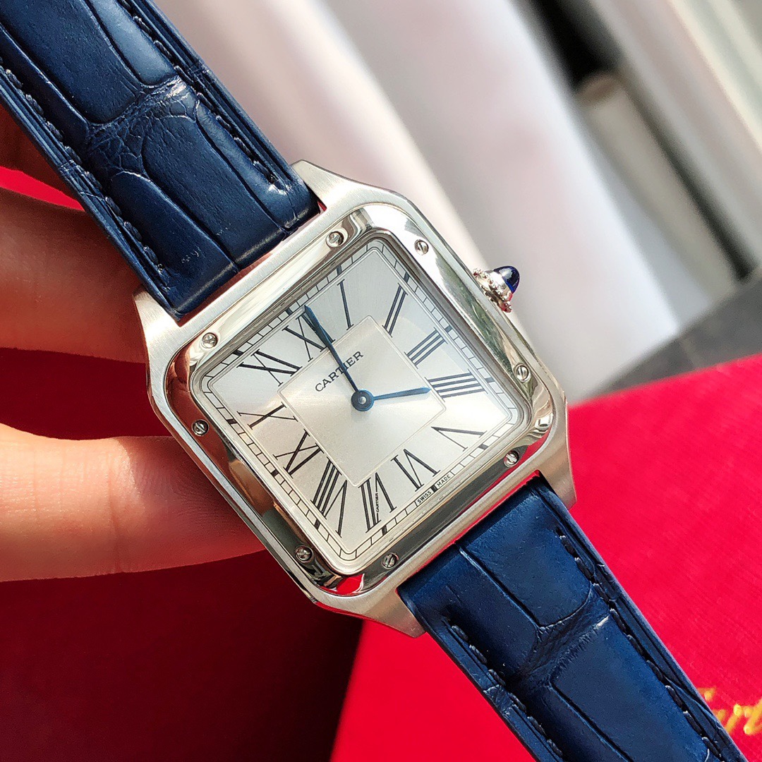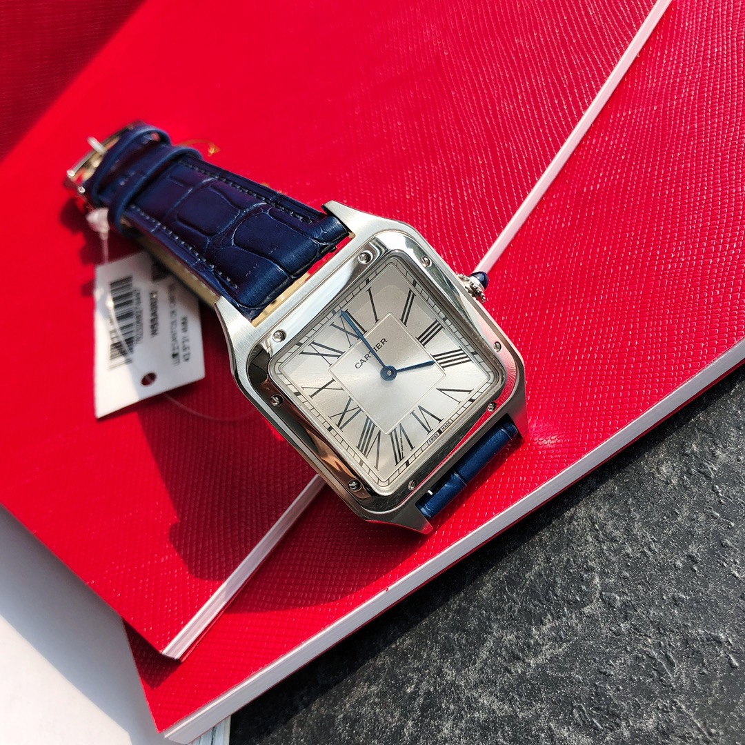 Cartier Classic, Santos de Cartier Watch! Compared to round watches, square watches are particularly unique due to their angular design. When it comes to classic square watches, Cartier's Santos naturally stands out. The Santos watch is not only a model among square watches but is also considered "the first modern wristwatch in the world." The birth of the Santos de Cartier watch is full of legendary stories. At that time, Louis Cartier created a watch that could be worn on the wrist for his friend, the Brazilian pilot Alberto Santos-Dumont, making it convenient to check the time during flights. Thus, the first modern wristwatch in history came into being. This watch model is crafted from stainless steel, featuring a satin-finished dial with sword-shaped blue steel hands and classic Roman numeral hour markers, making it timeless and elegant. The outer ring of the Roman numeral hour markers is adorned with a railway track minute circle, adding a retro touch to the watch dial. The bezel is decorated with eight screws, giving it high recognizability. The sides are treated with a brushed finish, while the bezel is polished, allowing it to be paired with both formal attire and casual styles. The case has a slight curvature, perfectly fitting the wrist for a very comfortable wear. The crown is set with a blue natural spinel, matching the alligator leather strap, which complements the blue cabochon sapphire on the crown, presenting an overall refined and elegant gentlemanly气质. The case back is engraved with the Cartier logo and Alberto Santos-Dumont's signature "S=D." The smooth contours, simplicity, and elegance make it highly aligned with the contemporary gentleman's trendy taste. Large model dimensions: 43.5*31.4mm, small model dimensions: 38*27.5mm; Swiss quartz movement, comes with full set of packaging.