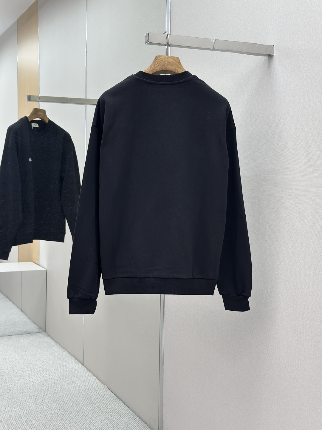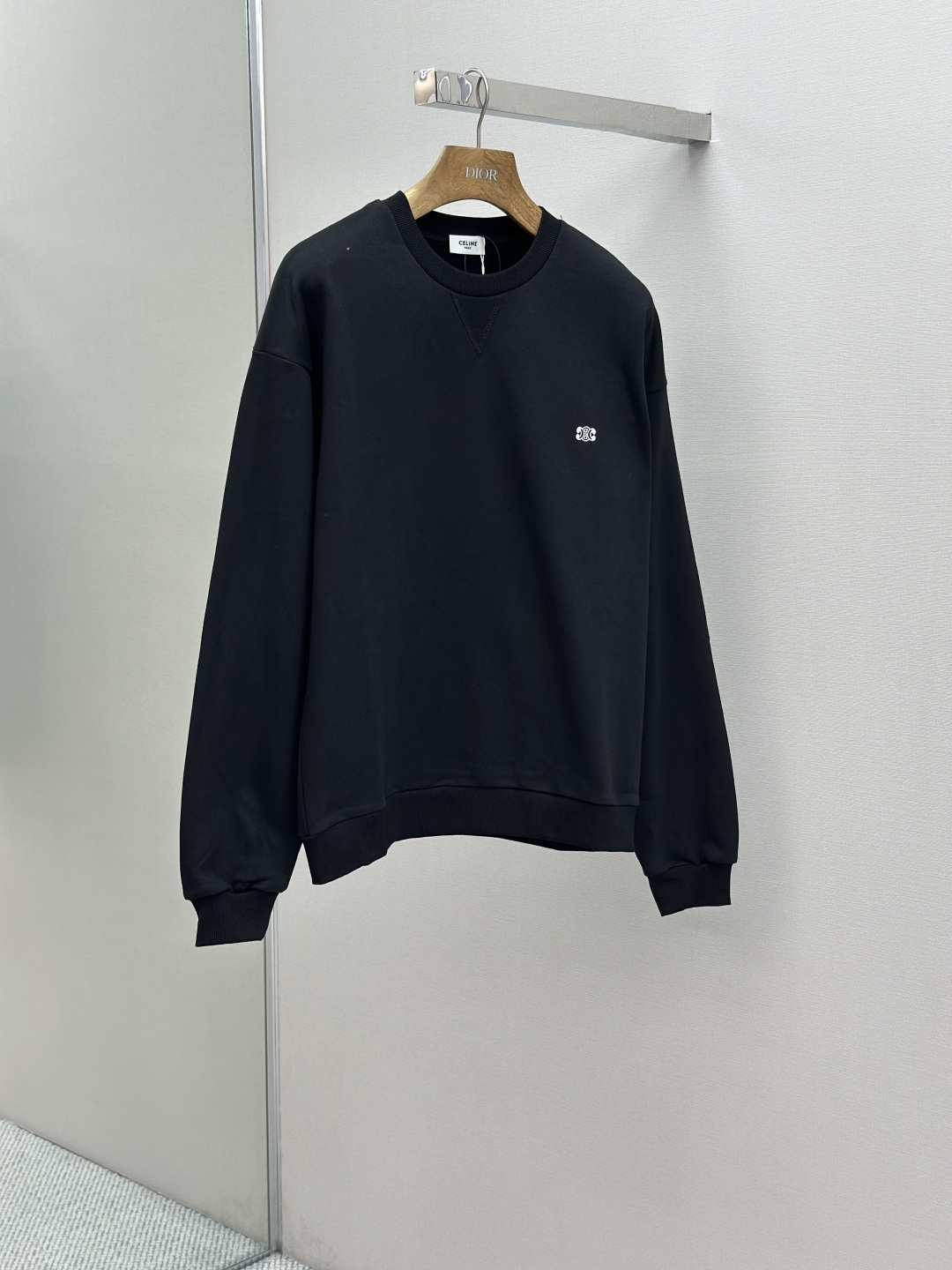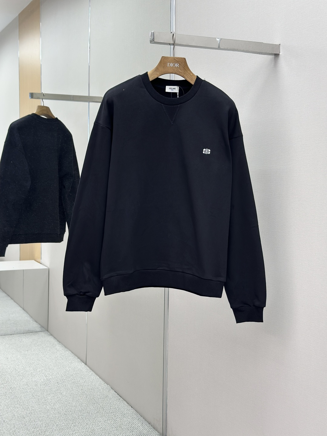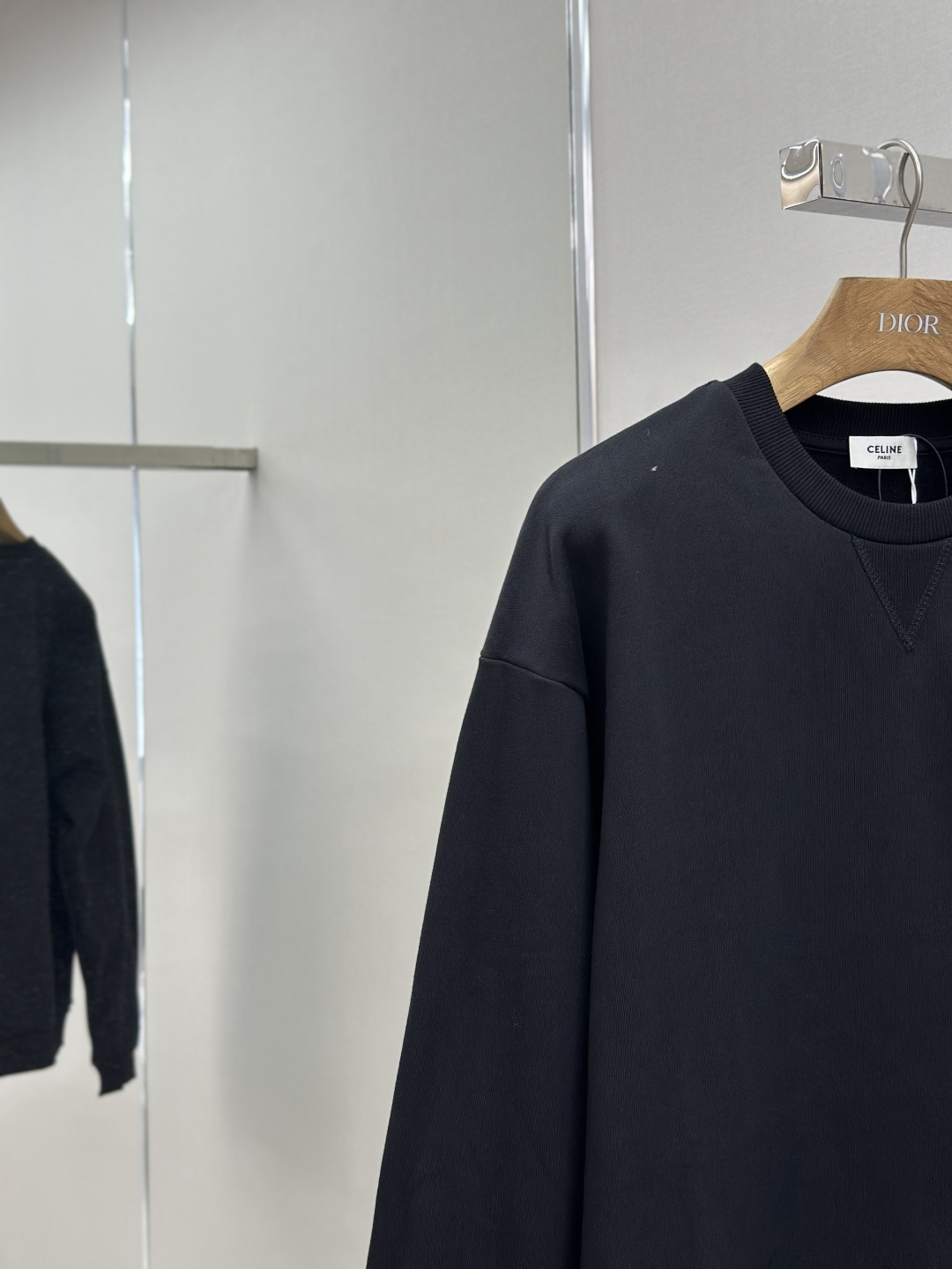 Customized pure cotton soft active ink-dyed hoodie fabric, soft to the touch, comfortable and skin-friendly. Against a deep black background, a triangular space is subtly depicted on the chest, adorned with the iconic Celine Triomphe logo on the front. Extreme simplicity outlines a sophisticated silhouette, making it a dynamic visual focus that showcases taste quietly.