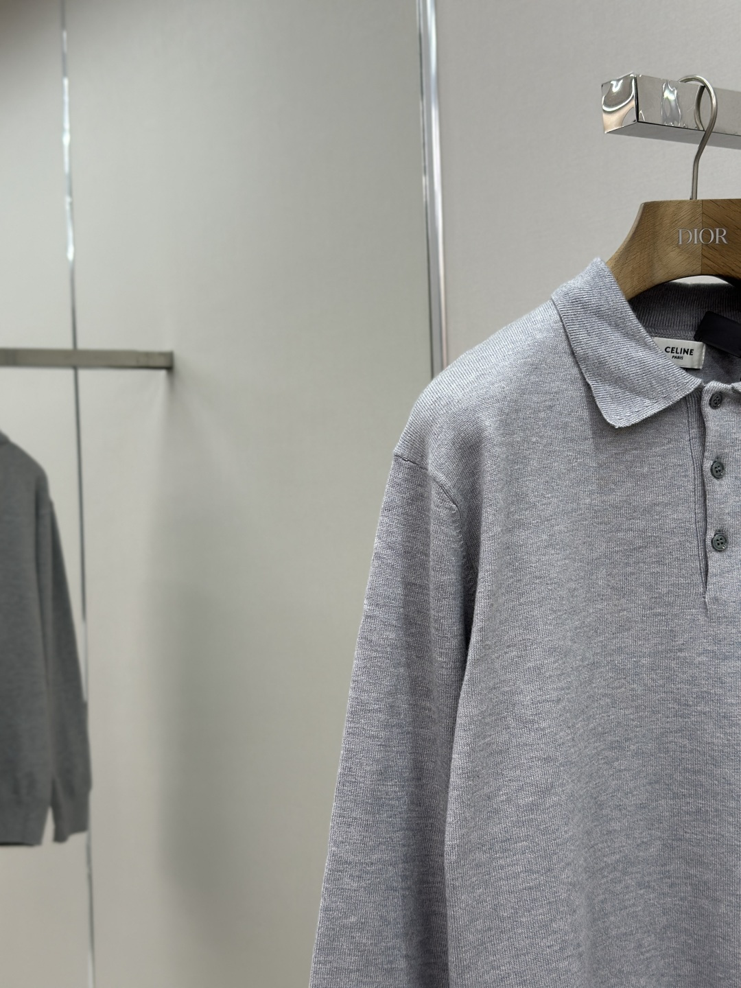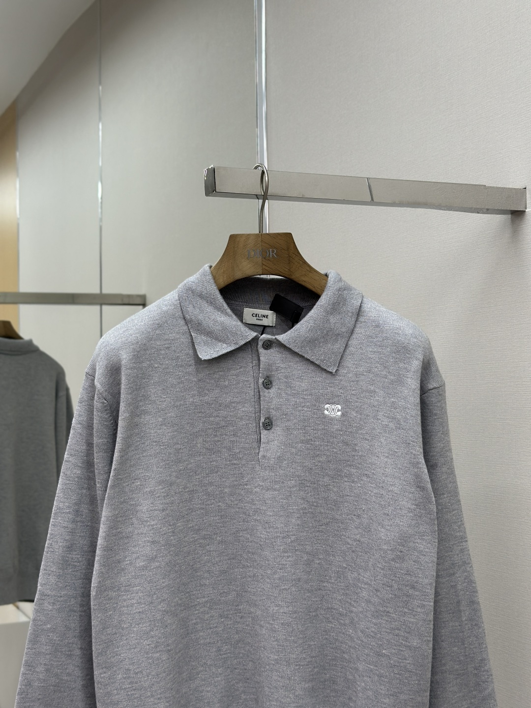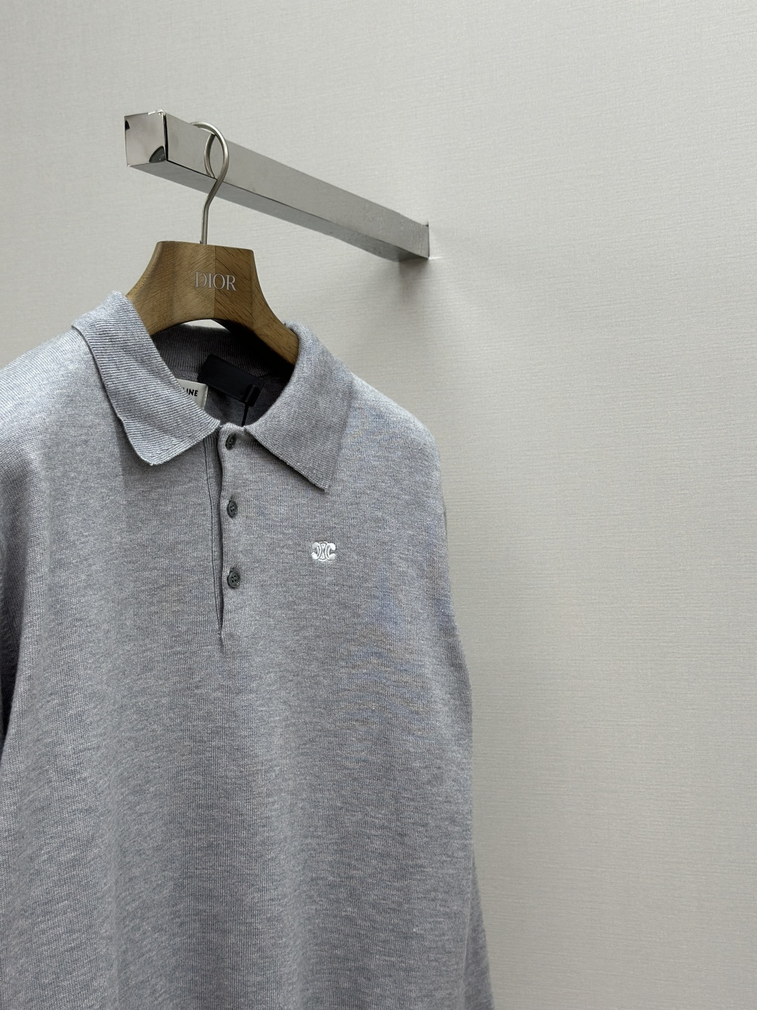 Celine embroidered Triomphe polo shirt. 100% cotton. Classic collar, short sleeves, ribbed trim, mother-of-pearl buttons. Sizes 37-40. Colors: Black, Gray.