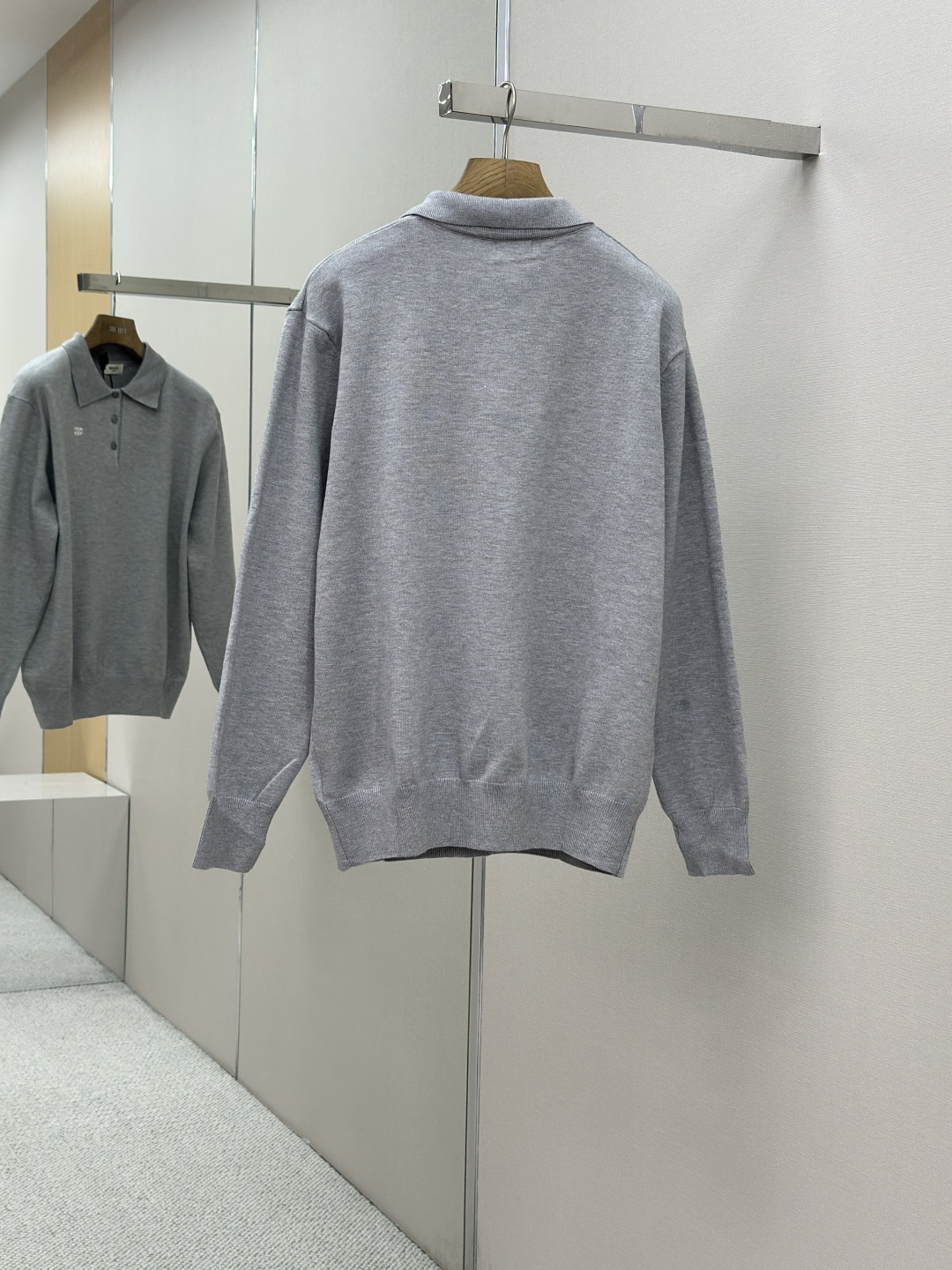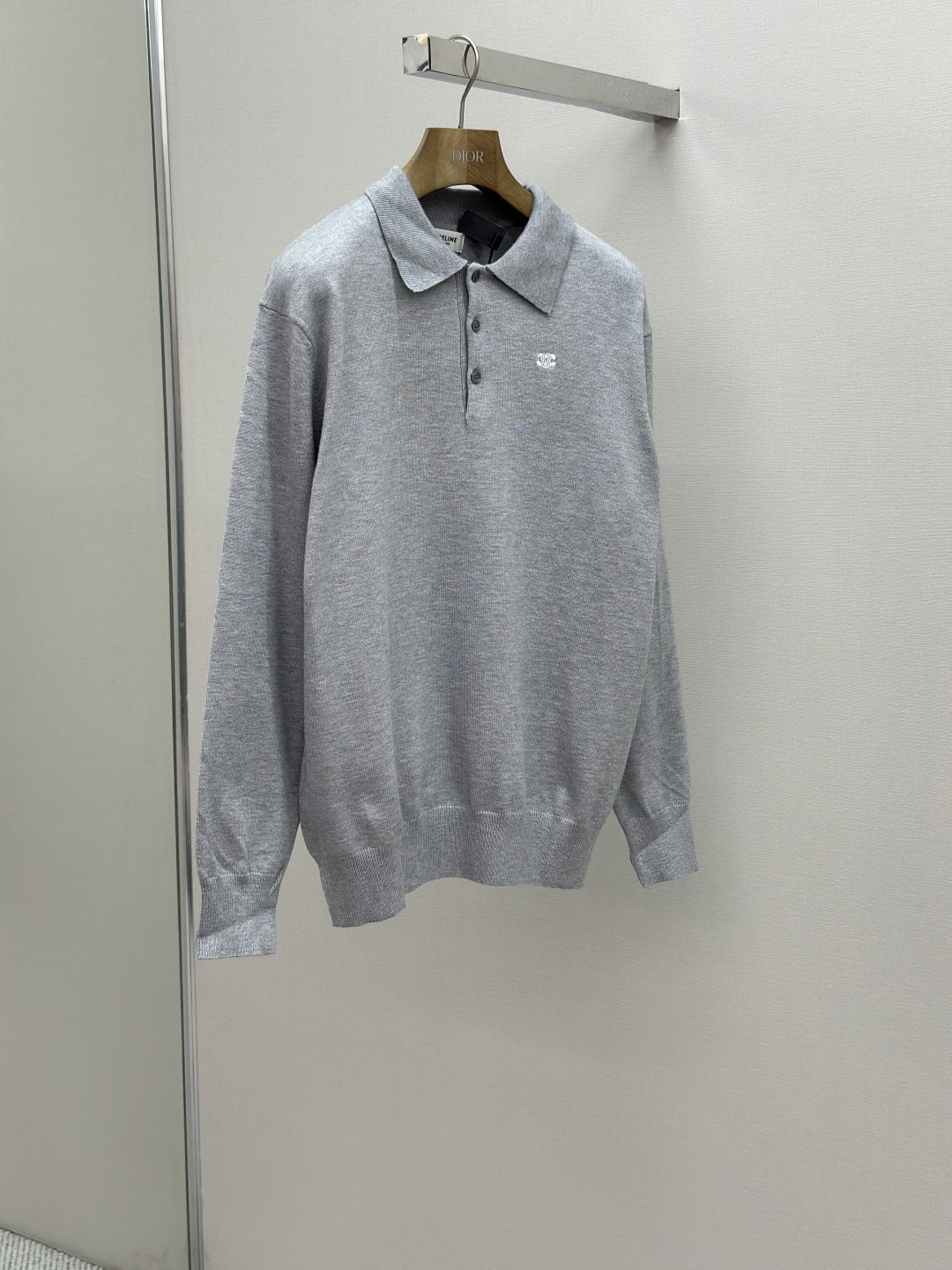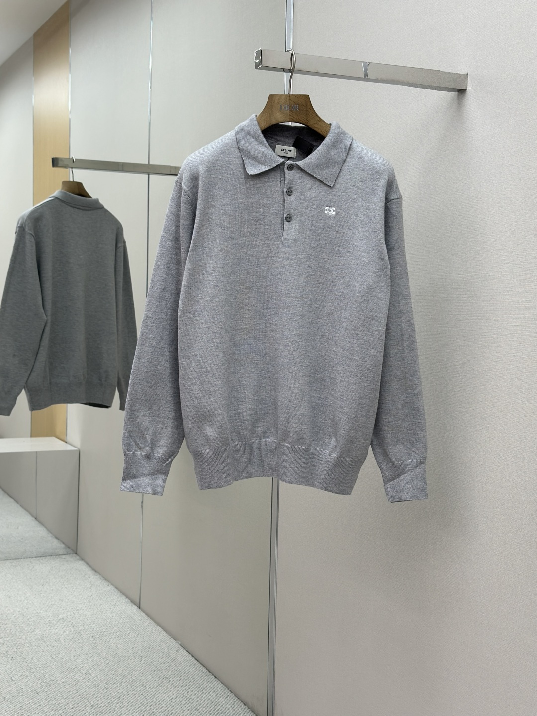 Celine embroidered Triomphe polo shirt. 100% cotton. Classic collar, short sleeves, ribbed trim, mother-of-pearl buttons. Sizes 37-40. Colors: Black, Gray.