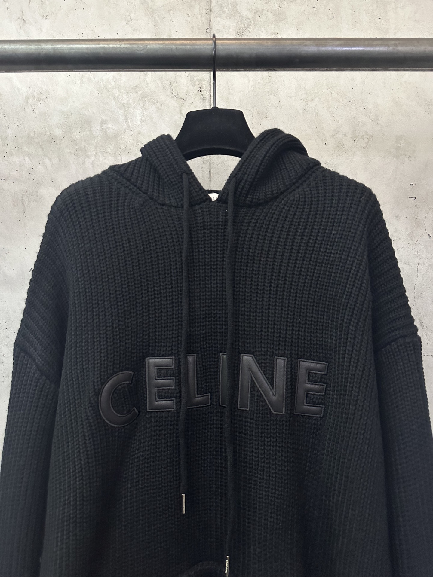 CELINE Embroidered Wool Sweatshirt. Material: 55% merino wool blend. Weight: approx. 1000g. Embroidery: patch technique. Colors: Black. Sizes: S, M, L, XL.
