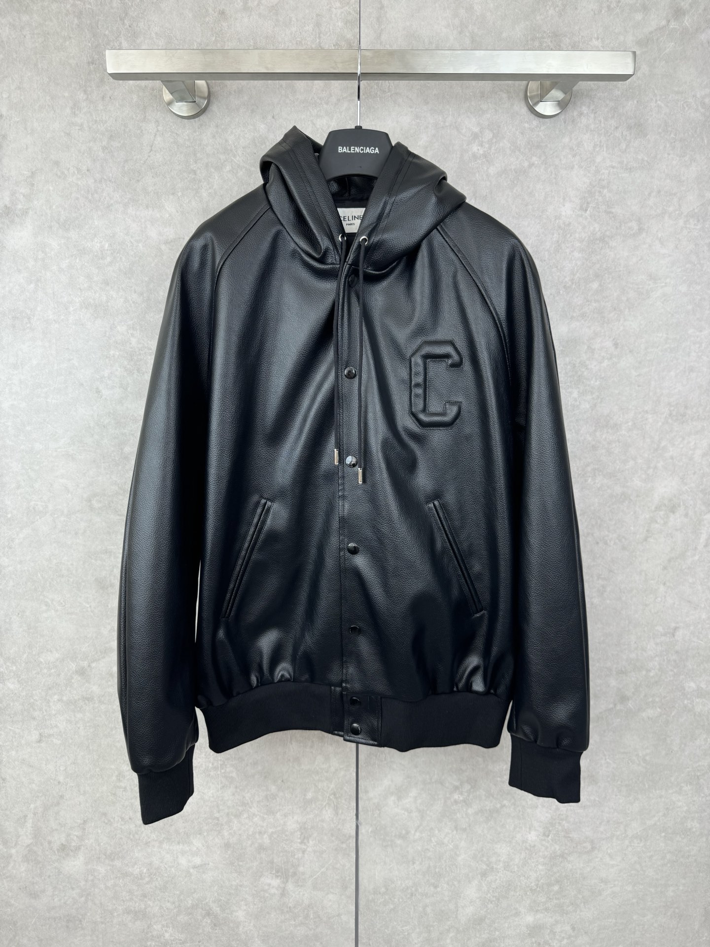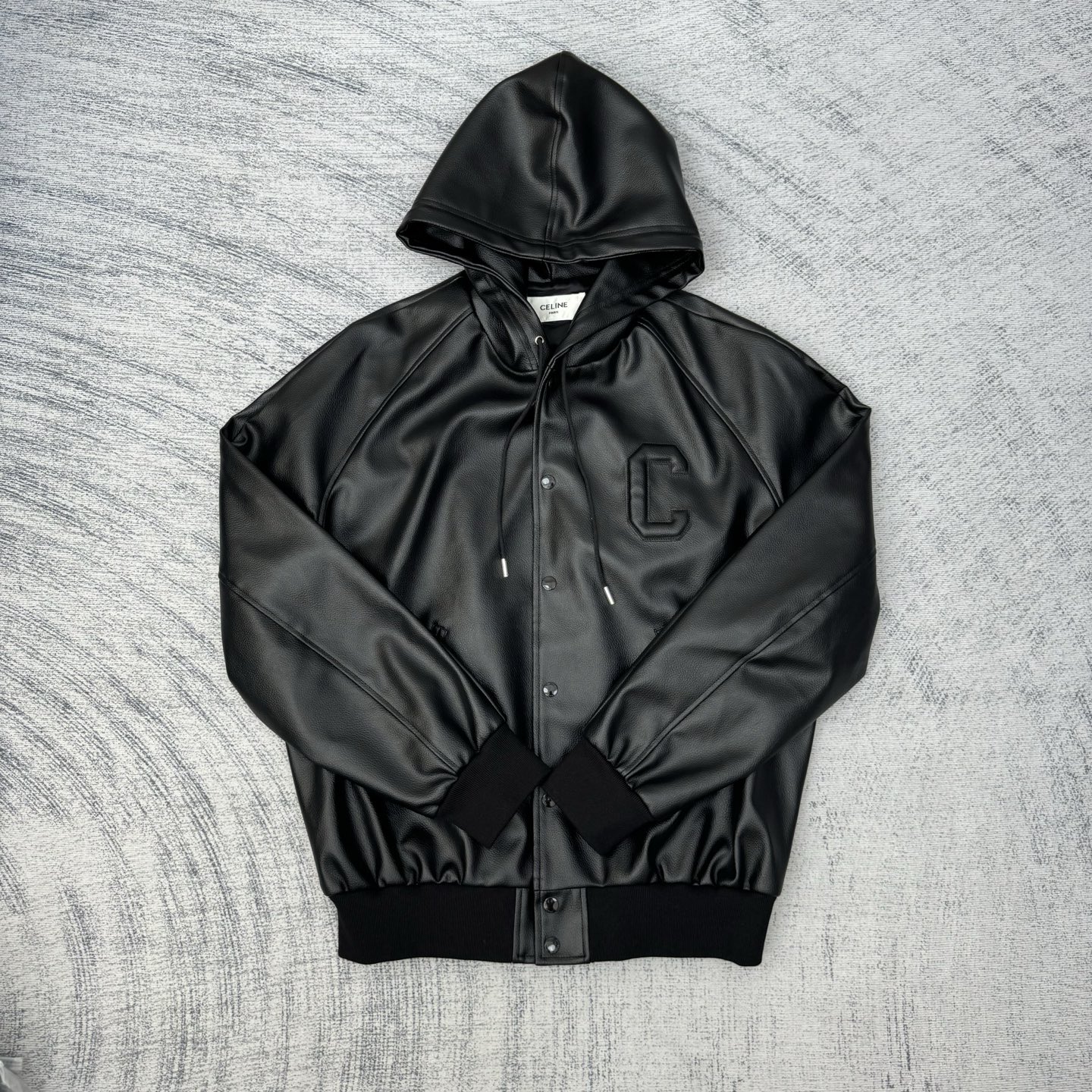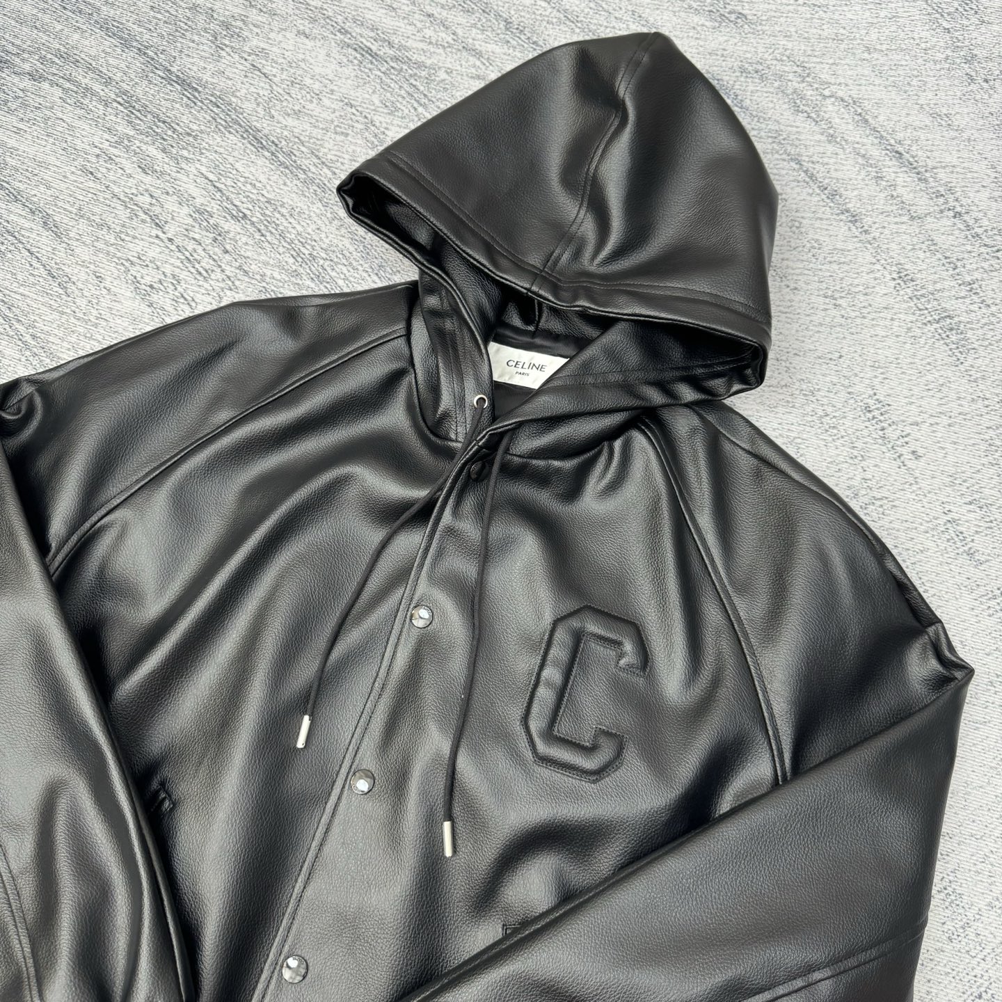 Celine large C embossed leather hooded zip jacket. Sizes 46-52. Custom leather, laser-cut 3D contour, precise tailoring for fit.