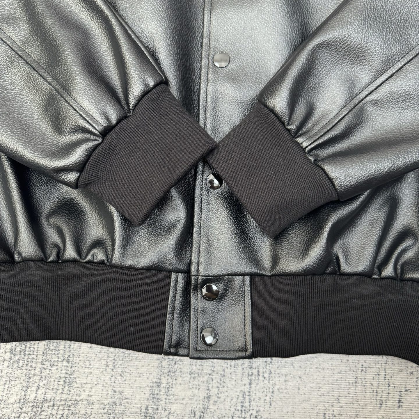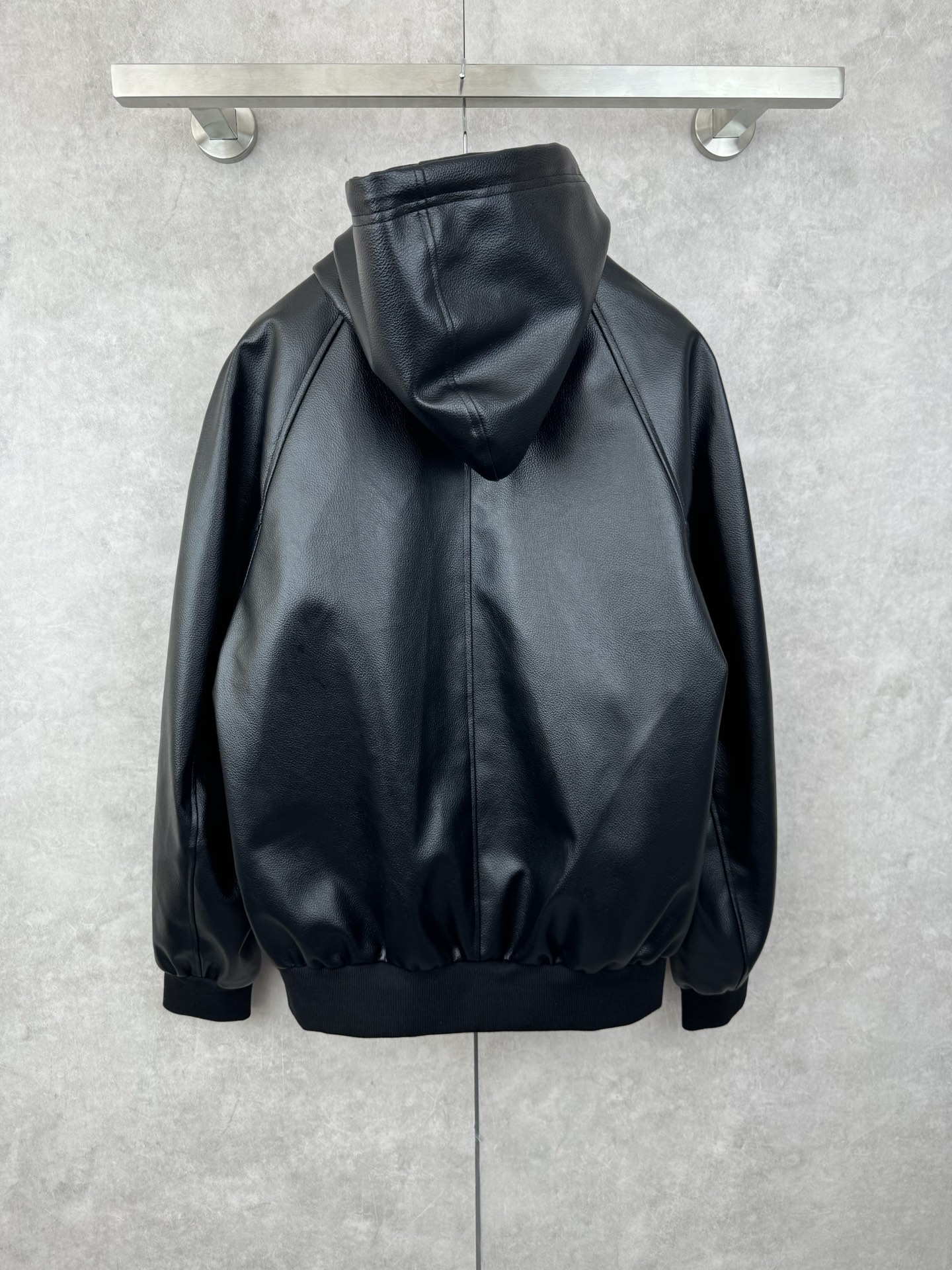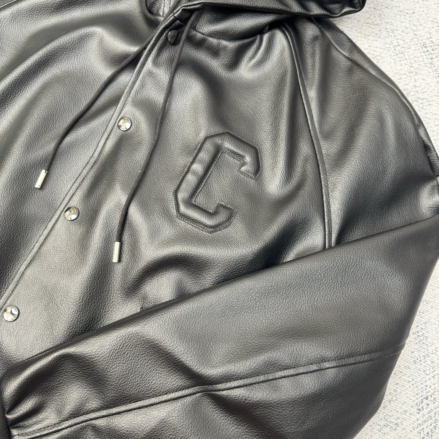 Celine large C embossed leather hooded zip jacket. Sizes 46-52. Custom leather, laser-cut 3D contour, precise tailoring for fit.