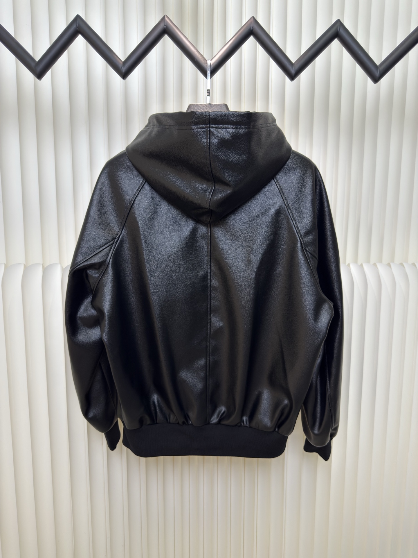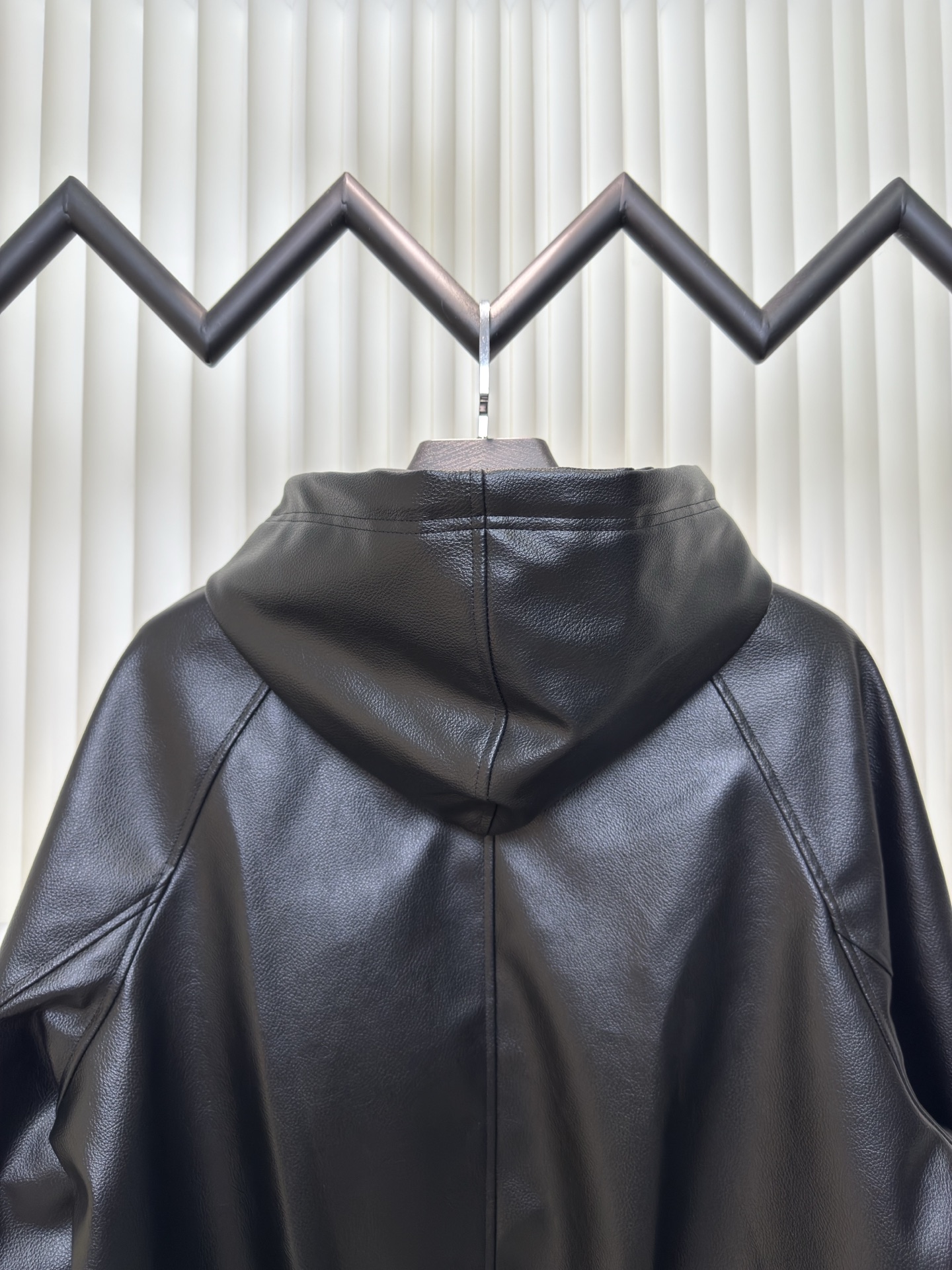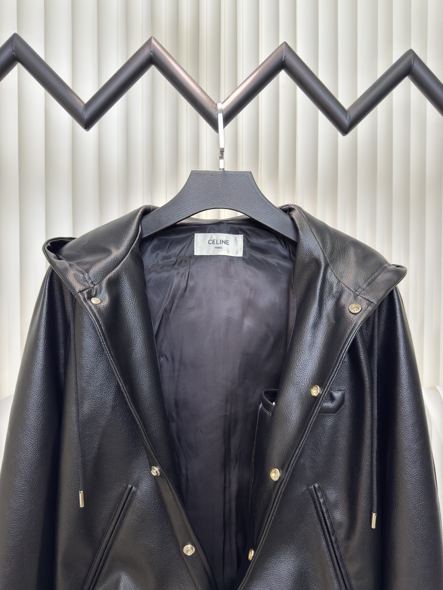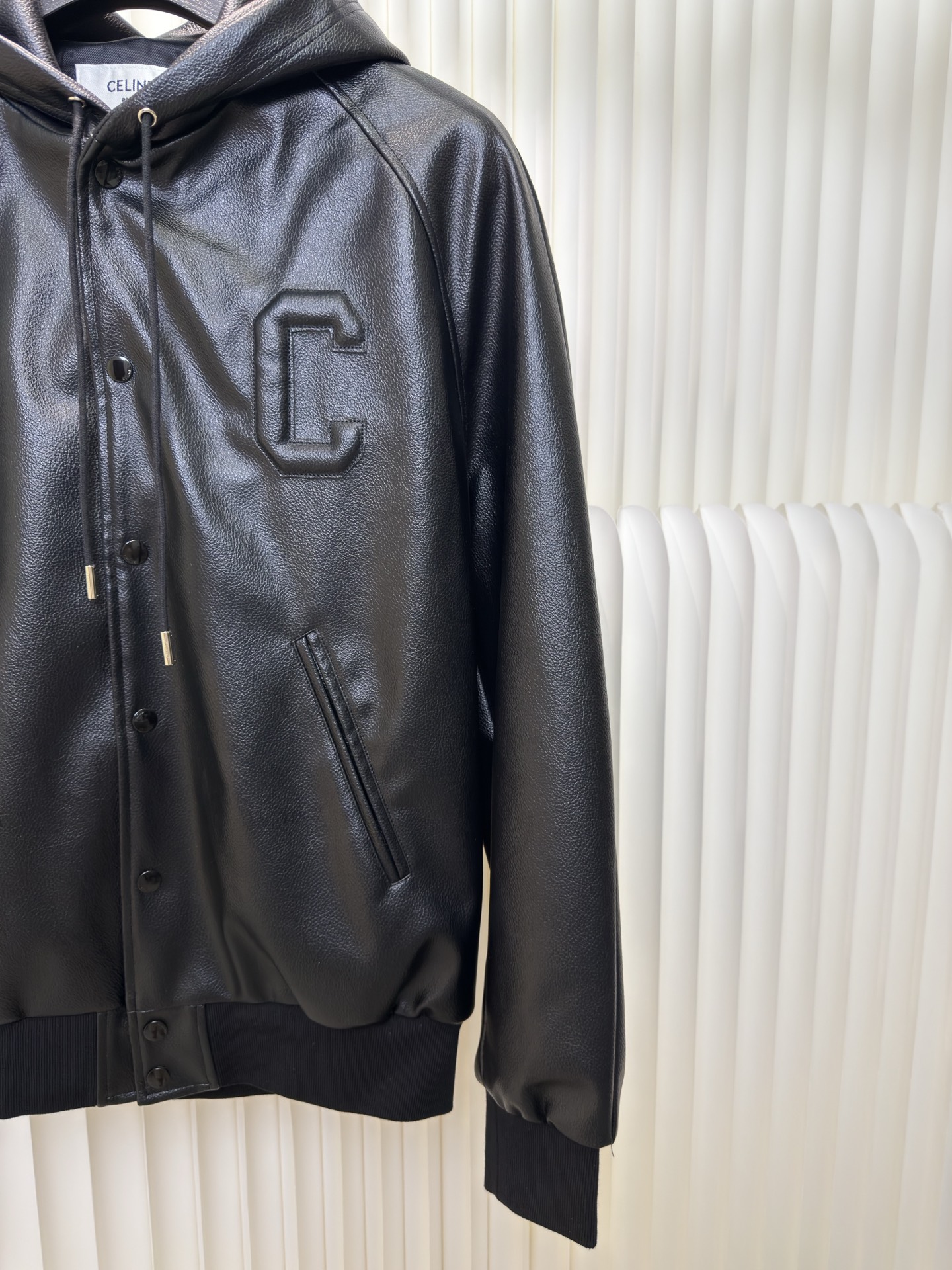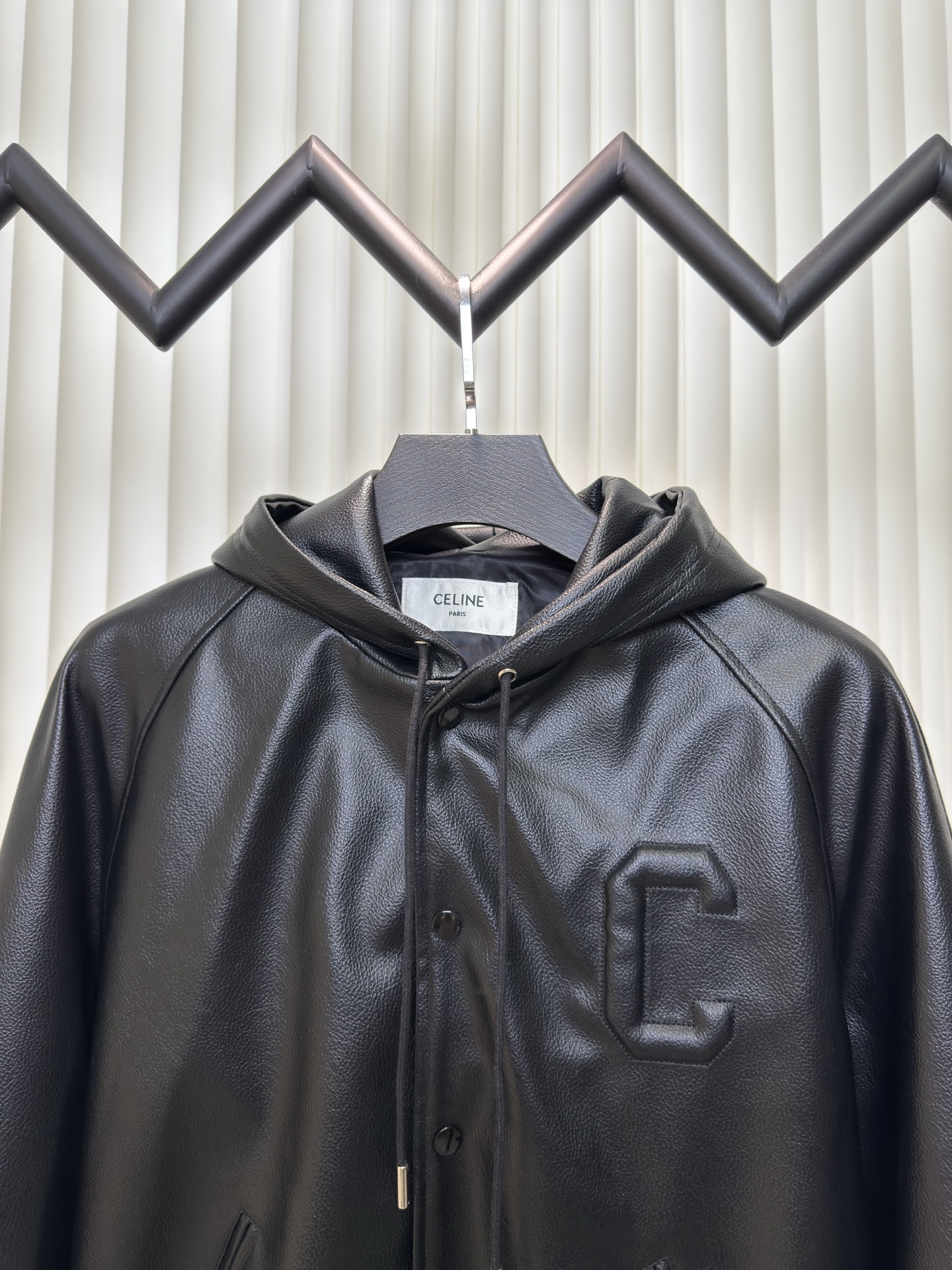 Celine Leather Hooded Jacket Custom premium leather and Tencel blend. Features iconic "C" logo, elegant black tone, and versatile hooded design. Laser-cut 3D contours, precise snap placement, and template-guided pockets. Slim fit. Sizes 46-52.